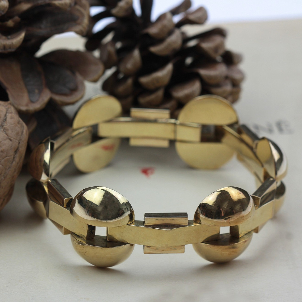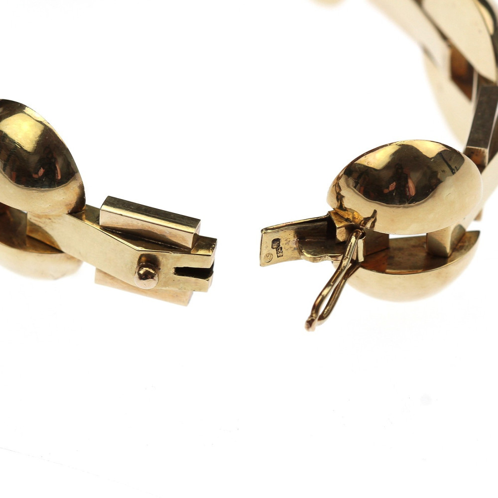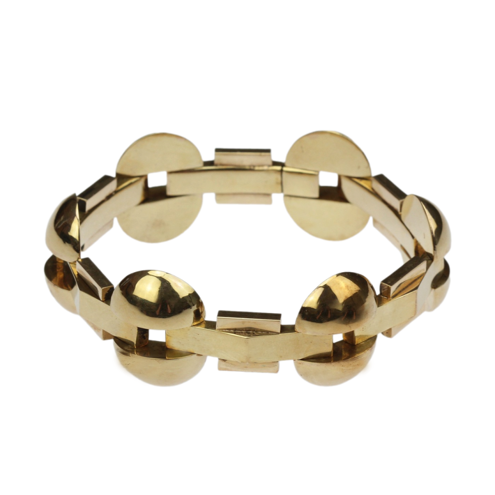 Klasický art deco článkový náramek vyrobený v druhé polovině 40. let 20. století pod družstvem zlatníků Karat v Brně. Jednotlivé duté 14karátové články ze žlutého zlata střídají obdélné a zaoblené prvky, které jsou na povrchu leštěné a lehce profilované. Značeno prvorepublikovým puncem "lvíček" užívaným v Československu mezi lety 1929-1949, ryzostním...