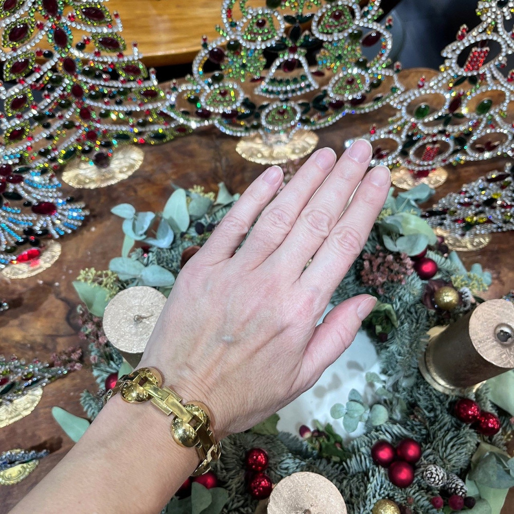 Klasický art deco náramek s kruhovými články ze žlutého, částečně dutého 14karátového zlata, vyrobený ve 30.–40. letech 20. století. U jazýčkového zapínání se nachází pojistné očko. Šperk je značen puncem „lvíček“, dále ryzostním číslem a mistrovskou značkou „BT“.
