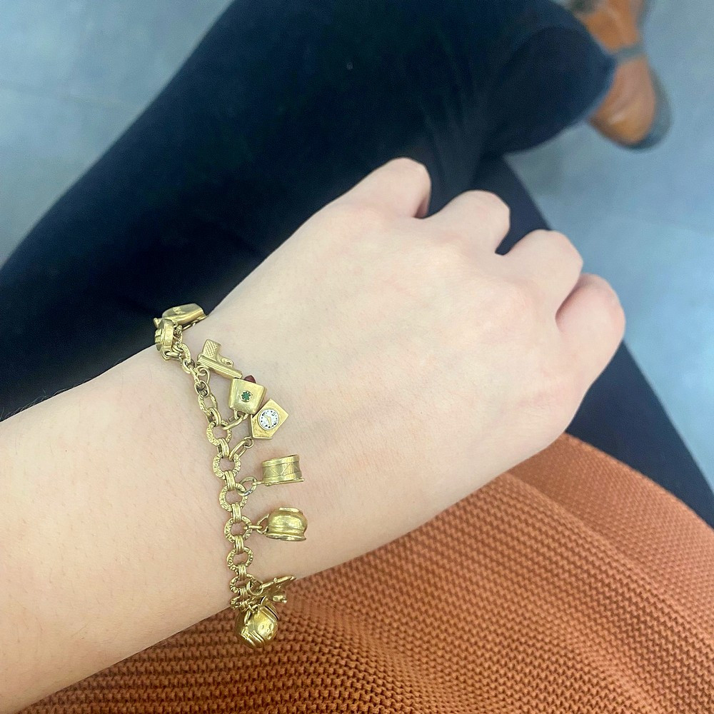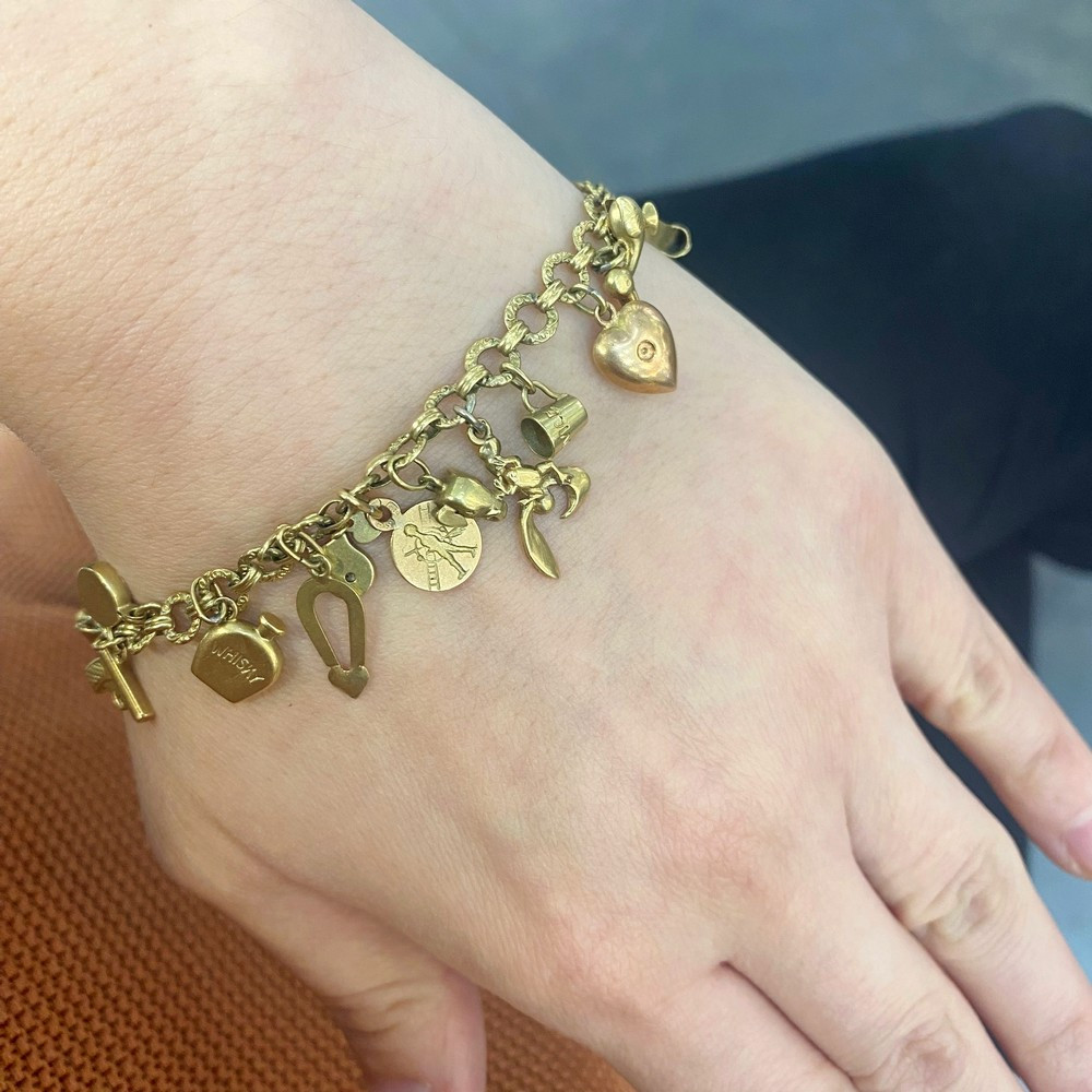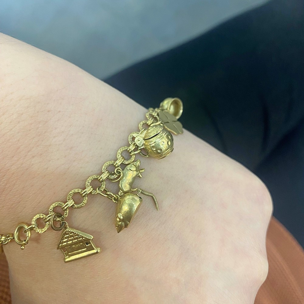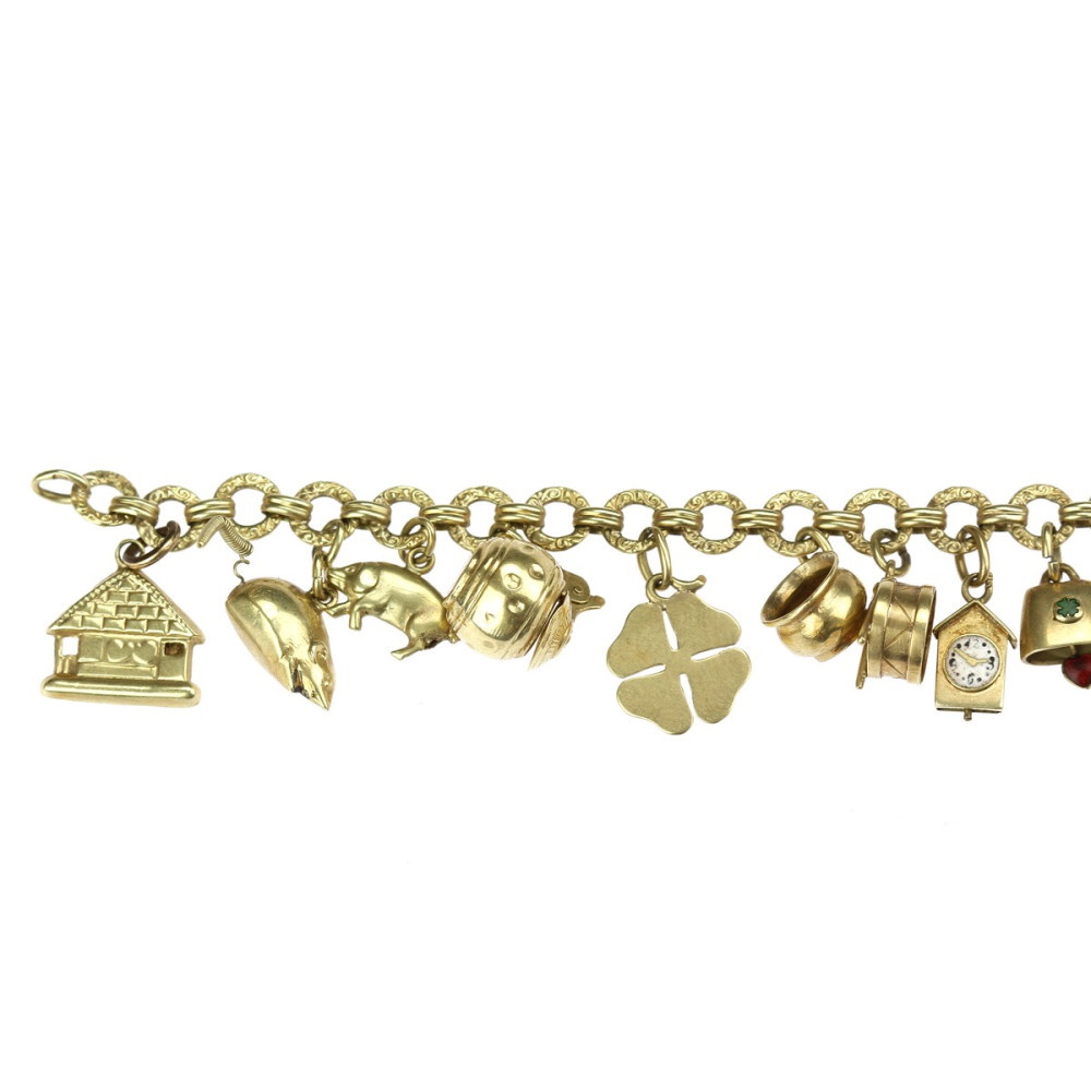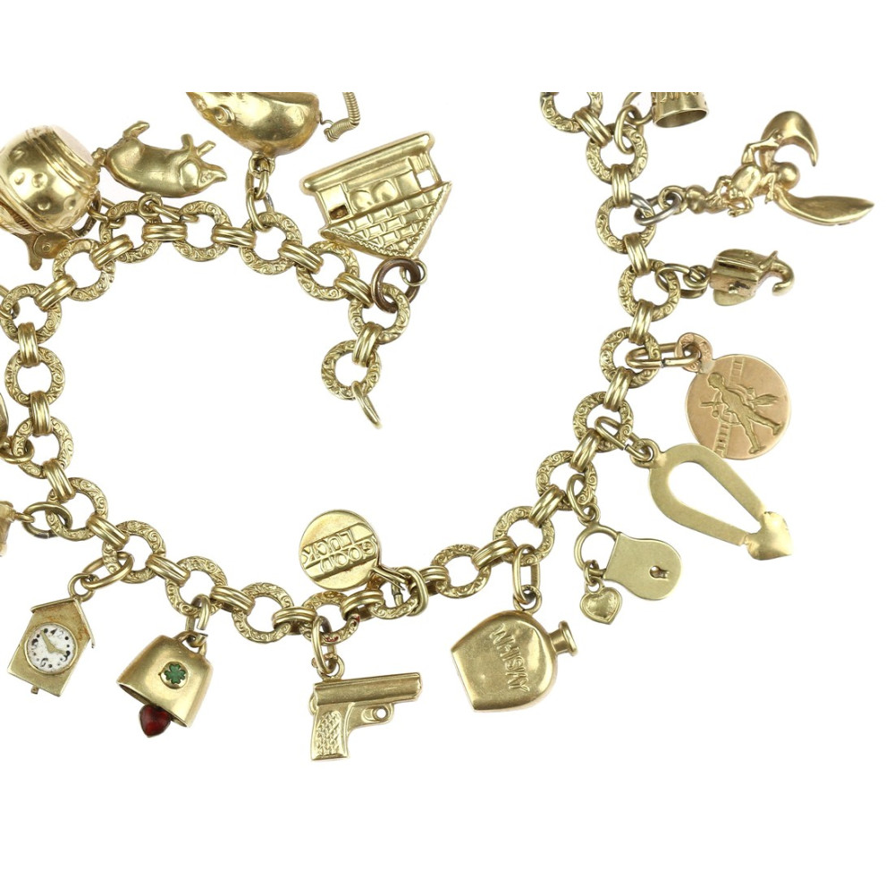 Prvorepublikový náramek, tzv. „žebrák“, s 22 přívěsky, mezi nimiž najdeme např. plastickou myšku, prasátko, korbel, nočník, hodiny a zvoneček zdobené smaltem, dále zámek, chaloupku, čtyřlístek, pistoli, láhev whisky, žabku na listu, hlavu slona, srdce a kominíka z růžového zlata, pantoflíčky, míč, ptáčka či pohárek s nápisem „Luhačovice“ a medailonek „Good luck“. Očka náramku jsou oboustranně reliéfně zdobena. Materiálem je žluté čtrnáctikarátové zlato, značené československým puncem „lvíček“.