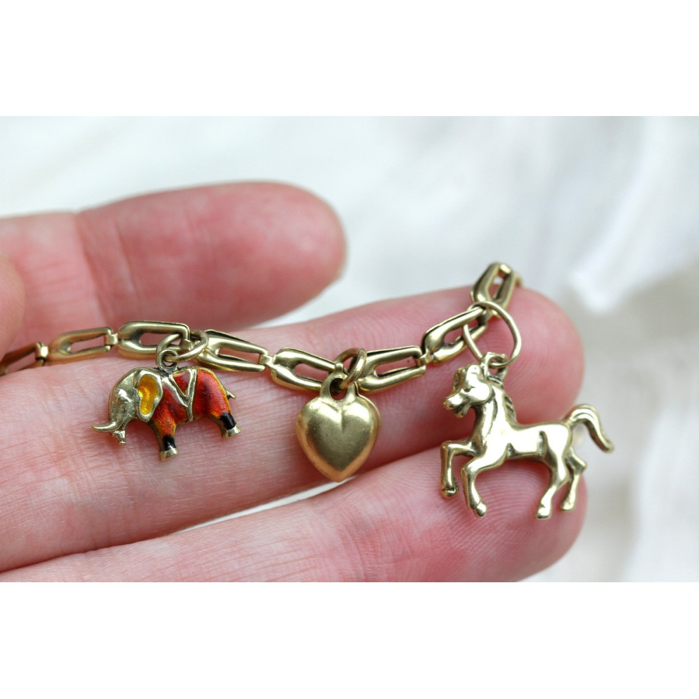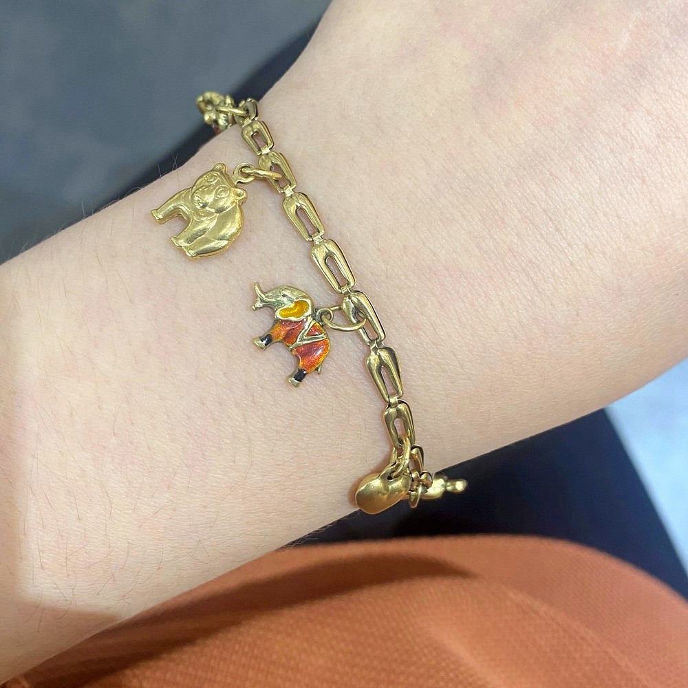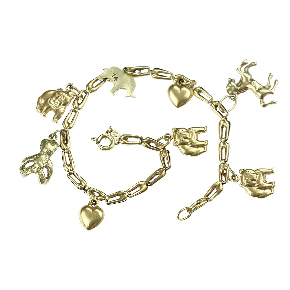 Žlutozlatý náramek s osmi přívěsky - medvědy, srdíčky, koníkem a slonem.