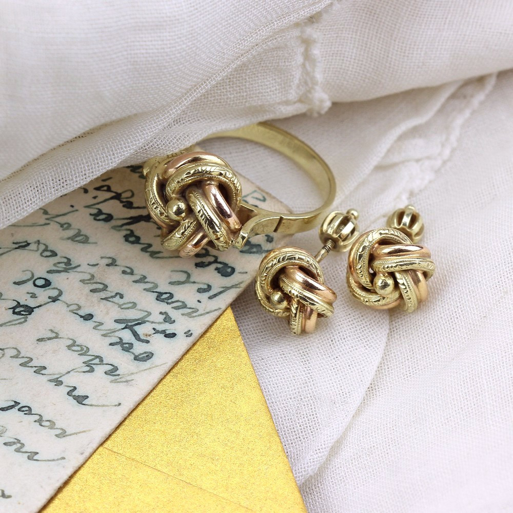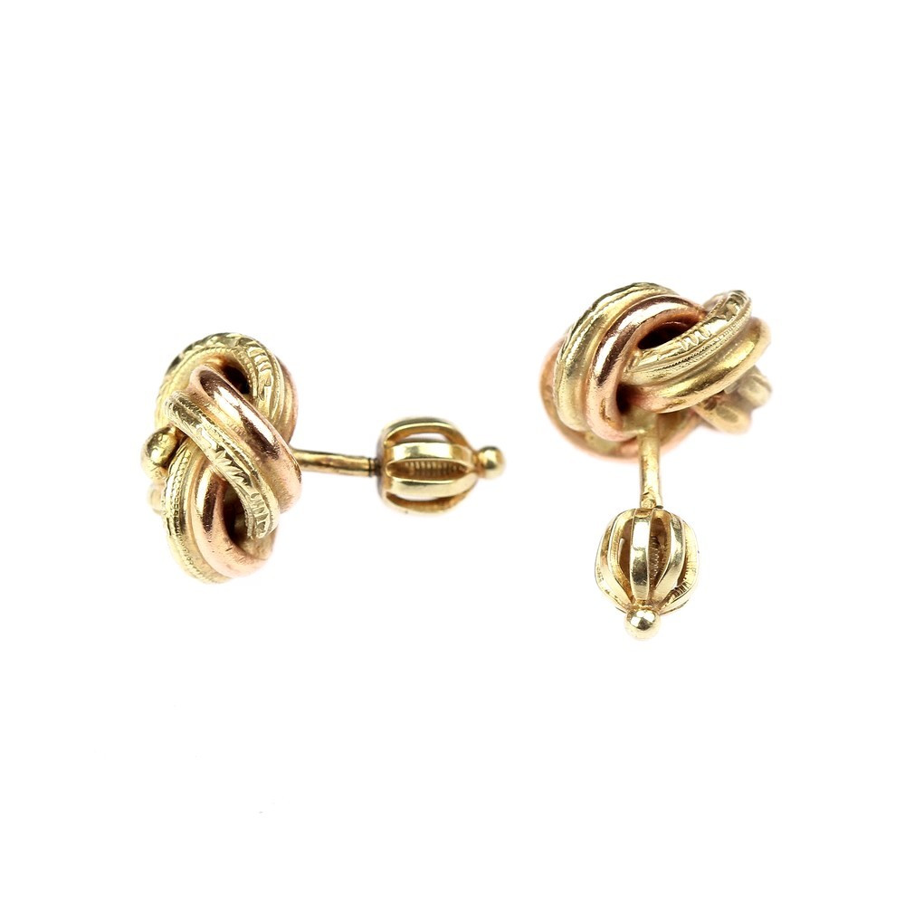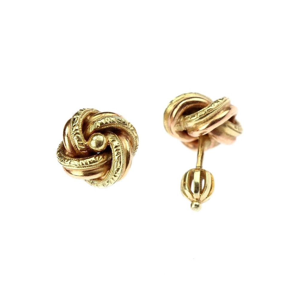 Náušnice ze žlutého a růžového 14karátového zlata ve tvaru větších uzlíků (průměr 1,1 cm) mají zapínání na šroubovací balónky. Růžové zlato je zcela hladké, žluté je celoplošně zdobeno dekorem.
