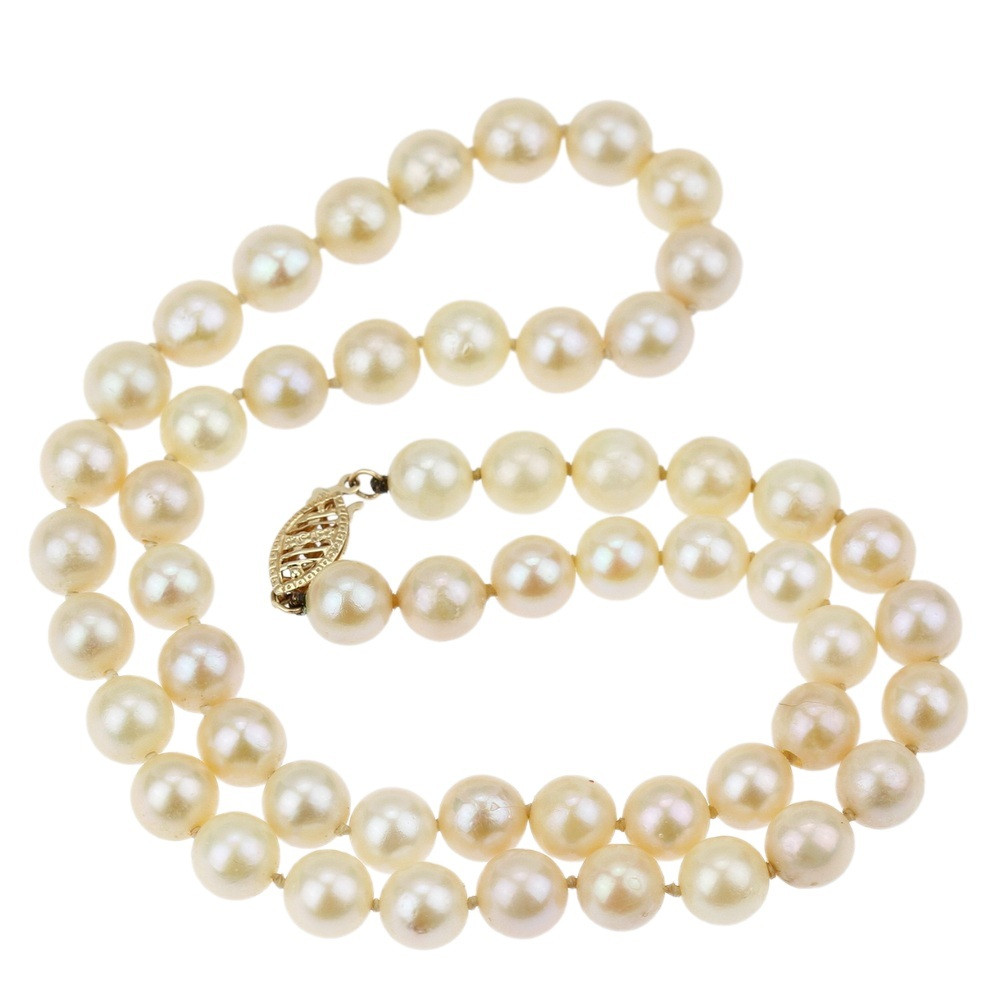 Šňůra kultivovaných sladkovodních perel nazlátlé barvy o průměru cca 7 mm.