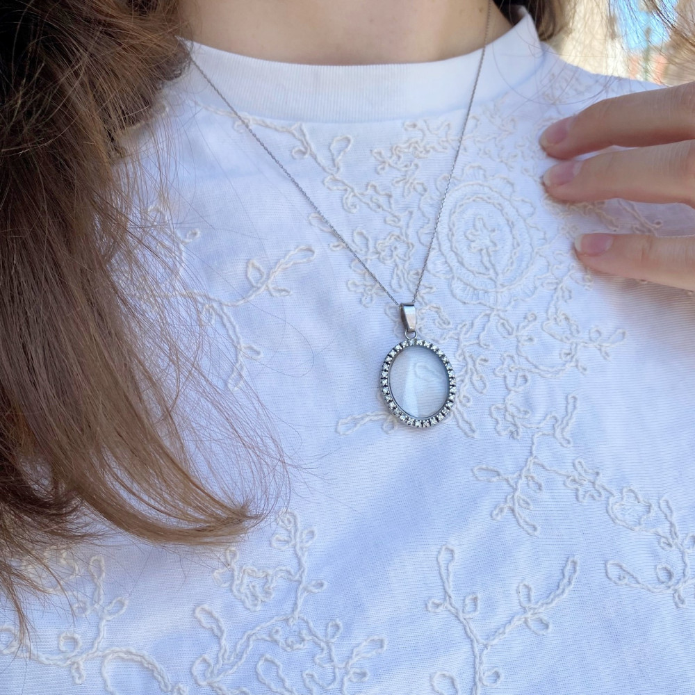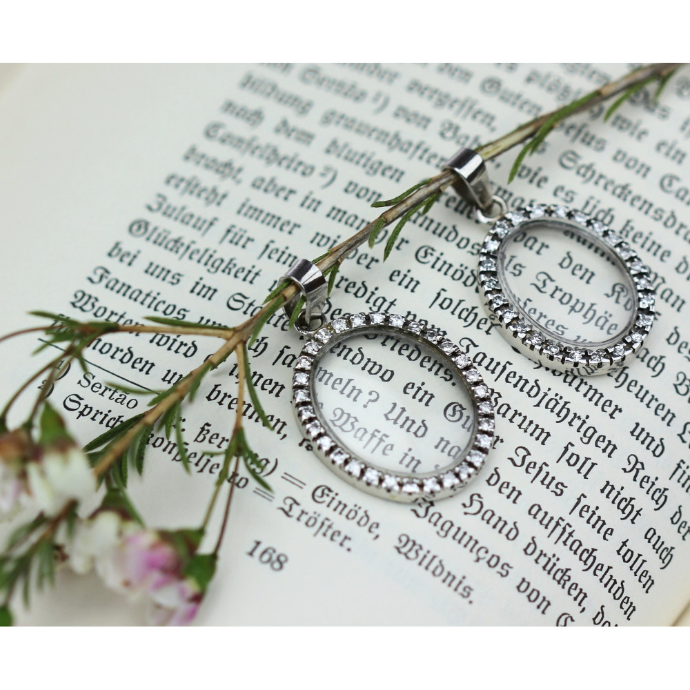 Oválný přívěsek vyrobený z bílého 14karátového zlata. Rámeček tvoří 24 přírodních diamantů jednoduchého brusu, každý o váze 0,015 - 0,020 ct. Barva diamantů je H a čistota VVS-VS. Střed přívěsku má vsazené sklíčko, zadní strana je otevřená.