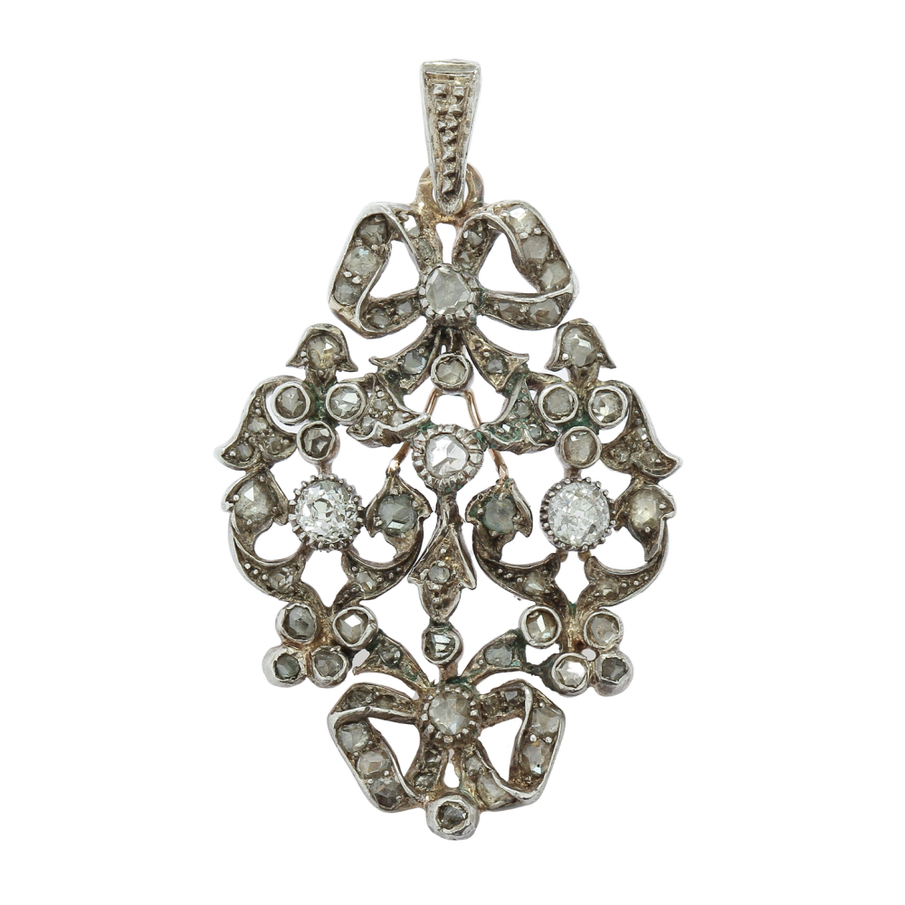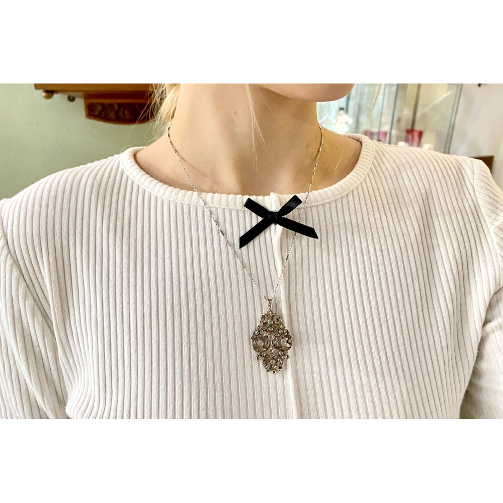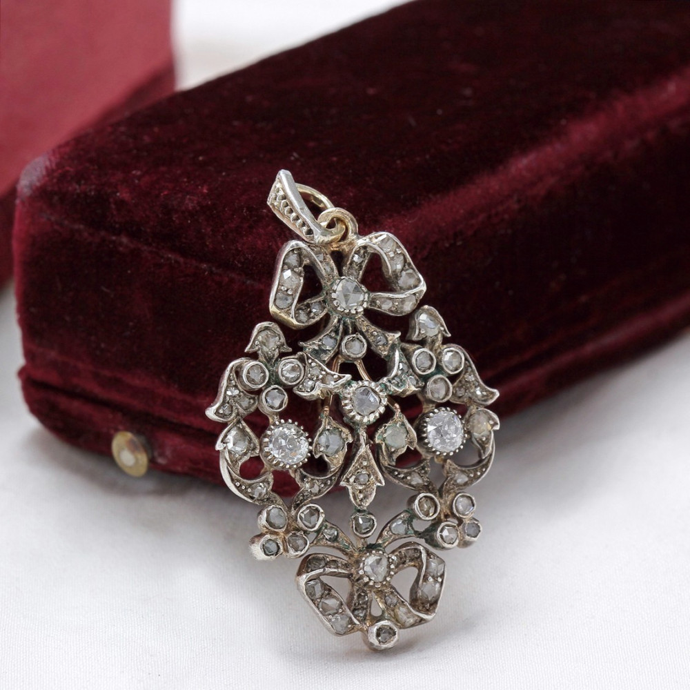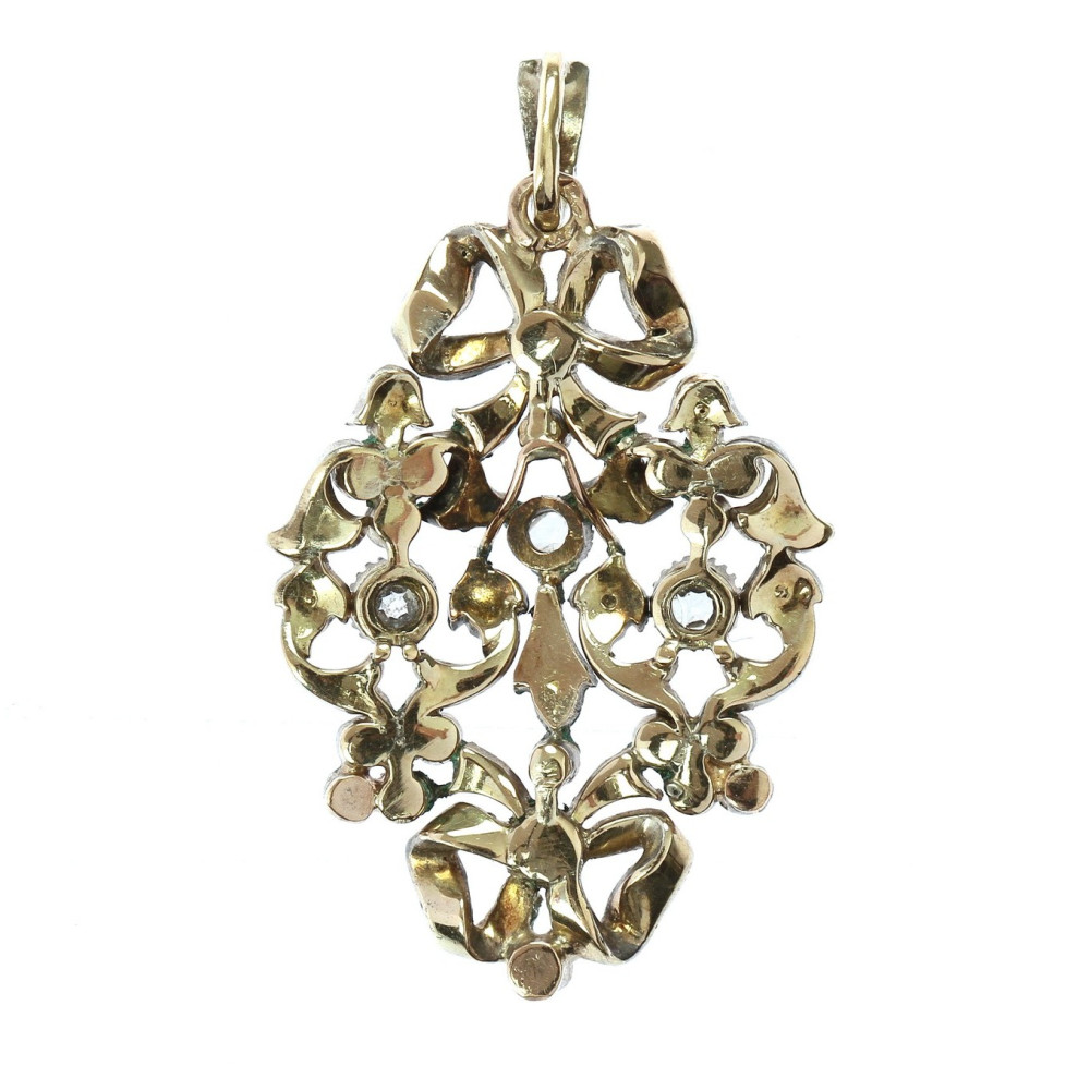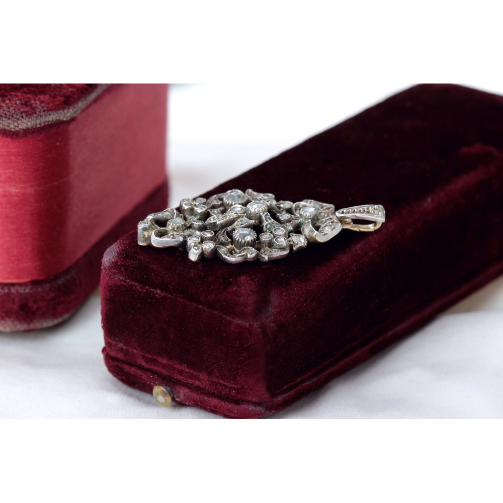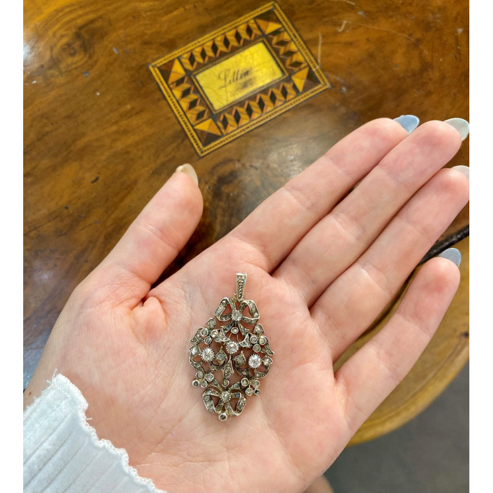 Elegantní přívěsek zhotovený převážně ze zlata, vrchní část s kameny je ze stříbra. Do bohatého vzoru klenotník zasadil přírodní diamanty o celkové váze 1,50 ct. Dva diamanty starého briliantového brusu vážící 0,16 ct a 0,14 ct mají barvu v rozmezí F-G a dosahují čistoty VS2-SI. Ostatní diamanty routového brusu o různých velikostech pokrývají celý povrch šperku.