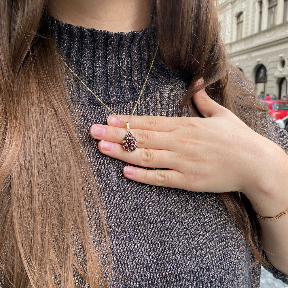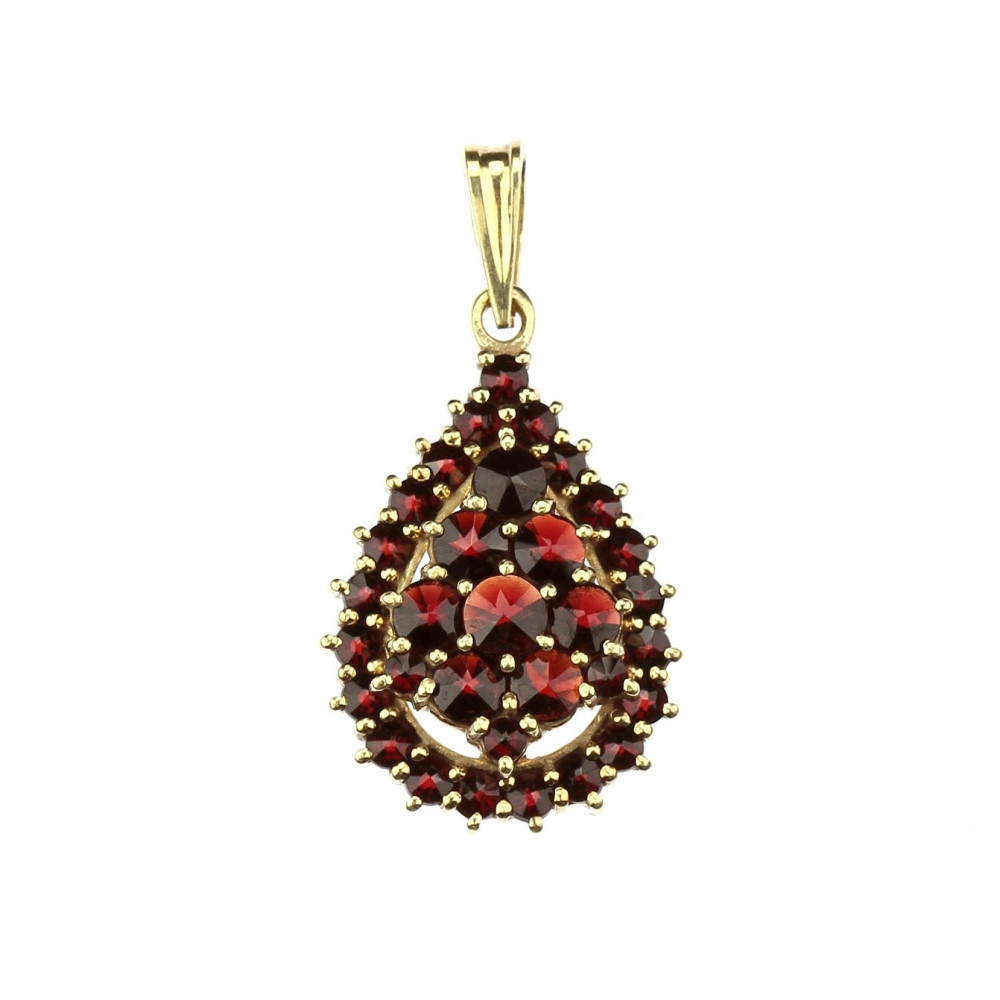 Přívěsek ve tvaru kapky zhotovený ze žlutého 14karátového zlata. Povrch přívěsku je posázený přírodními českými granáty a almandiny. Označen československým puncem "čejka" používaným mezi lety 1949-1992, ryzostním číslem "585" a výrobní značkou Granátu Turnov.
