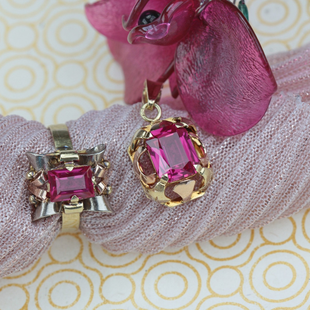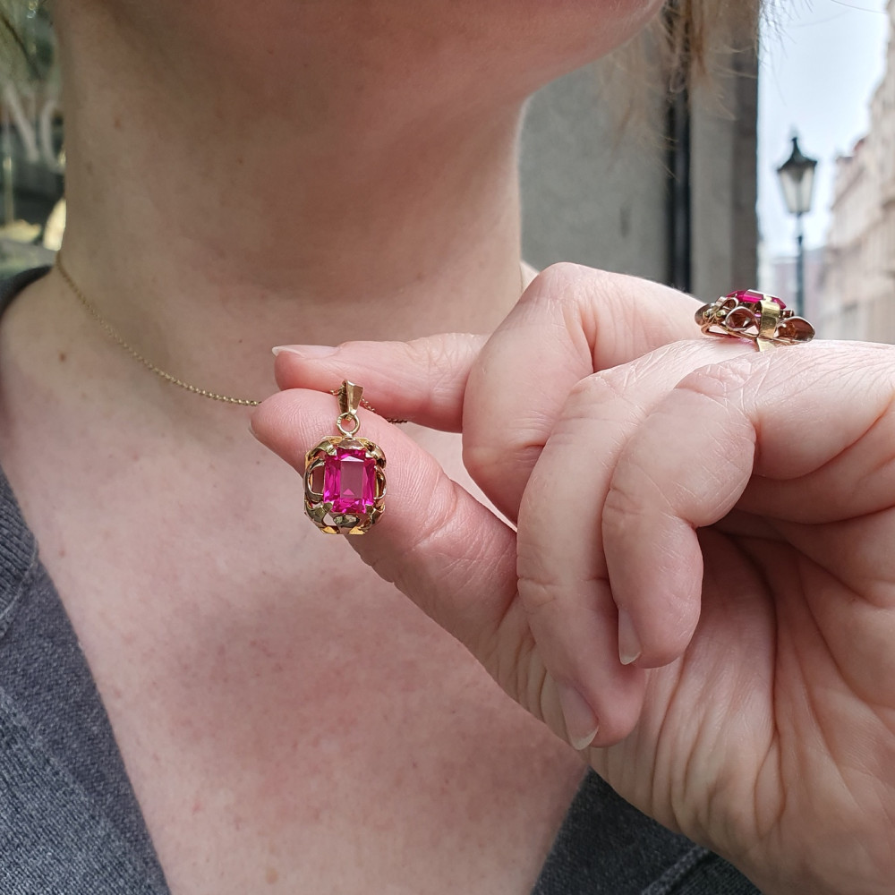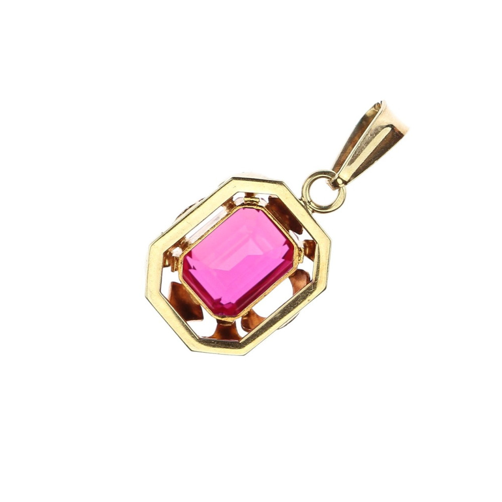 Drobný přívěsek ze žlutého a růžového 14karátového zlata má zasazený syntetický rubín.
