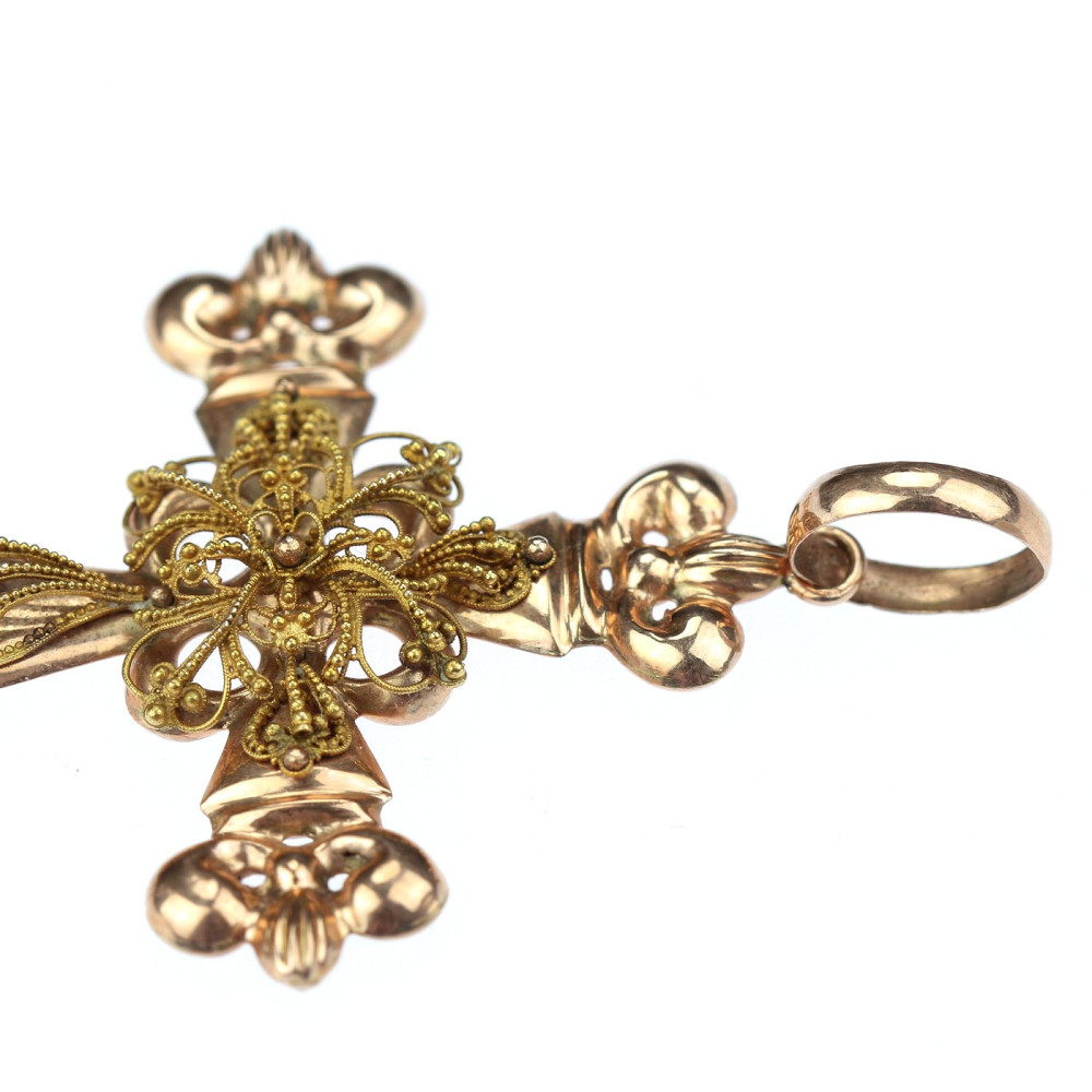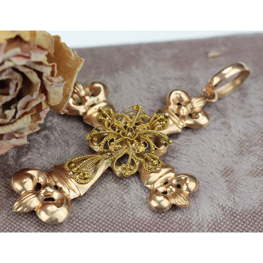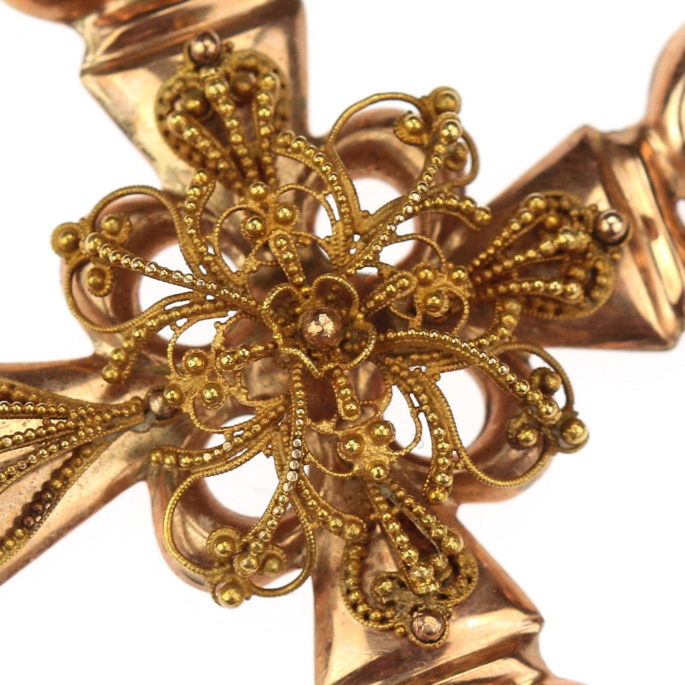 Výrazný náprsní kříž zhotovený z dutého růžového zlata má ve svém středu ornamentální apliku ze zlata žlutého, zdobenou technikou granulace. Materiálem je 14karátové zlato (580/1000), puncované rakousko-uherskou "liškou" ve Vídni v poslední třetině 19. století.
