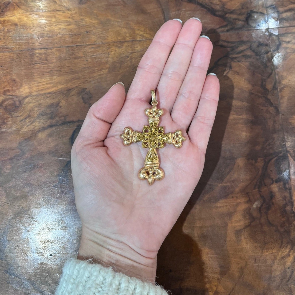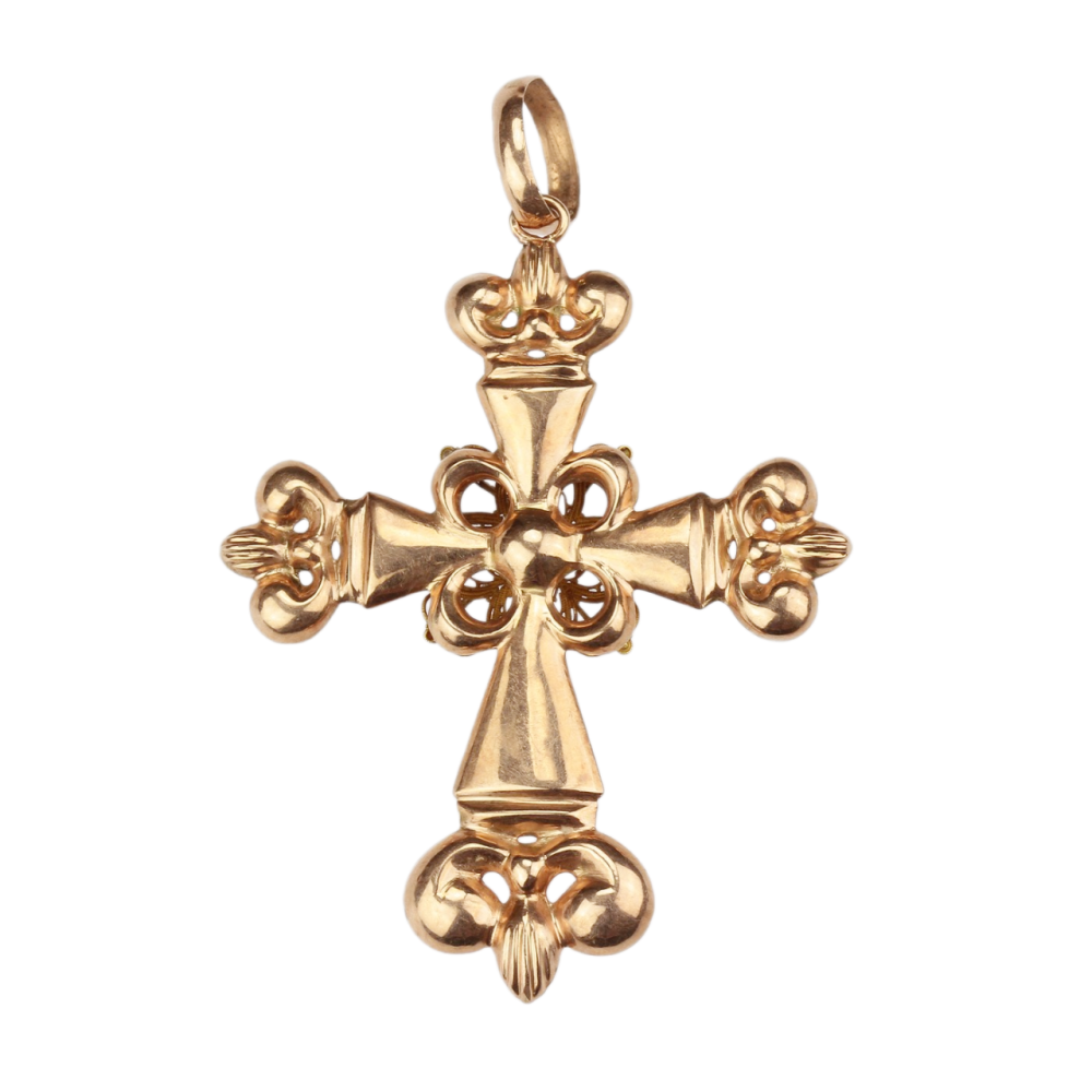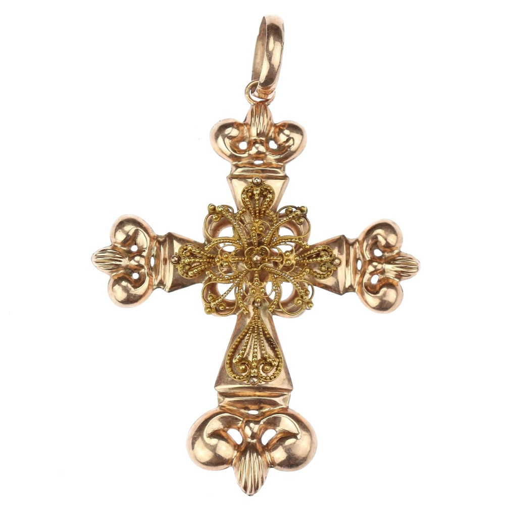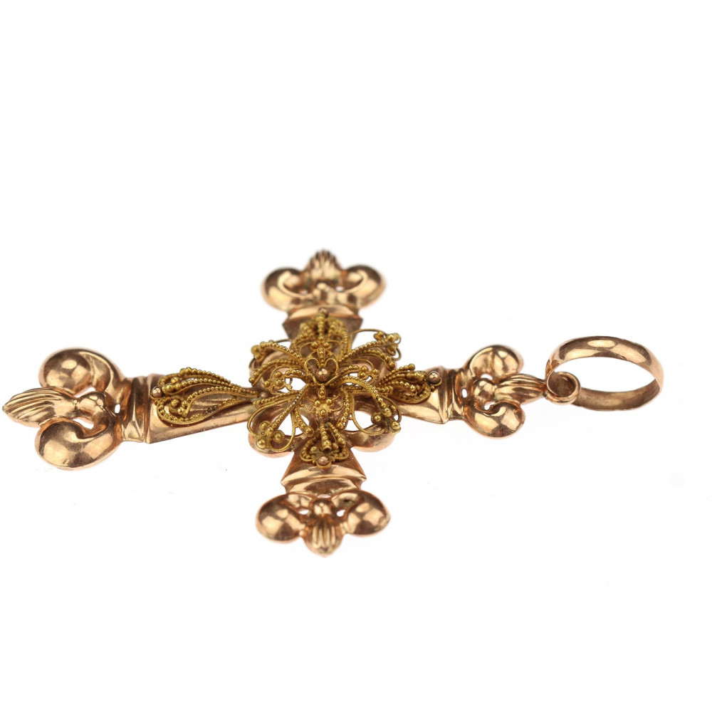 Výrazný náprsní kříž zhotovený z dutého růžového zlata má ve svém středu ornamentální apliku ze zlata žlutého, zdobenou technikou granulace. Materiálem je 14karátové zlato (580/1000), puncované rakousko-uherskou "liškou" ve Vídni v poslední třetině 19. století.