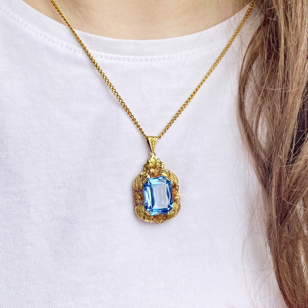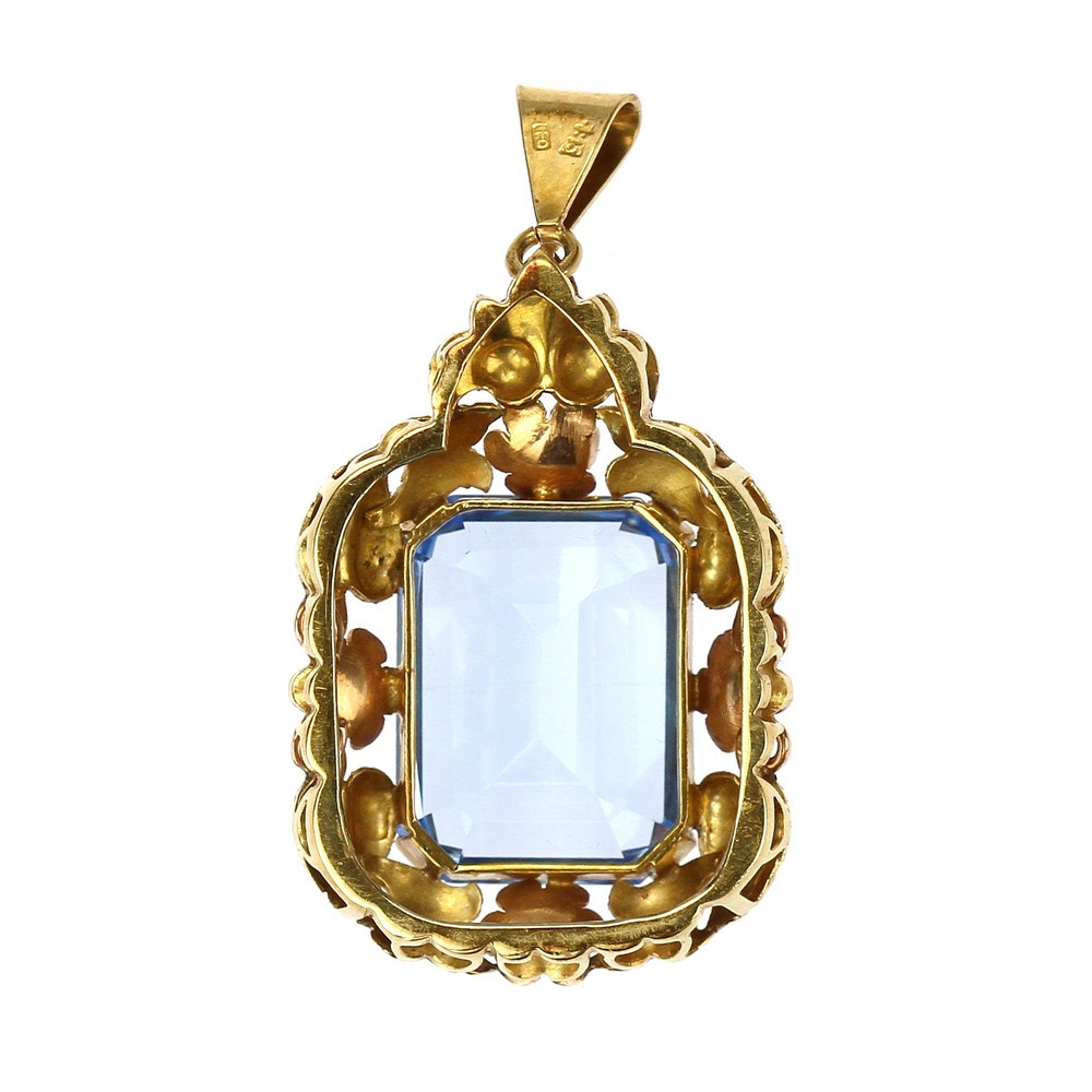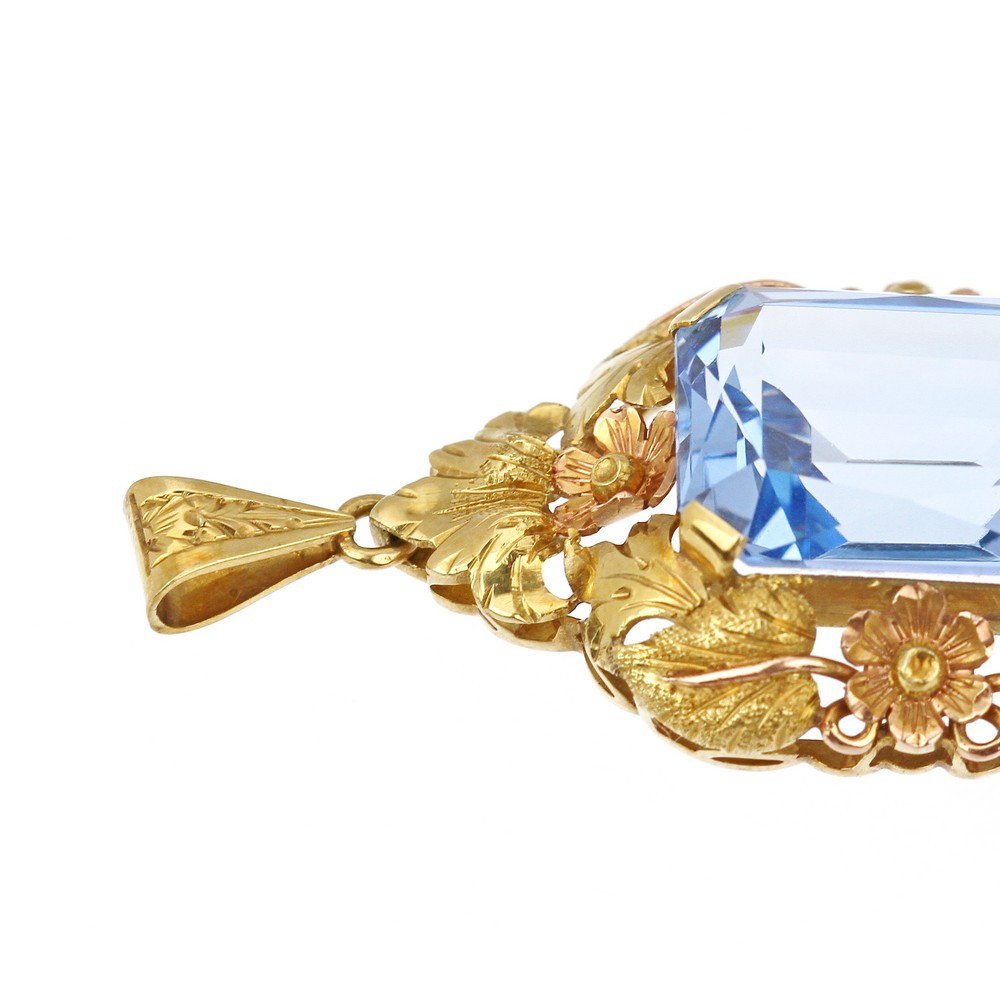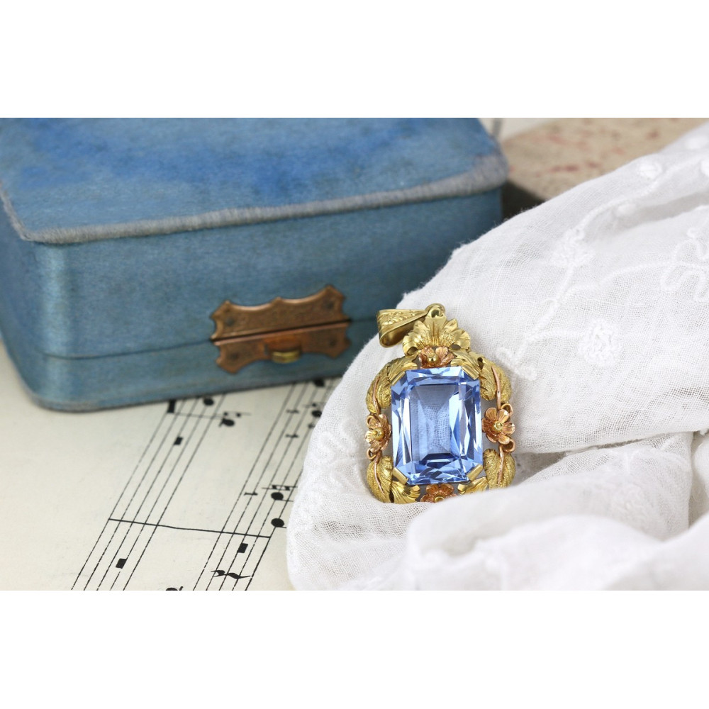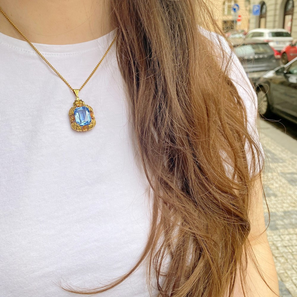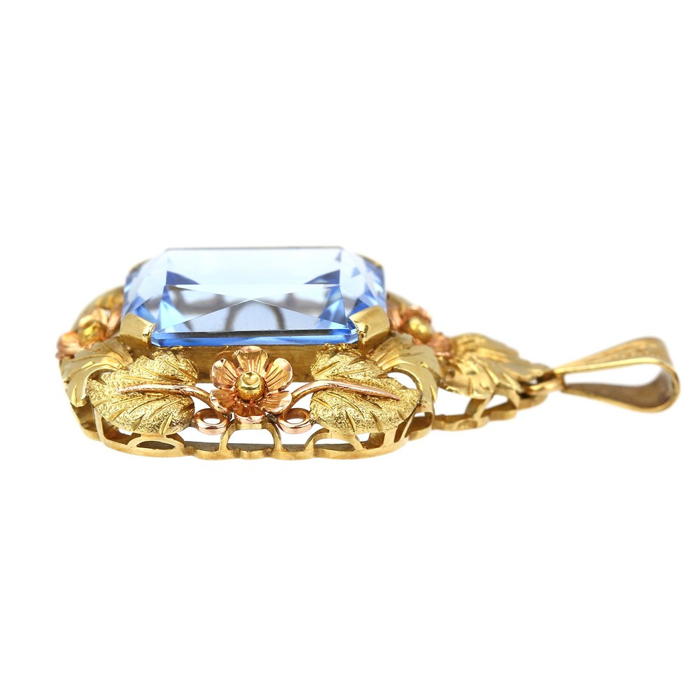 Přívěsek vyrobený ve 30. - 40. letech 20. století v Československu ze žlutého 14karátového zlata. V centru šperku je vsazen světle modrý syntetický spinel, kolem kterého zlatník vymodeloval široký rámeček tvořený z lístečků a květin.