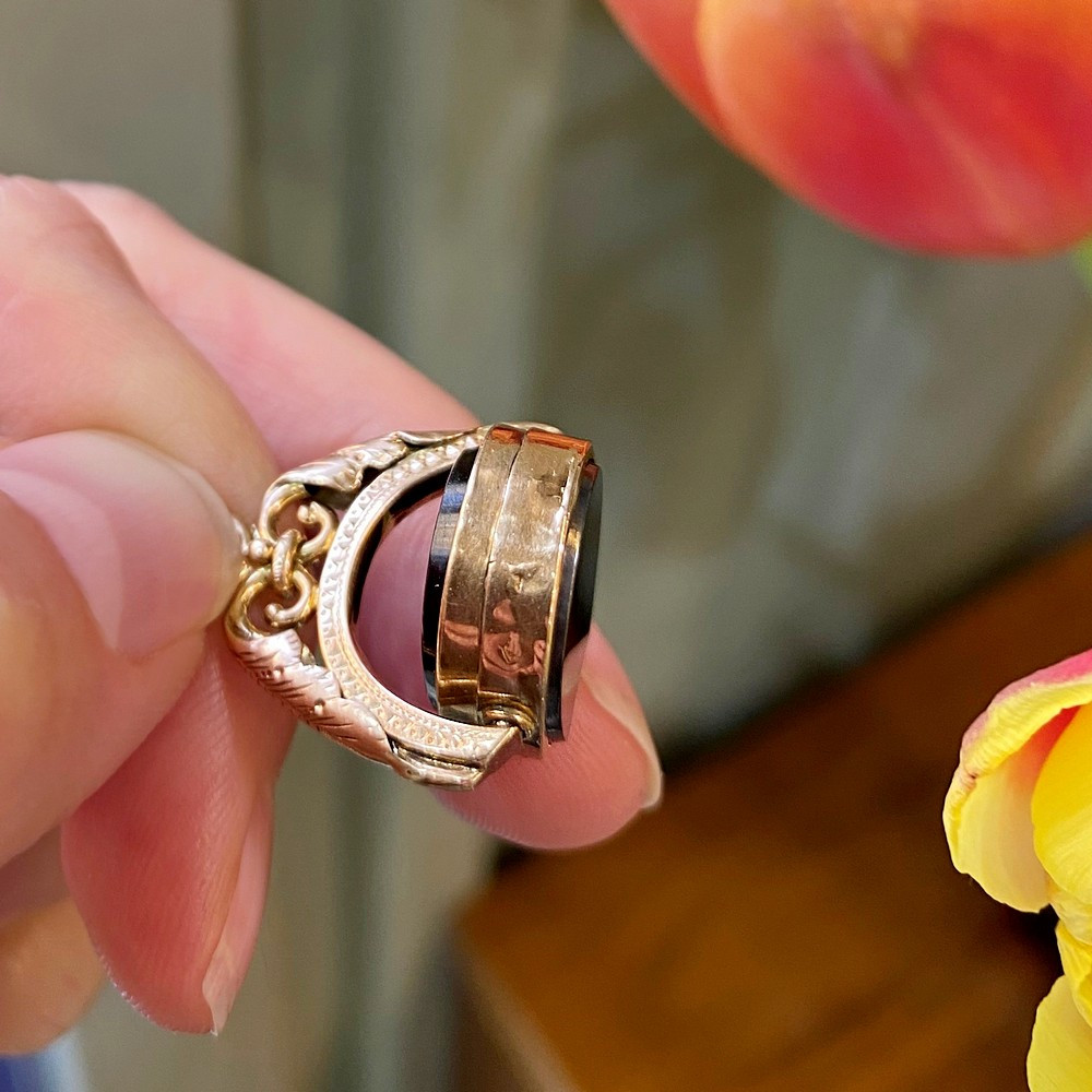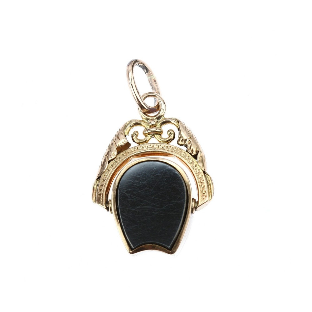 Přívěs z období Rakouska-Uherska z růžového 14karátového zlata. Na otočné části je umístěna karneolová intaglie, z druhé strany se nachází hladká destička hematitu. Oba kameny jsou přírodního původu. Rámeček, do kterého jsou kameny zasazeny, má na několika místech drobné oťuky a je zde také rakousko-uherský punc „liška“ (Au 580/1000).