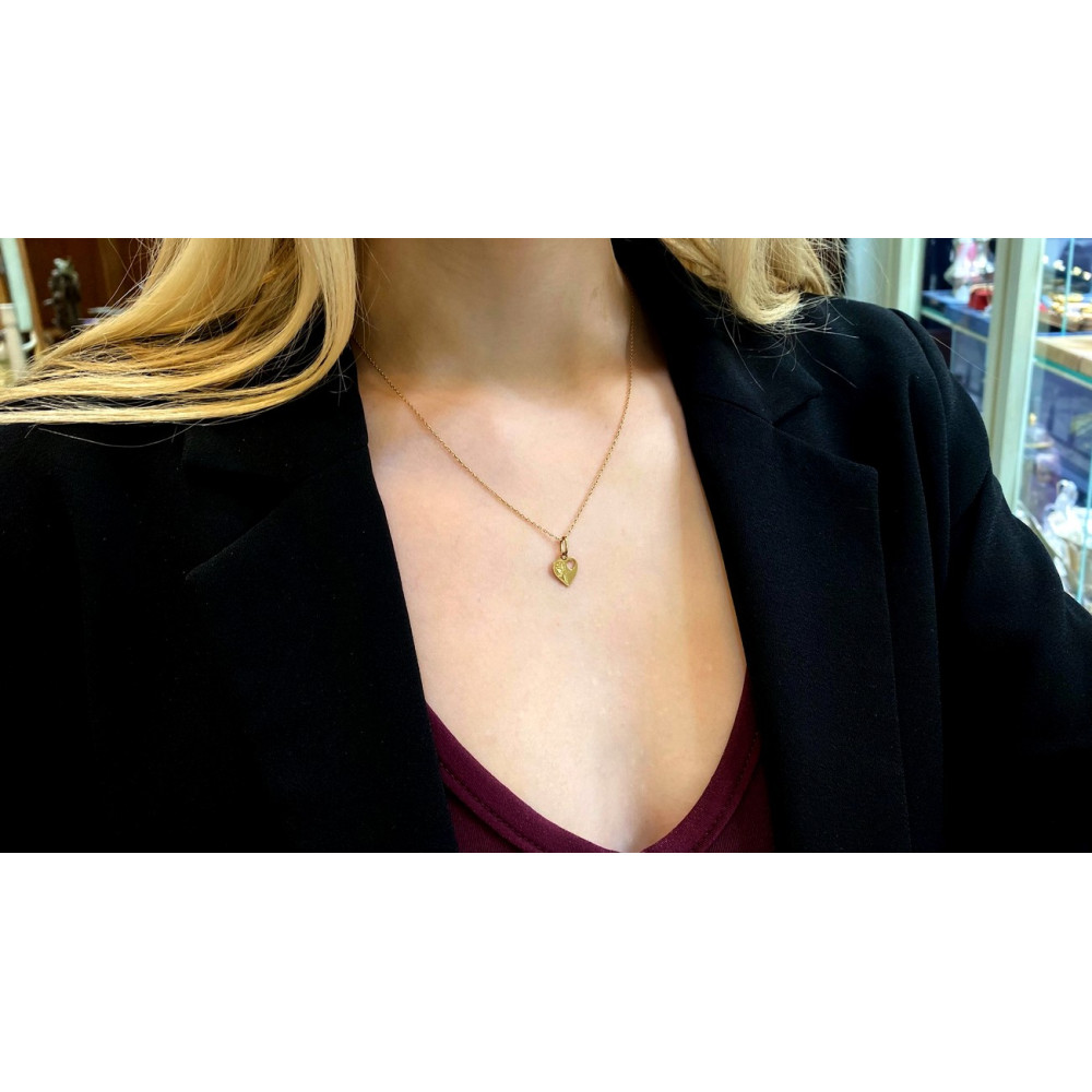 Náhrdelník zhotovený v kombinaci žlutého a růžového 9karátového zlata přibližně z počátku 20. století je osazen barevnými sklíčky a perličkami, které jsou pak doplněny zlatými aplikami ve tvaru srdce a listů.