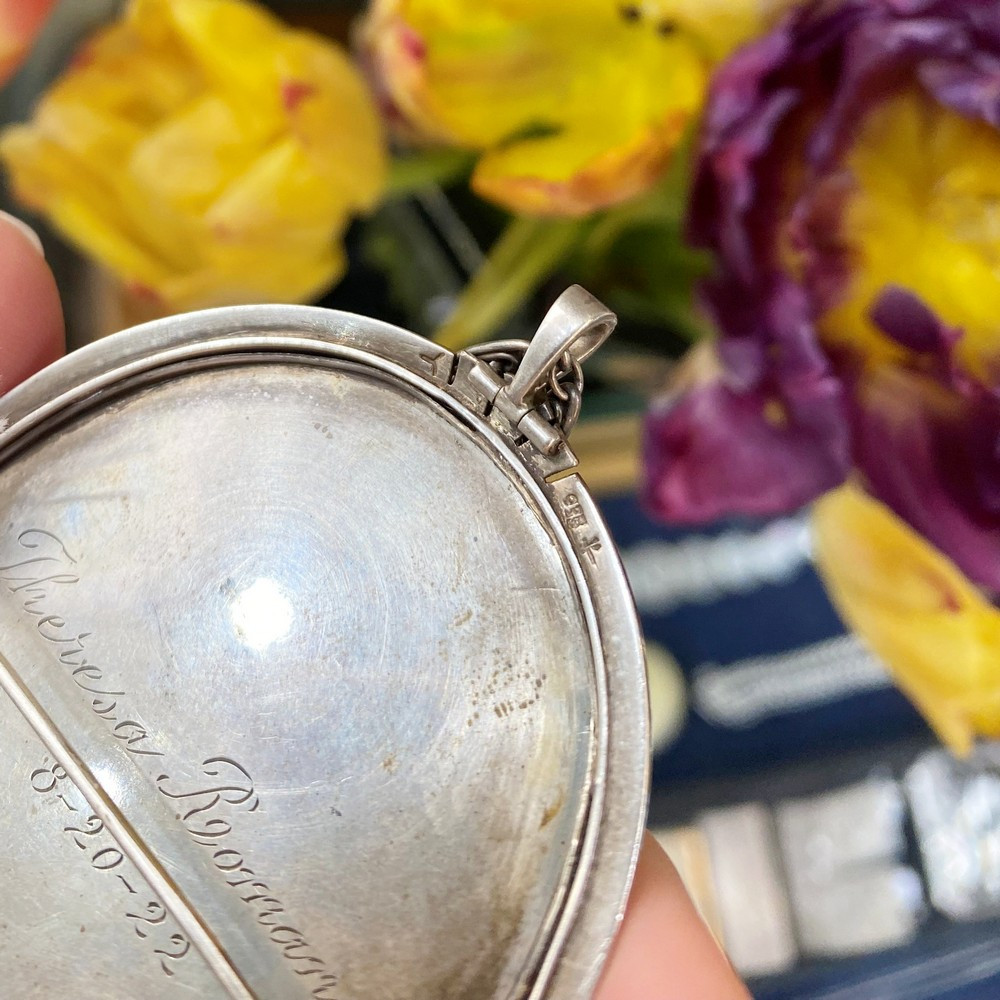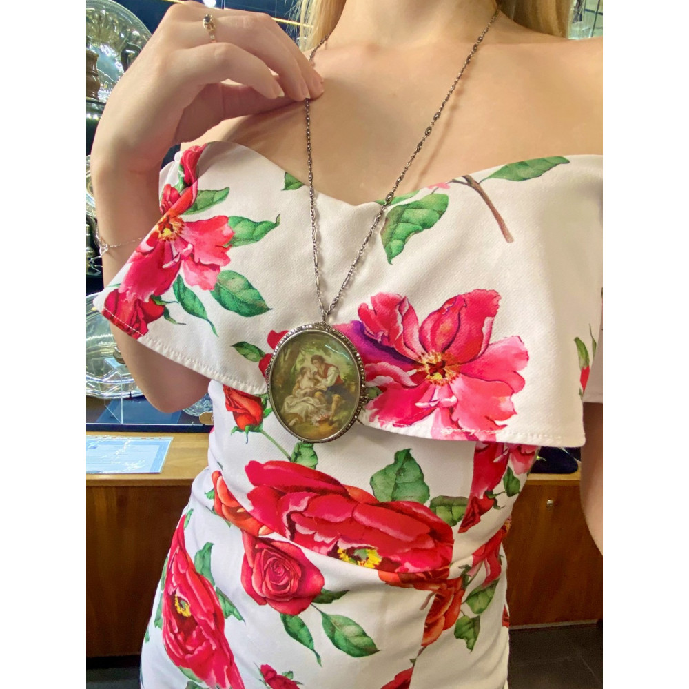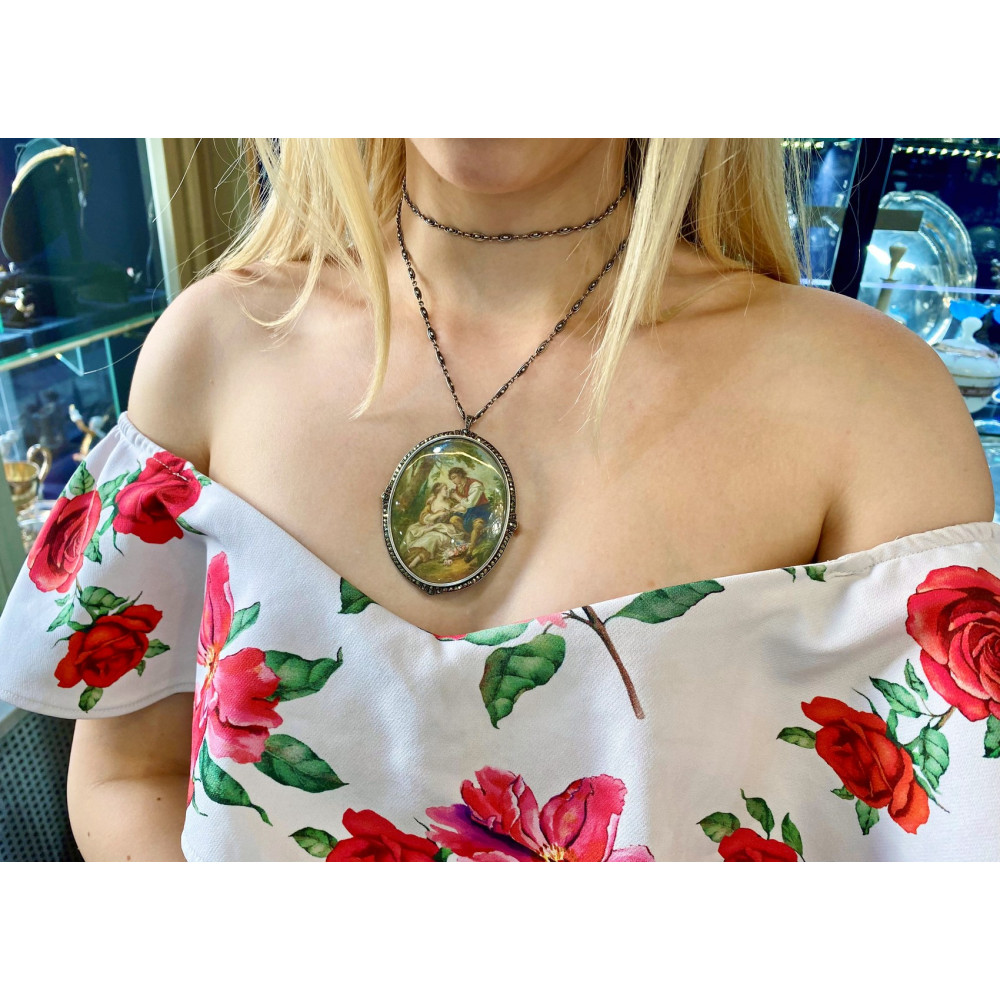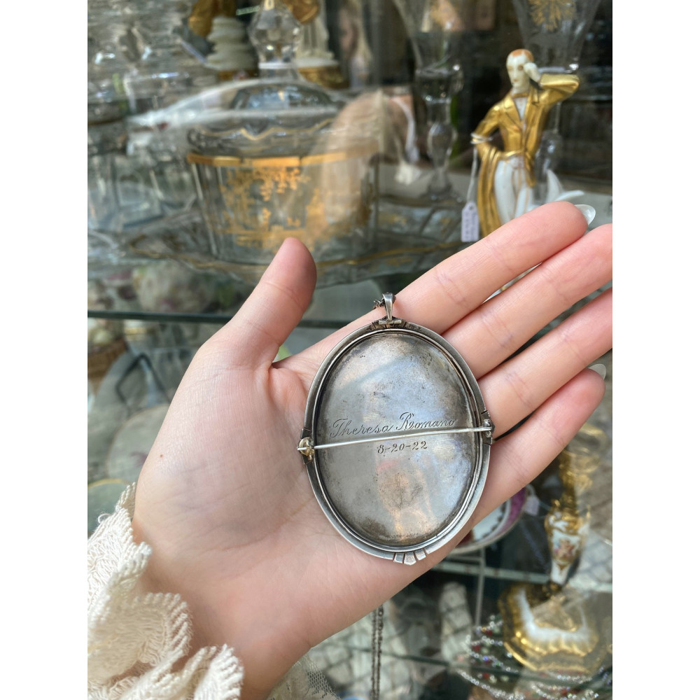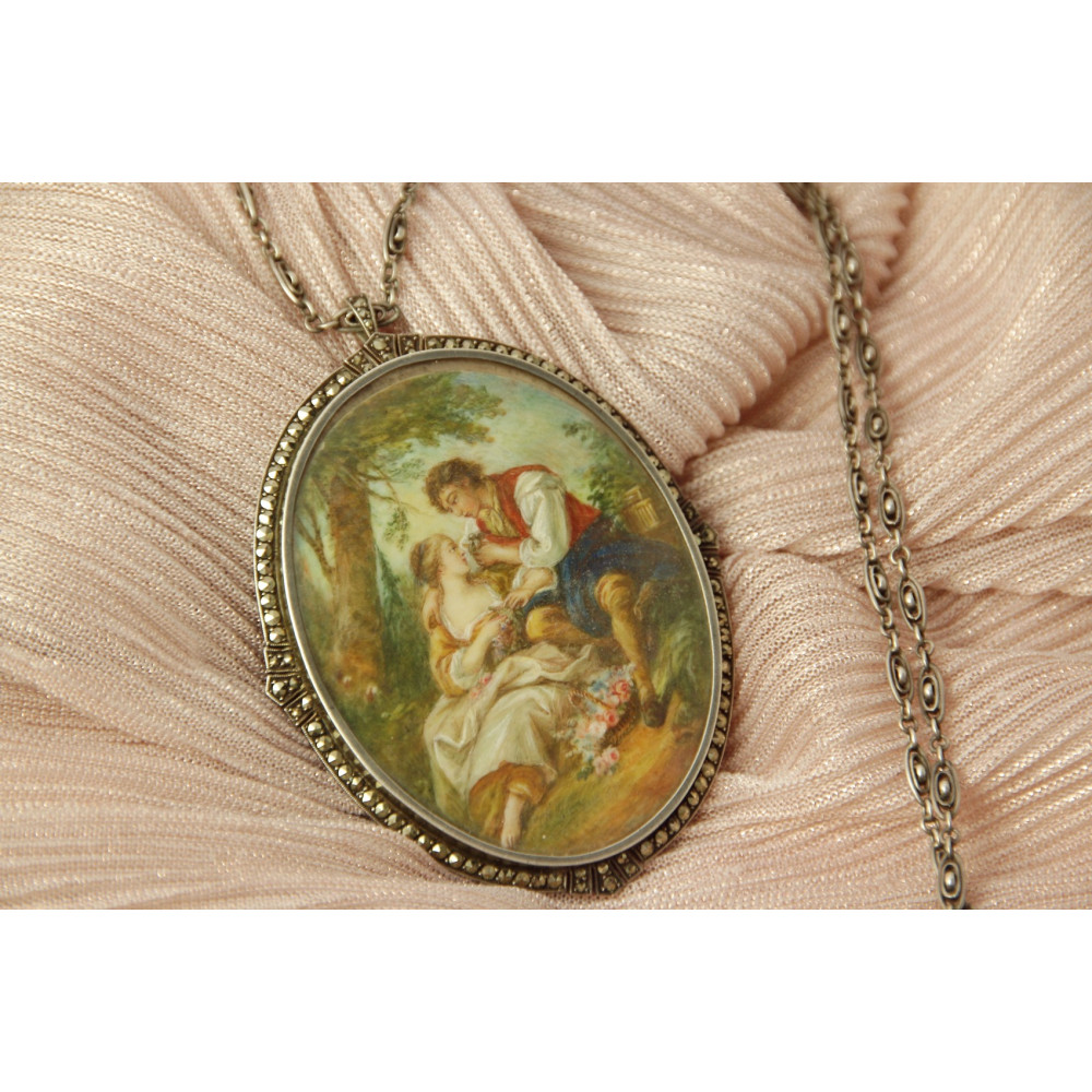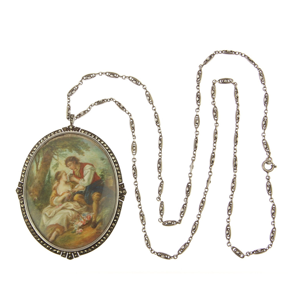 Velký šperk v podobě přívěsku a brože zhotovený ze stříbra, doplněný o dlouhý stříbrný řetěz. V oválném rámečku posázeném přírodními markazity je pod sklem vložena ruční malba s galantní scénou. Zezadu přívěsku je věnování "Theresa Romano 8-20-22". Malba se zadní stranou přívěsku je pravděpodobně starší, z 19. století, oproti markazitovému rámečku, který je vytvořený v art deco stylu odpovídající 20. létům 20. století. Přívěs byl vyroben známou německou šperkařskou firmou Meyle & Mayer, založenou v Pforzheimu roku 1887.