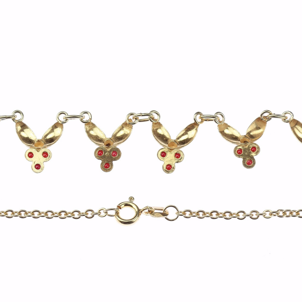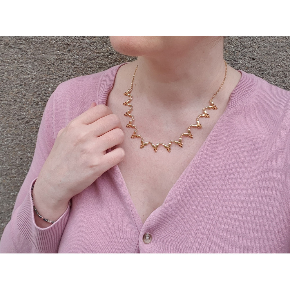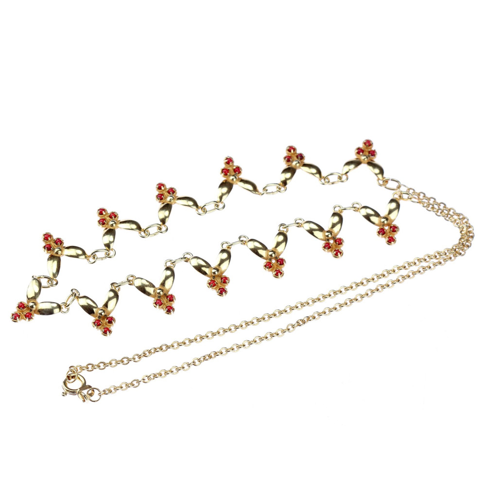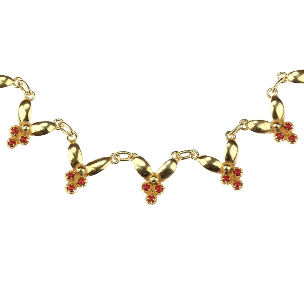 Náhrdelník ze zlaceného stříbra má v krapnách zasazenu vždy trojici přírodních granátků. Výrobní značky "JB 900" a samotná ryzost stříbra 900/1000 řadí náhrdelník do produkce 2. poloviny 20. století.