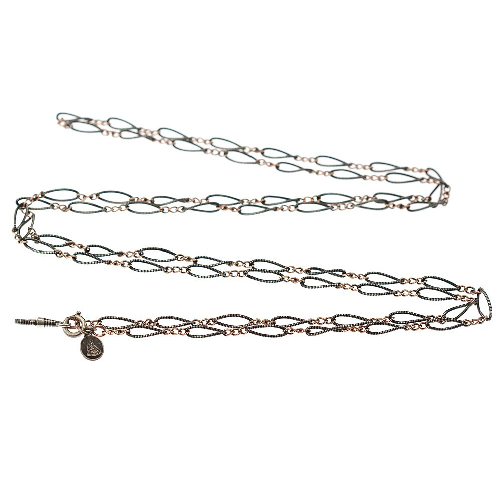 Dlouhý dámský řetízek z počátku 20. století určený k zavěšení kapesních hodinek či lorňonu. Vyroben ze stříbra o ryzosti 800/1000. Jednotlivé články jsou detailně zdobeny – technikou niello a růžovým zlacením. Na pružinový kroužek je zavěšena stříbrná svátostka vykládaná černým smaltem; na zadní straně má rytý monogram „M.Z“.