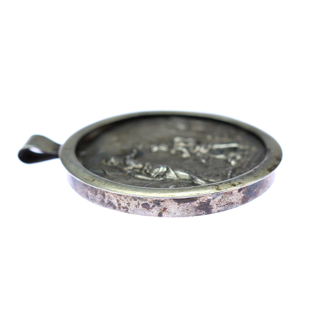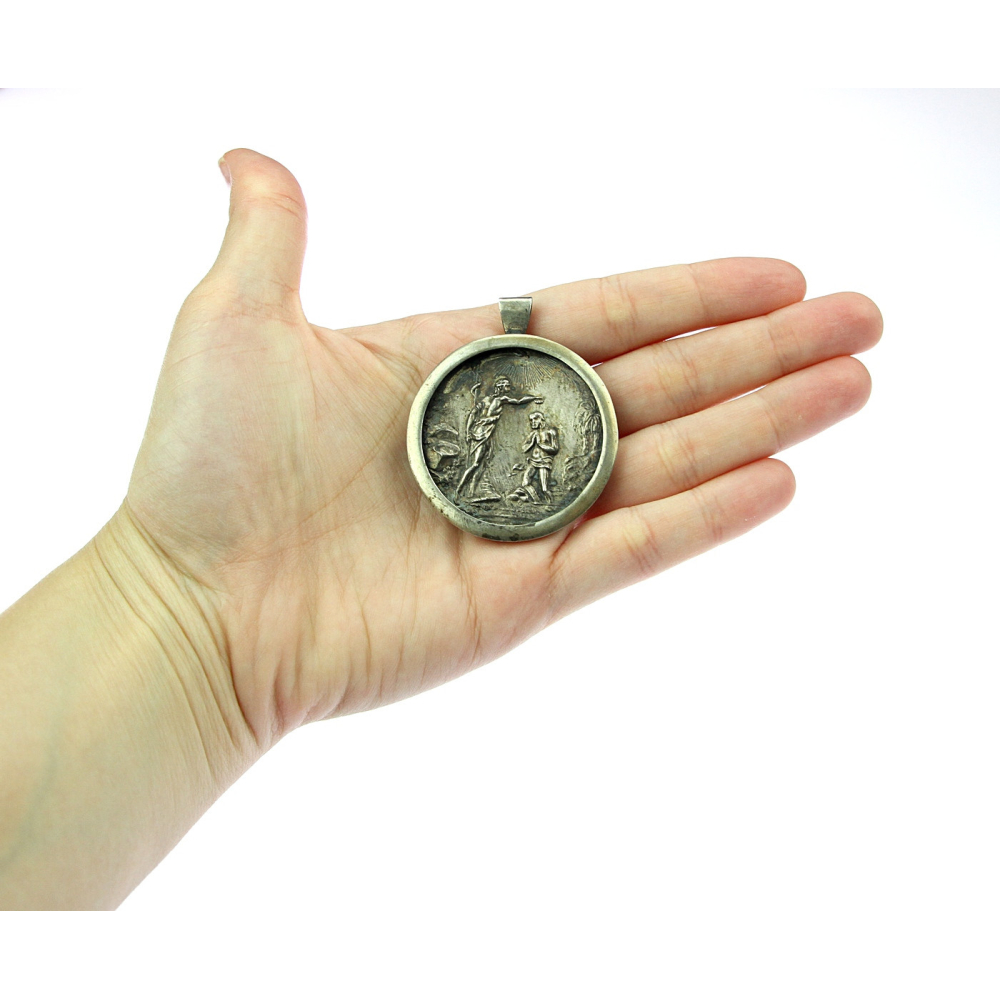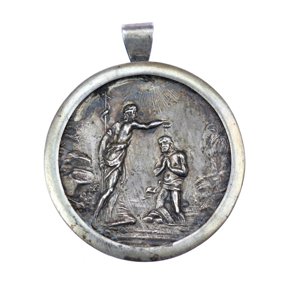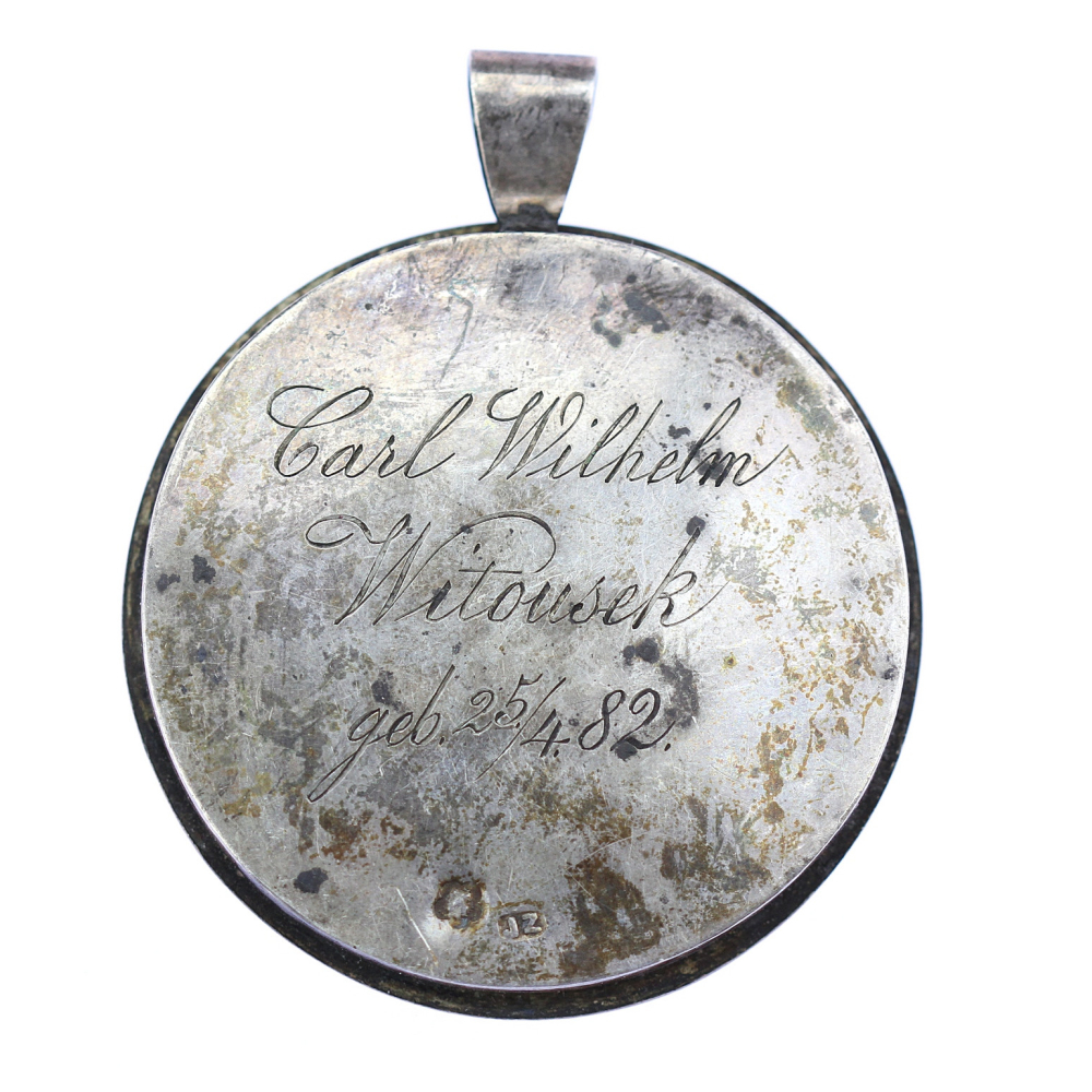 Medaile umístěná ve stříbrném rámečku s motivem křtu Krista v Jordánu. Zadní strana přívěsku nese věnování "Carl Wilhelm Witousek, geb. 25.4.82" a rakousko-uherský punc s písmenem "A" (Vídeň).