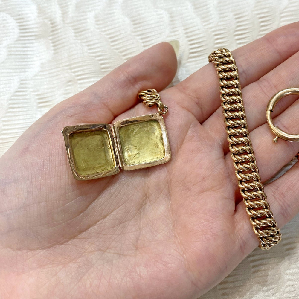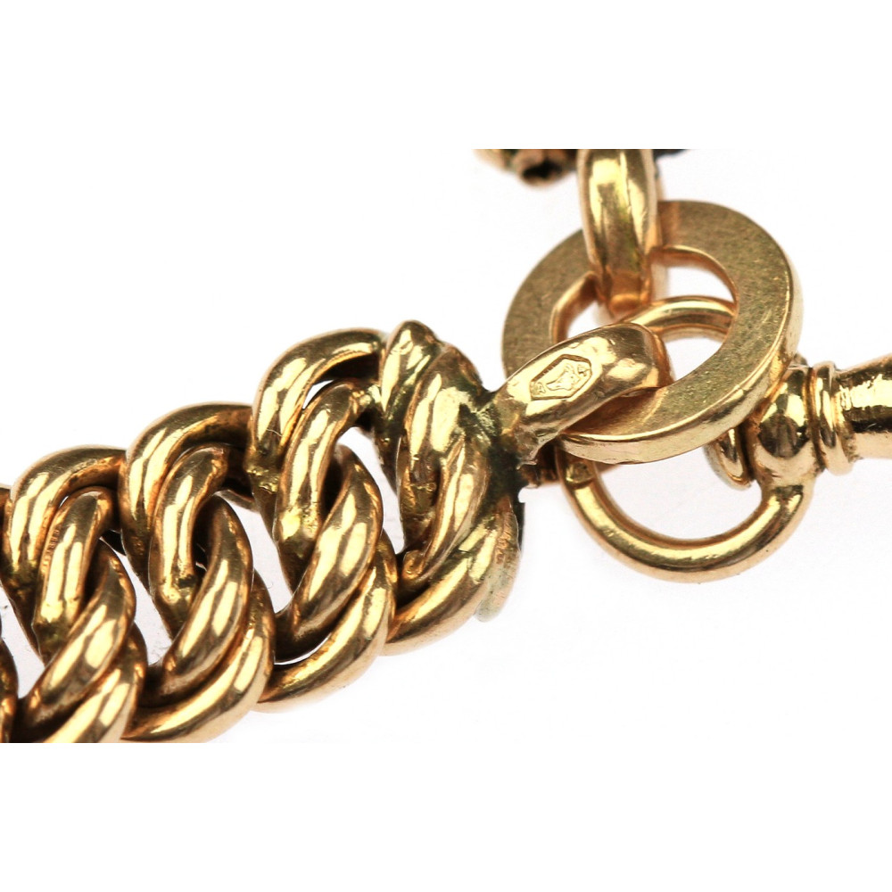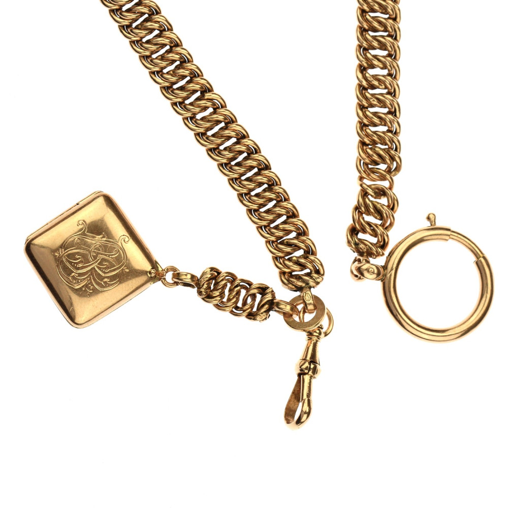 Rakousko-uherský šatlén (řetízek ke kapesním hodinkám) z růžového 14karátového zlata tvoří zajímavý dvojitě splétaný řetízek. K řetízku je připojený čtvercový otevírací medailon s vyrytým monogramem "BB". Šperk má dvě karabiny, které jsou plně funkční, ve výborném stavu.