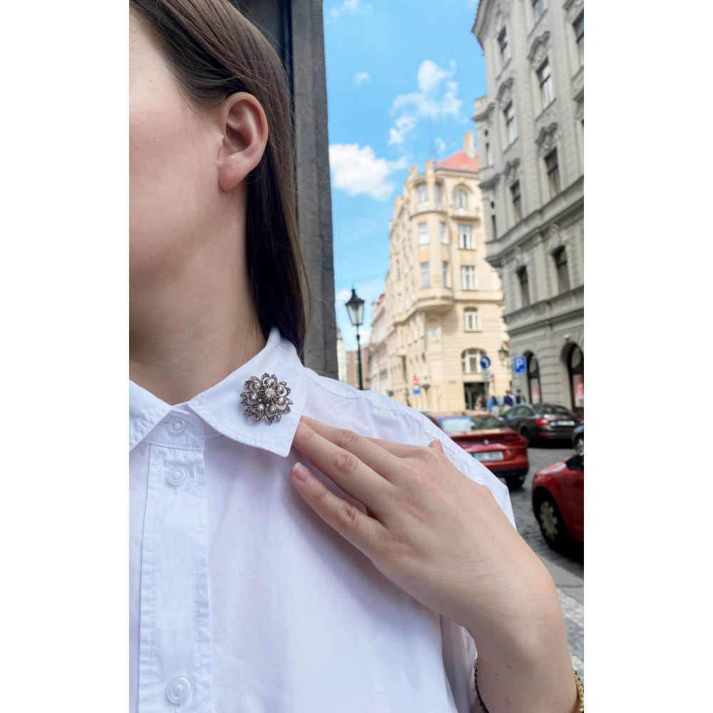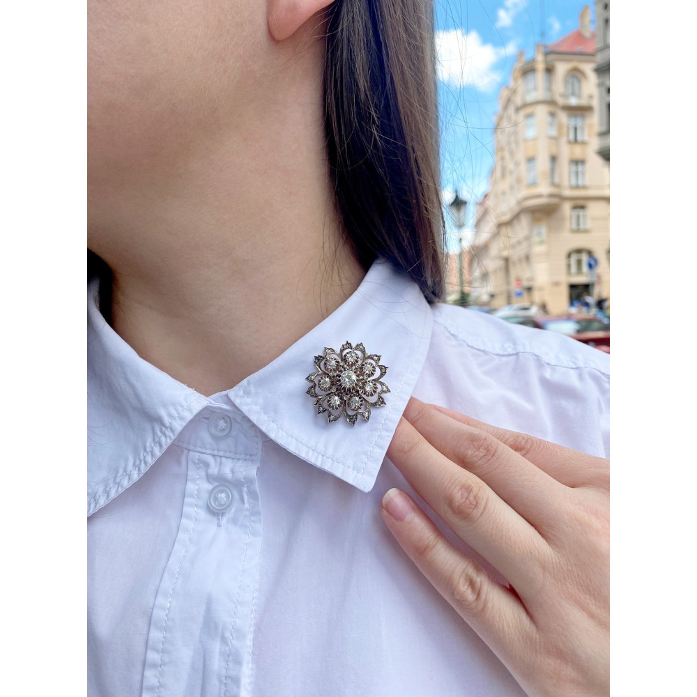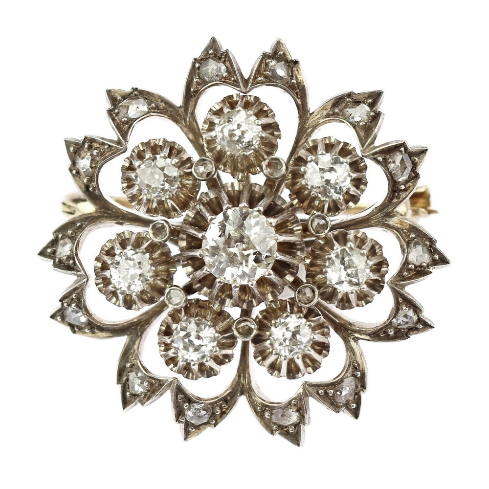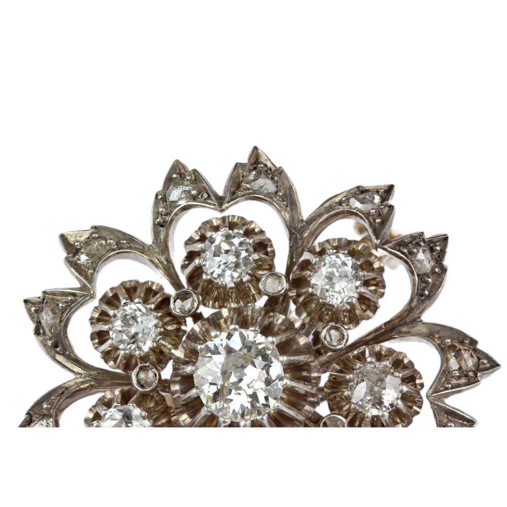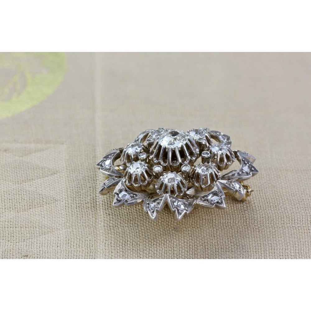 Starožitná květinová brož z konce 19. století je poseta přírodními starobrusnými diamanty o celkové váze 2,55 ct. Centrální kámen má váhu 0,80 ct, barvu E-F a čistotu SI, kolem něj je osazeno sedm starobrusných briliantů každý o váze 0,20 ct, barvě F-H, čistotě VS-SI a jednadvacet diamantů routového brusu 7× 0,01 ct a 14× 0,02 ct.