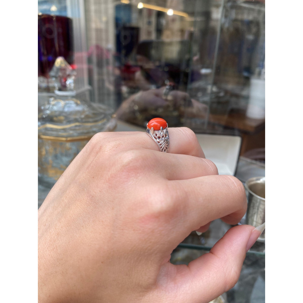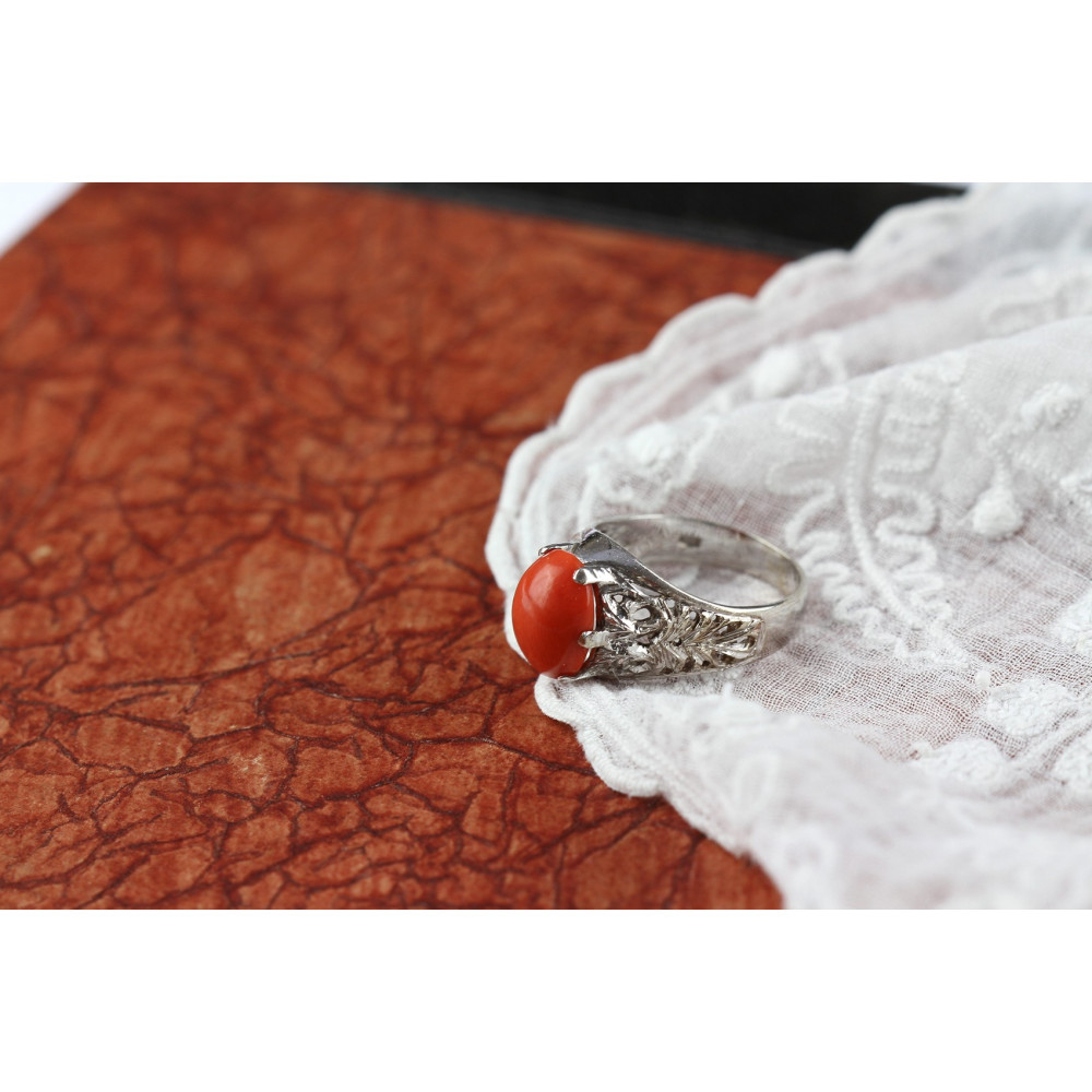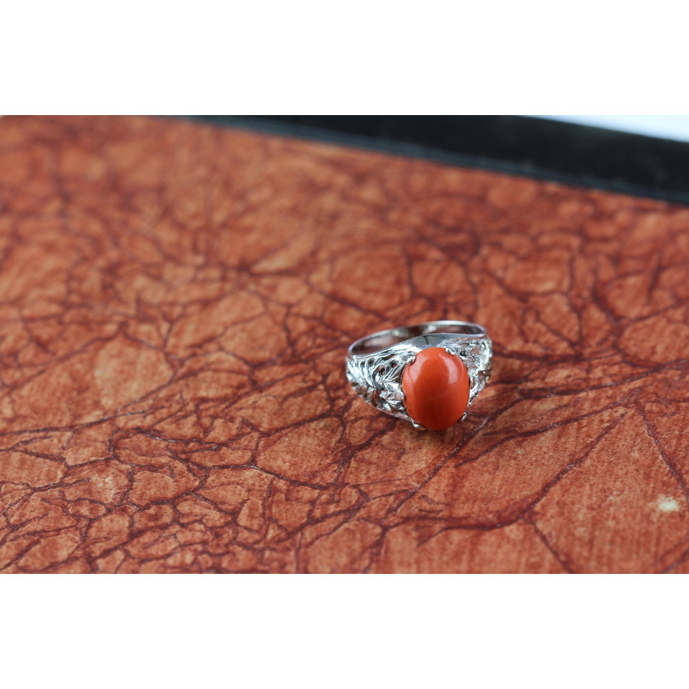 Prsten zhotovený z bílého 18karátového zlata s přírodním mořským korálem z Korsiky. Zajímavým prvkem jsou reliéfně zpracovaná ramínka prstenu.