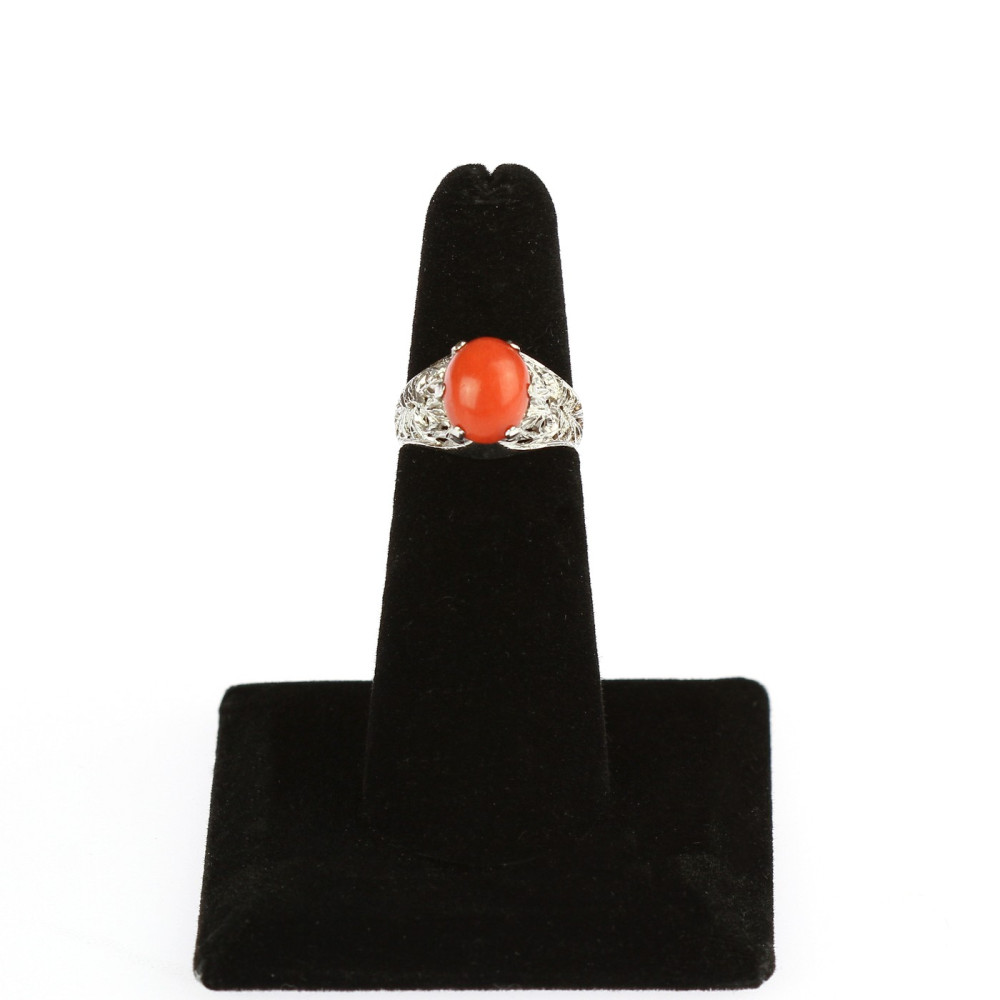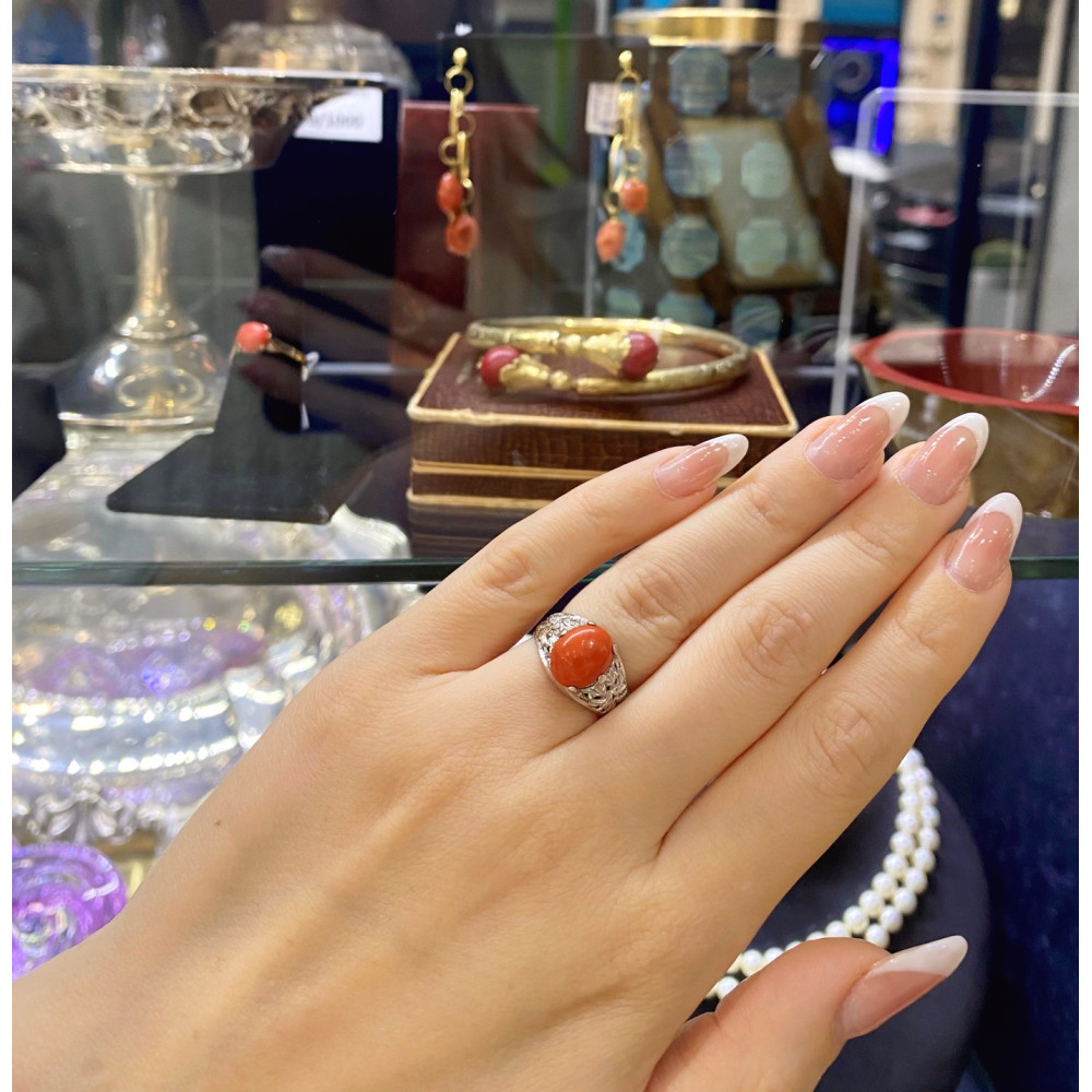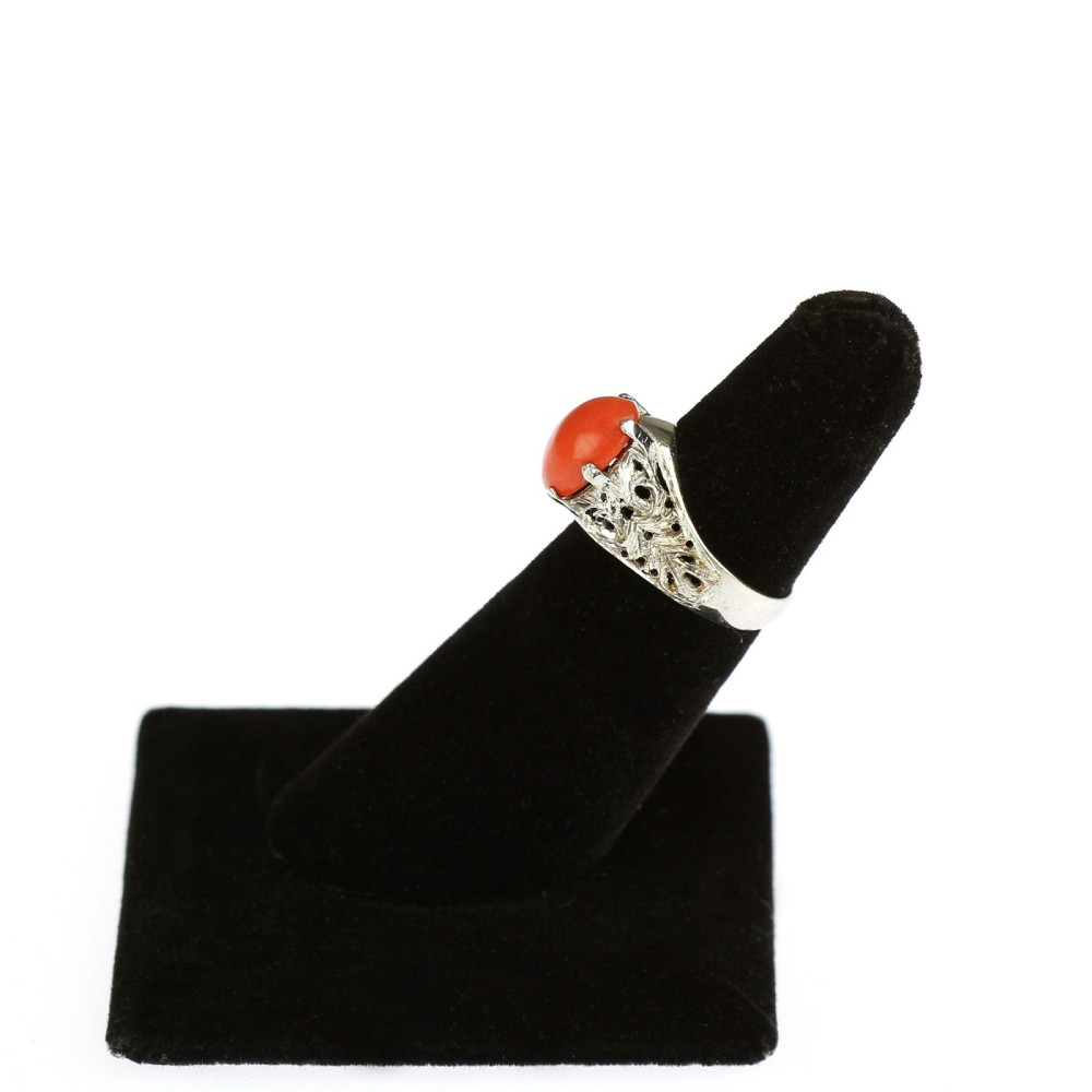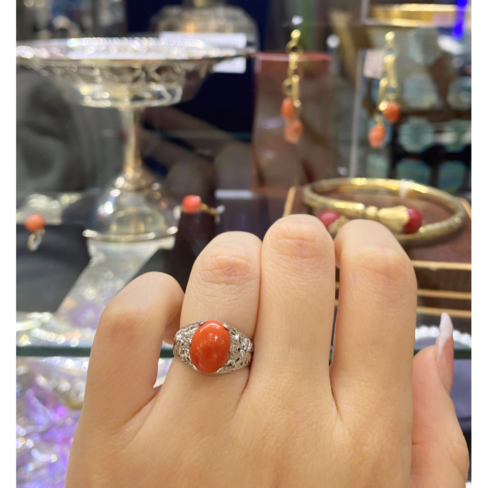 Prsten zhotovený z bílého 18karátového zlata s přírodním mořským korálem z Korsiky. Zajímavým prvkem jsou reliéfně zpracovaná ramínka prstenu.