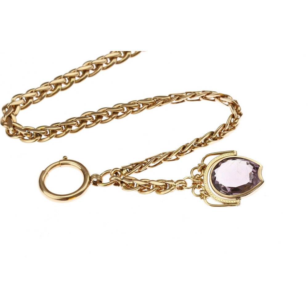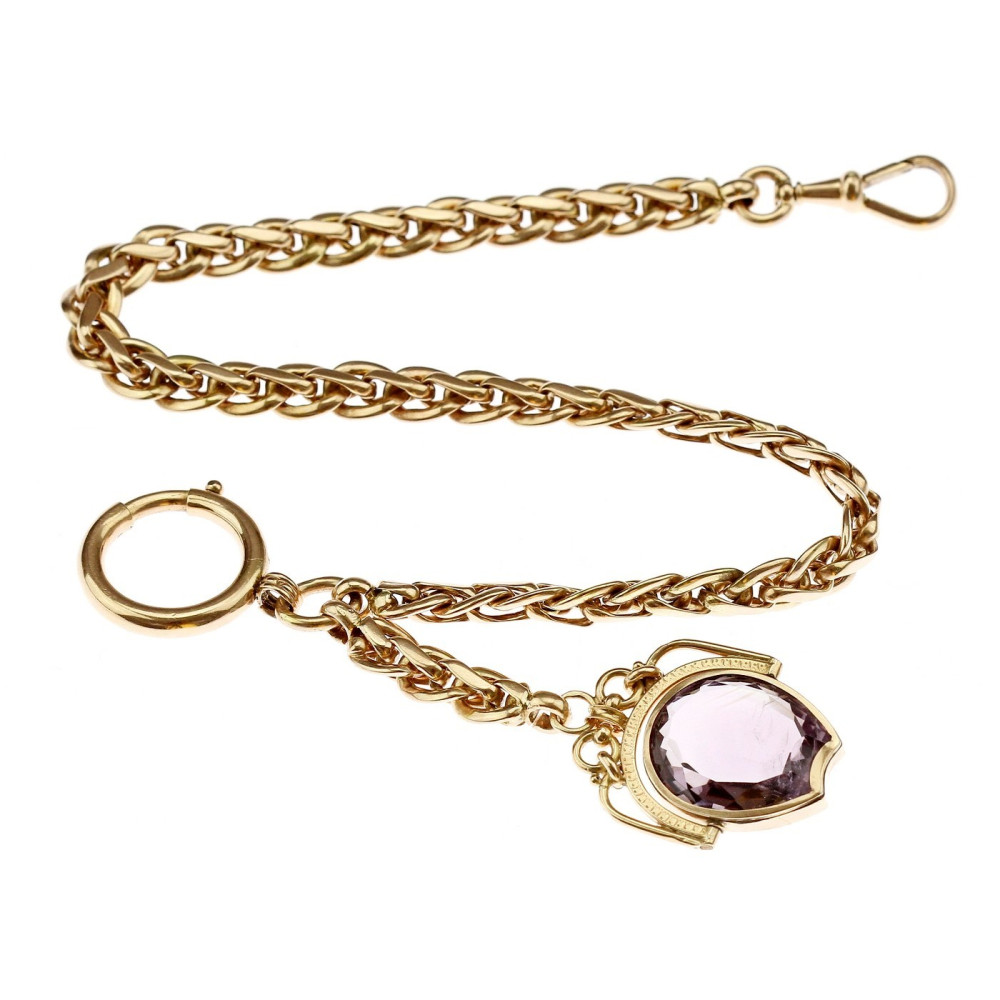 Řetízek ke kapesním hodinkám (šatlén) zhotovený z růžového 14karátového zlata s přírodním broušeným ametystem o váze 30 ct (zlatý rámeček, v němž je ametyst usazen, nese známky běžného používání) je značen rakousko-uherským puncem "liška" s písmenem "A" (Vídeň).