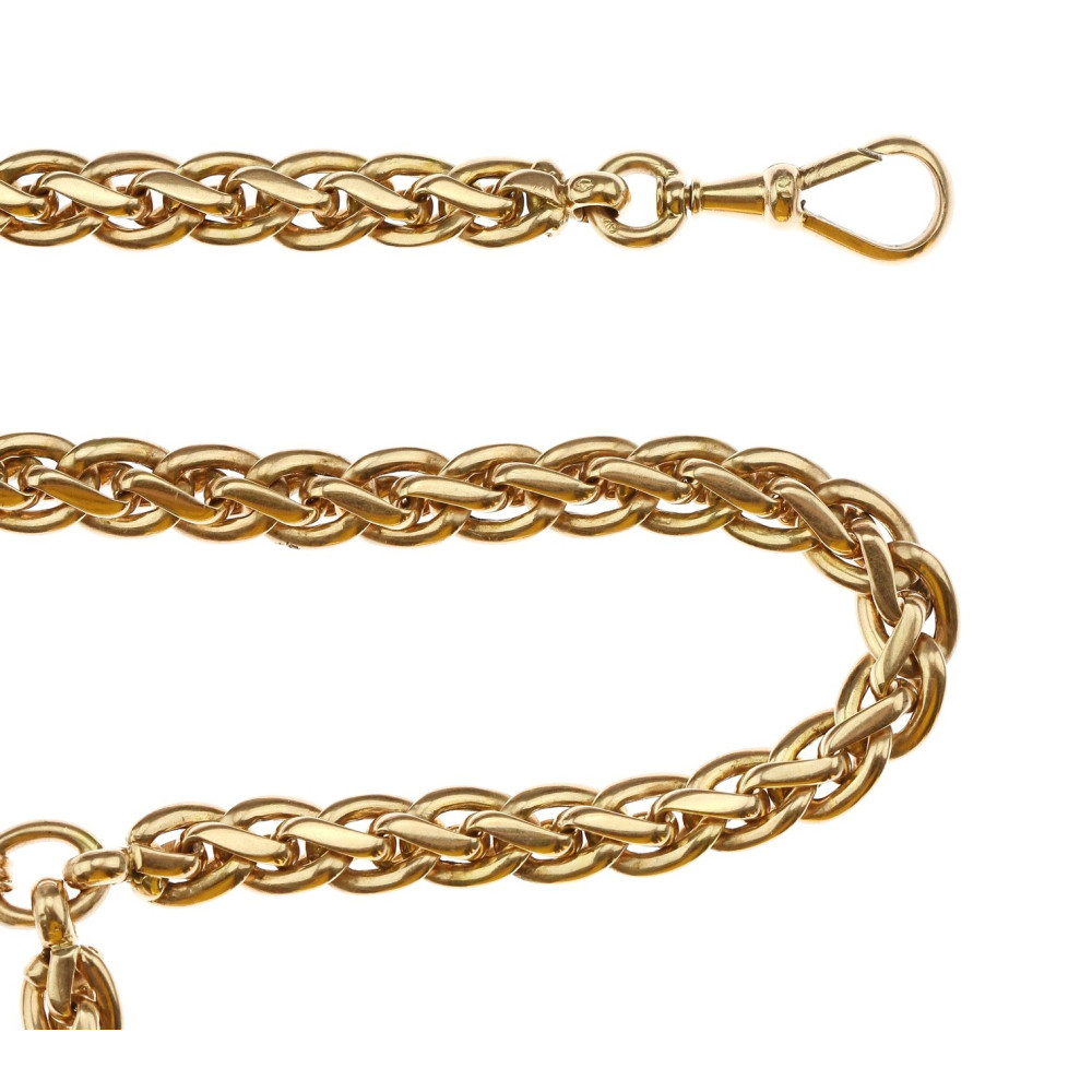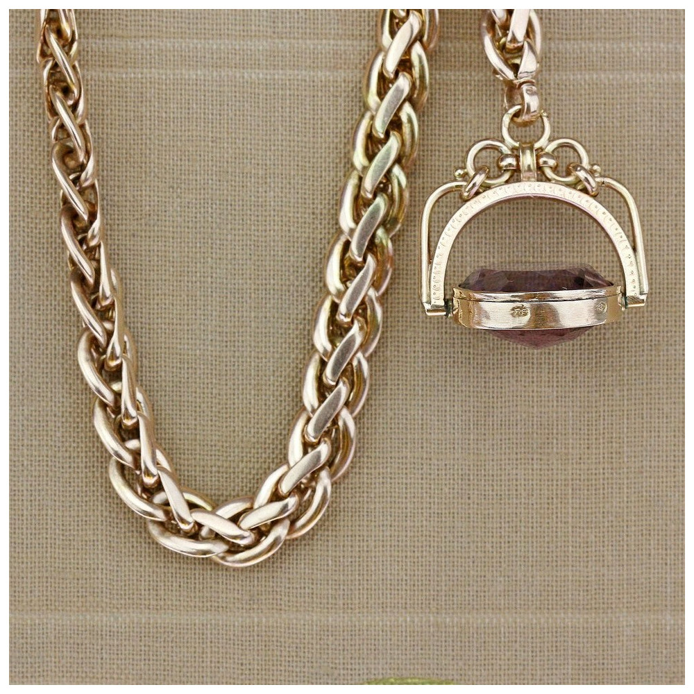 Zlatý řetěz určený ke kapesním hodinkám byl vyrobený v období Rakouska-Uherska z růžového 14karátového zlata s přívěskem zasazeným přírodním ametystem (cca 20,0 ct). Na několika místech značeno rakousko-uherskými puncy s místem značení ve Vídni a mistrovskou značkou.