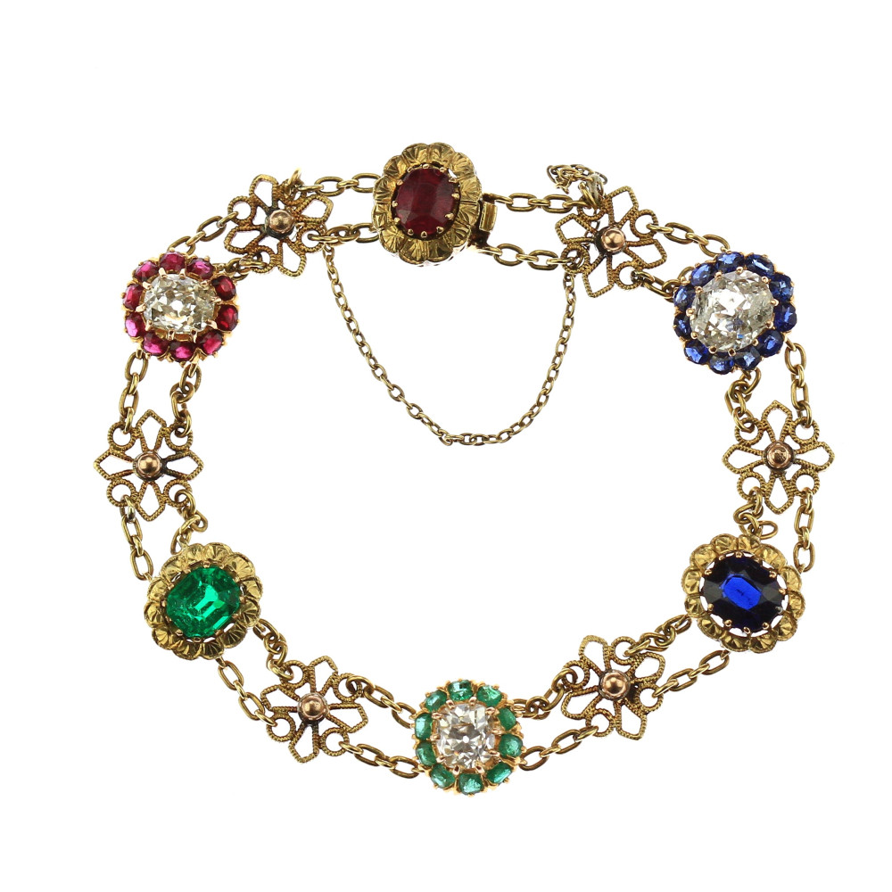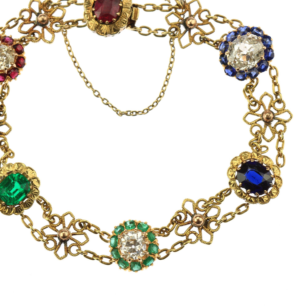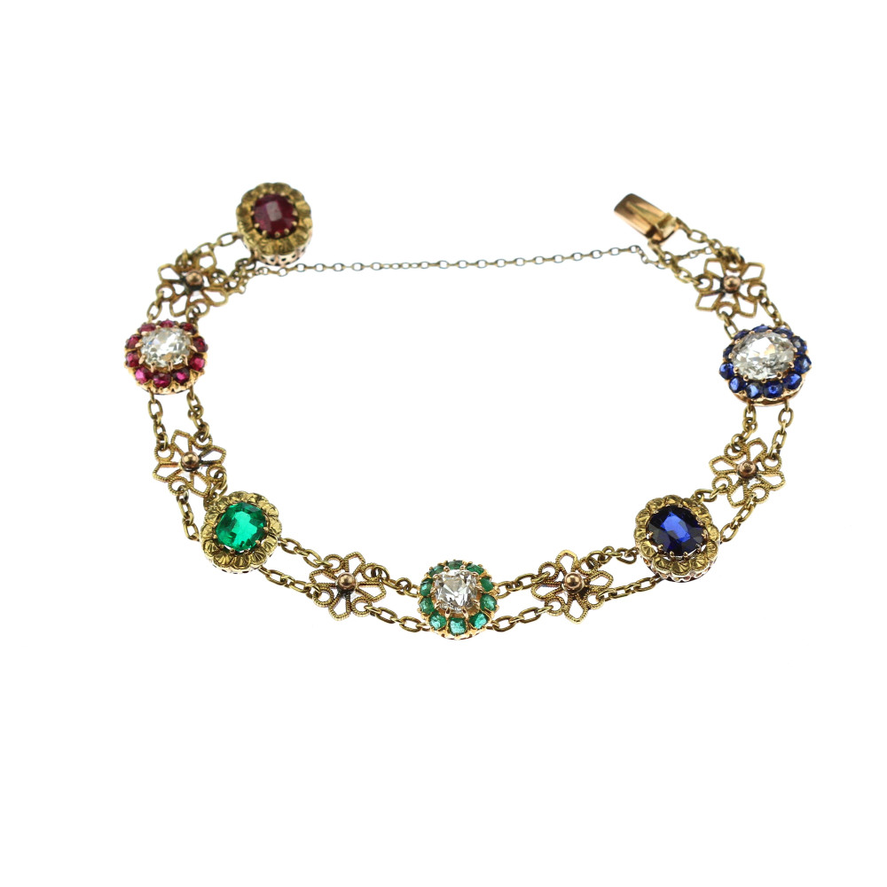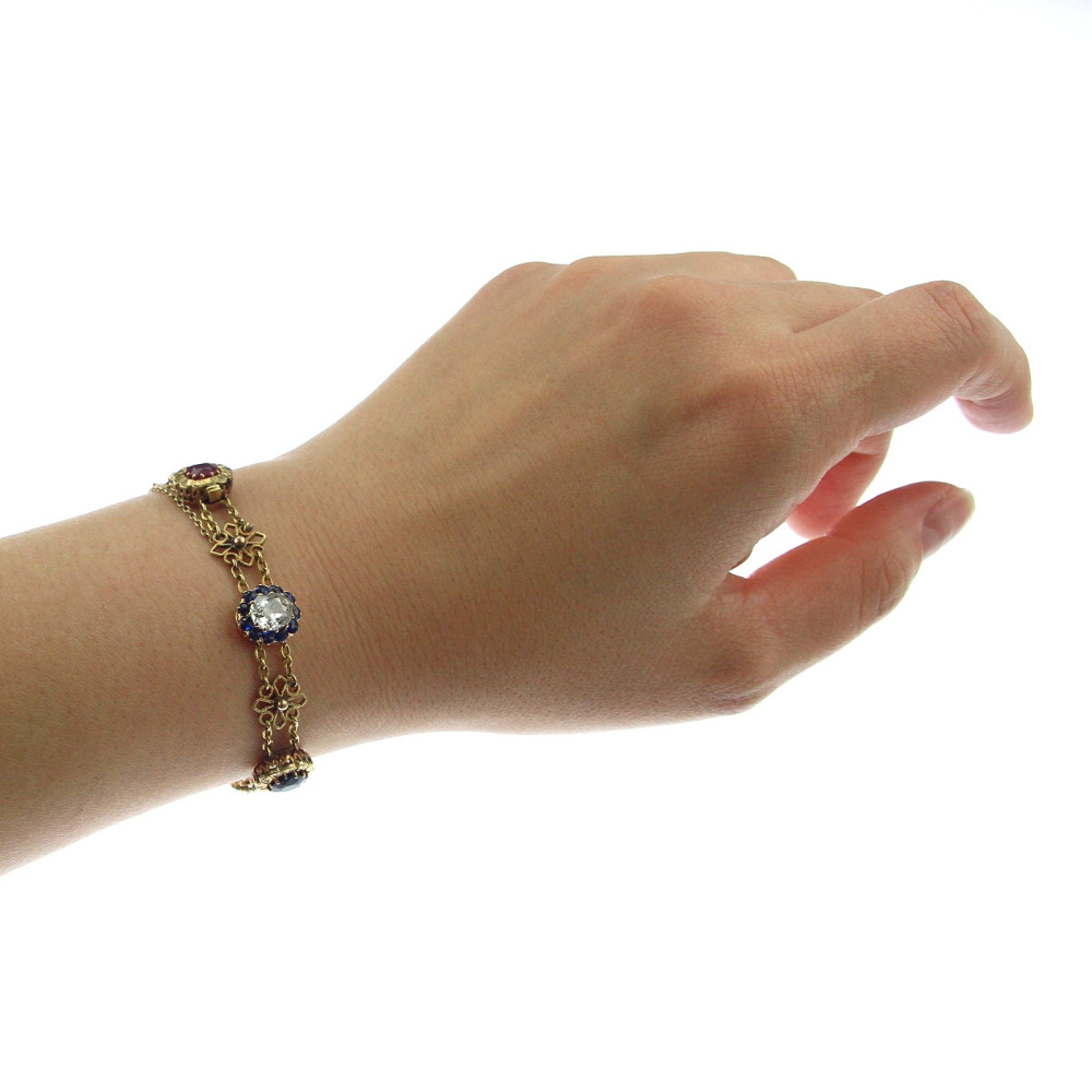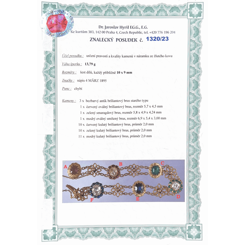 Náramek zhotovený ze žlutého 18karátového zlata zdobí články ve tvaru kytiček a barevné drahé kameny přírodního původu. U zapínání značeno "4 Marz 1895". Krásná ukázka umělecko-řemeslné práce z konce 19. století. Nepuncováno, platný český punc zastupuje osvědčení vydané Puncovním úřadem.