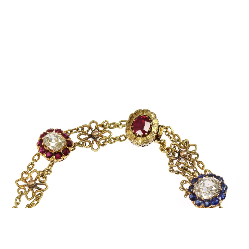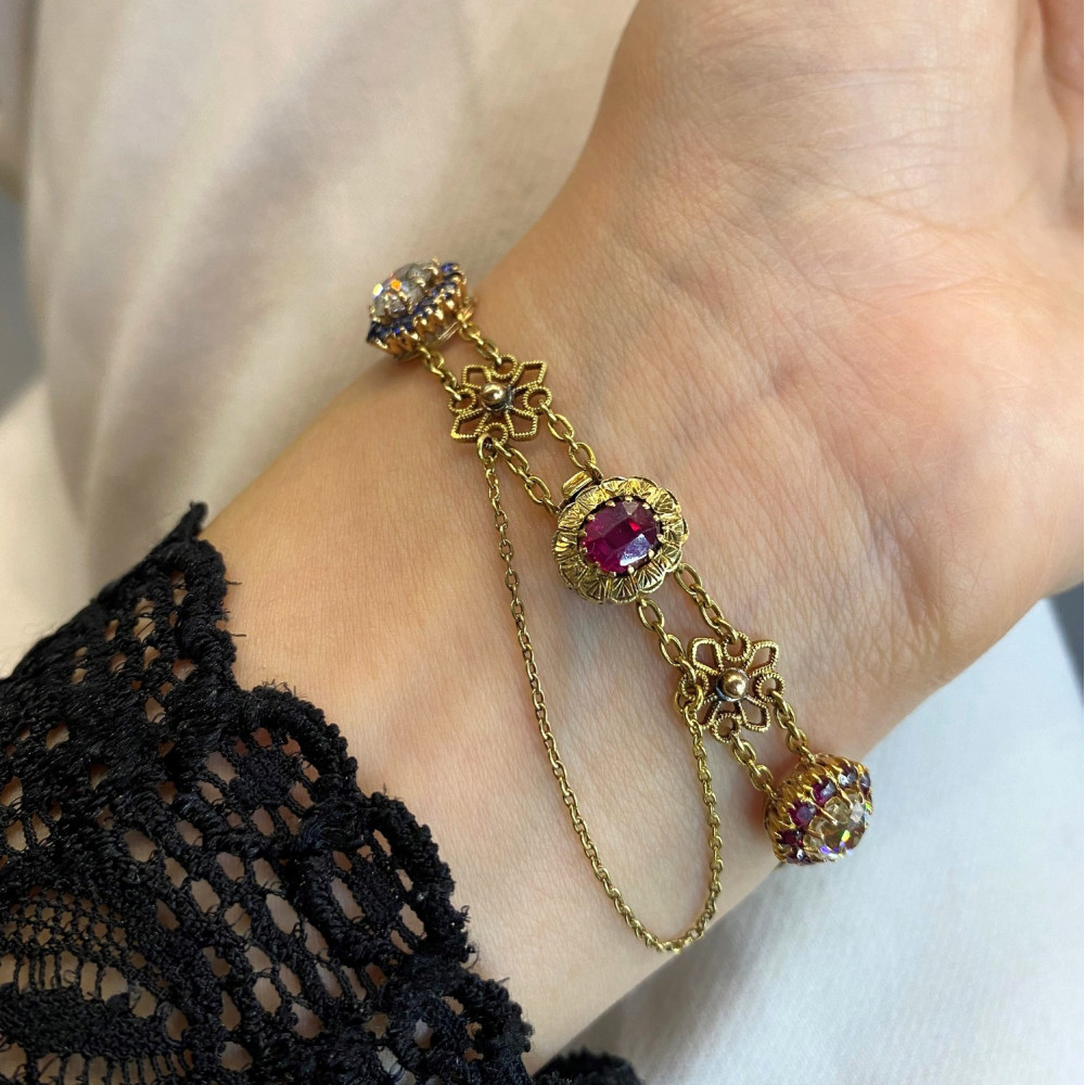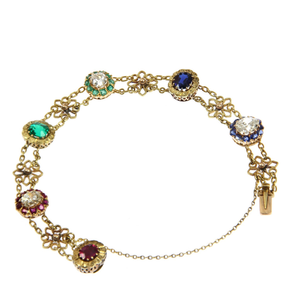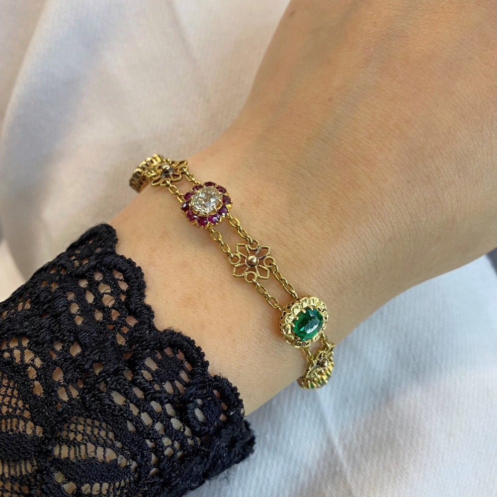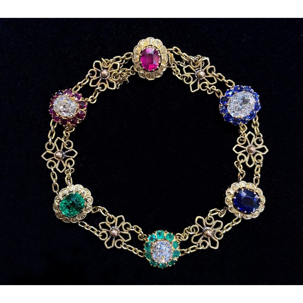 Náramek zhotovený ze žlutého 18karátového zlata zdobí články ve tvaru kytiček a barevné drahé kameny přírodního původu. U zapínání značeno "4 Marz 1895". Krásná ukázka umělecko-řemeslné práce z konce 19. století. Nepuncováno, platný český punc zastupuje osvědčení vydané Puncovním úřadem.