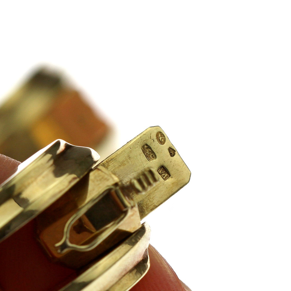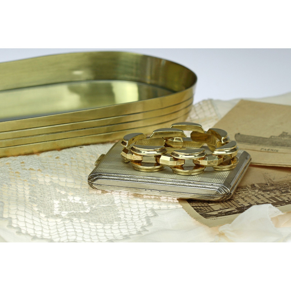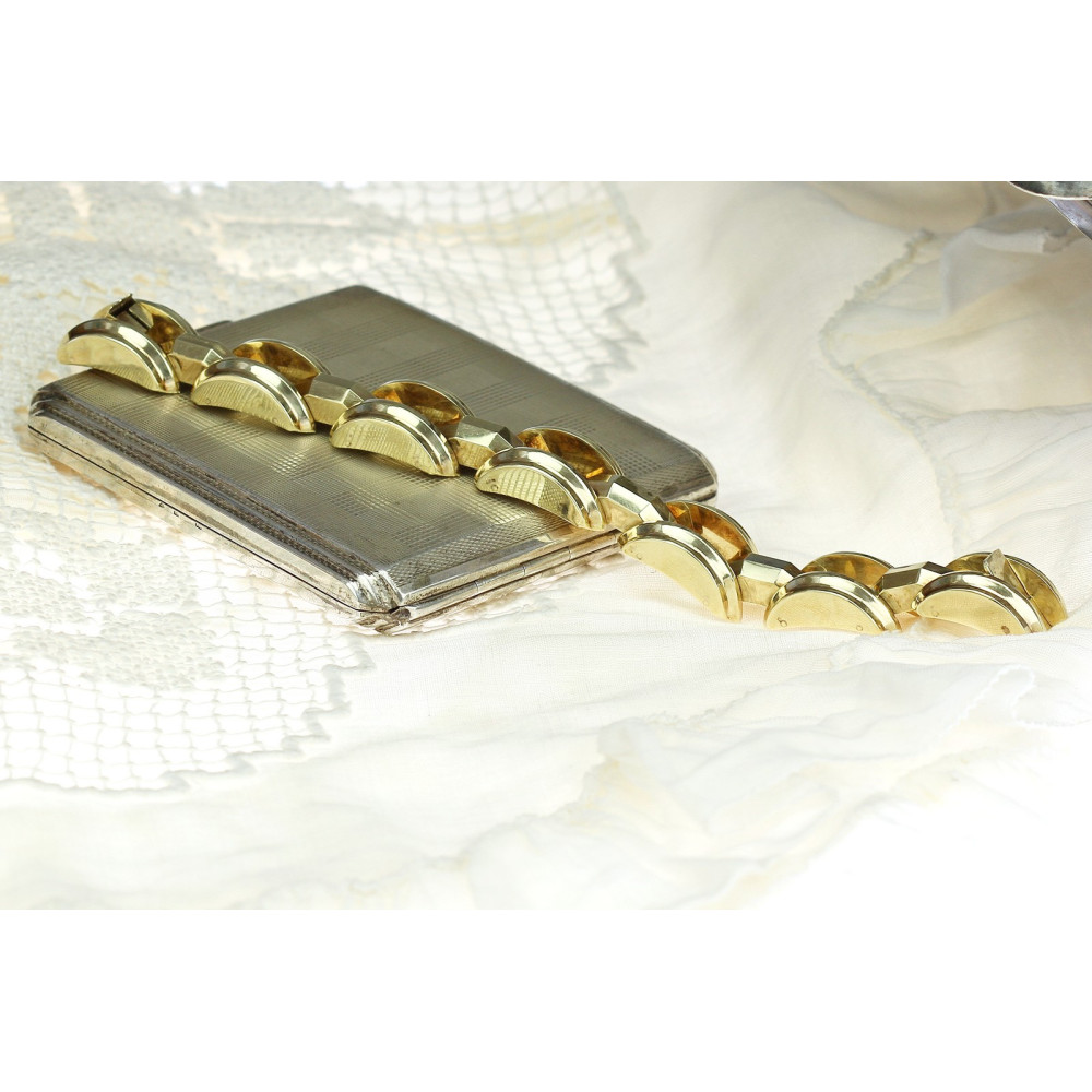 Klasický art deco náramek s kruhovými články vyrobený v kombinaci leštěného žlutého a růžového, částečně dutého 14karátového zlata ve 30. - 40. letech letech 20. století. U jazýčkového zapínání se nachází pojistné očko.
