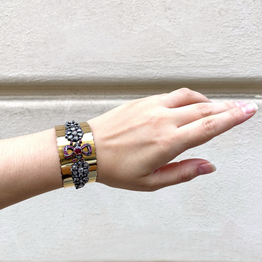 Zlatý náramek s rubínovou mašlí a diamanty - 17 cm