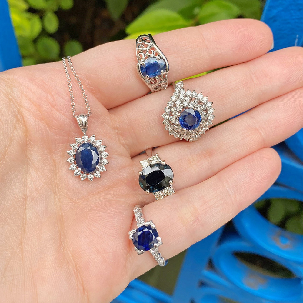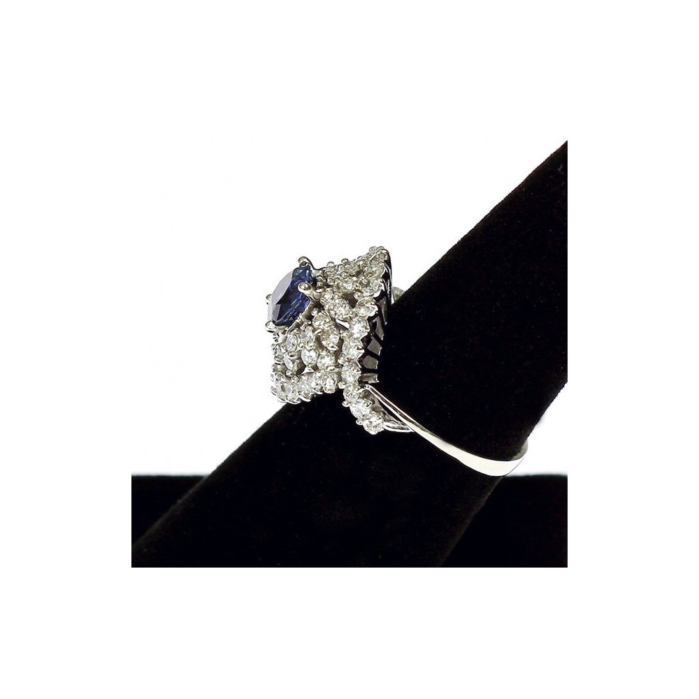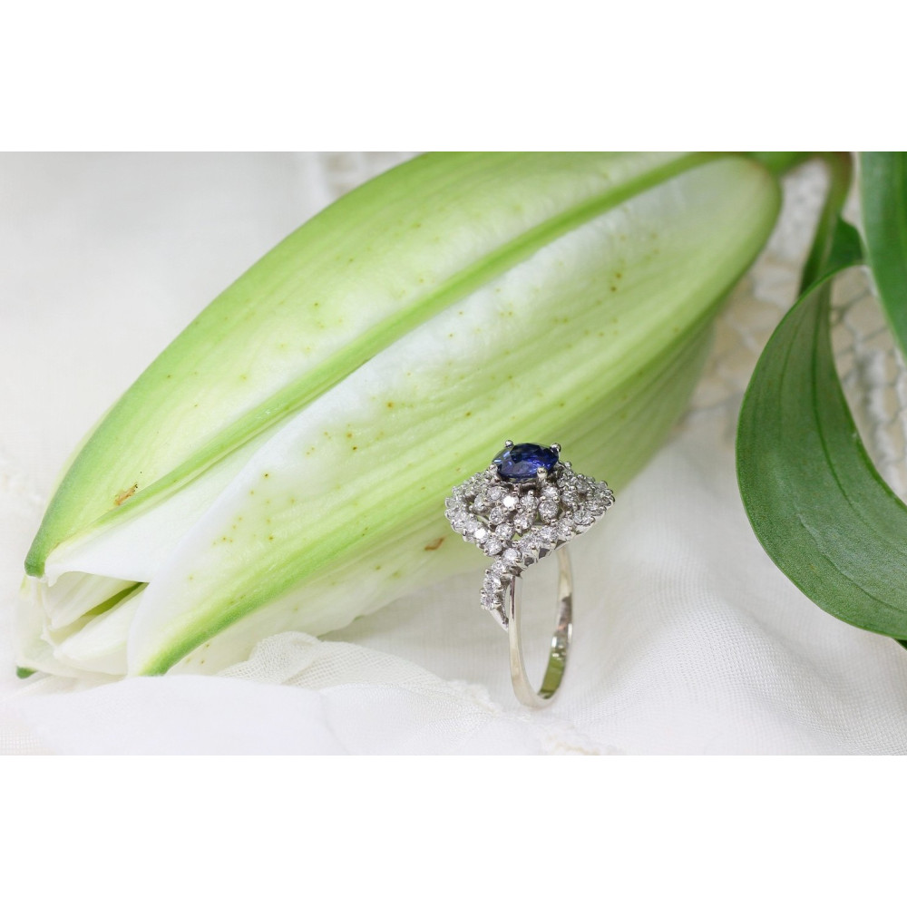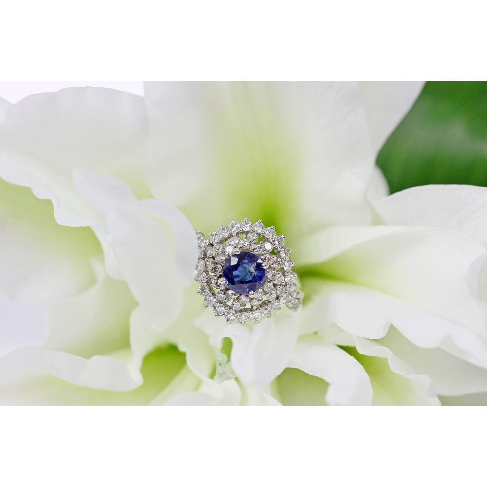 Prsten zhotovený z bílého 18karátového zlata má v centru vsazený přírodní nezahřívaný safír o váze 1,10 ct. Rámují jej přírodní diamanty briliantového brusu o celkové váze 1,68 ct (56 × 0,03 ct). Mají barvu v rozmezí G-H a dosahují čistoty VS-SI.