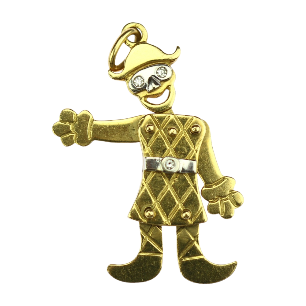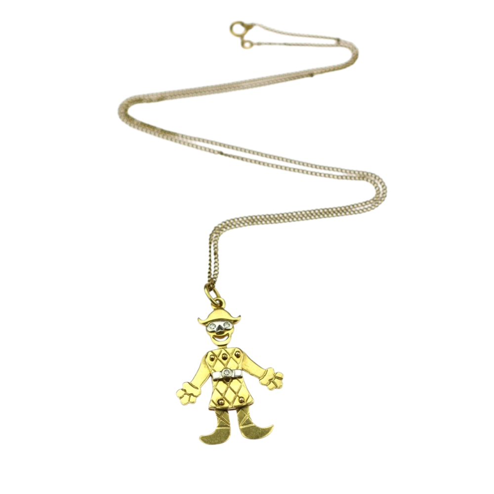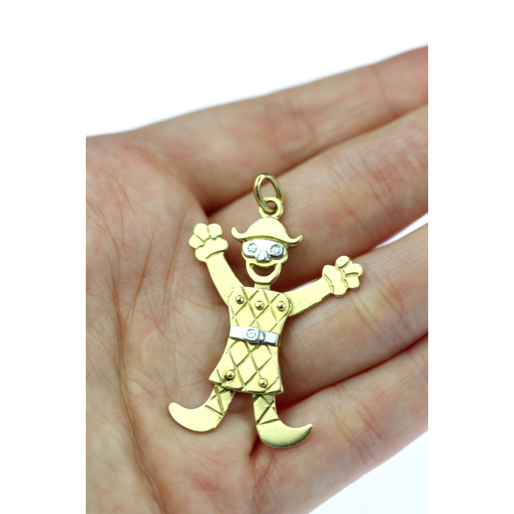 Důmyslně vyrobený přívěsek znázorňující pierota, který má pohyblivé ruce, nohy i hlavu. Řetízek i přívěsek je vyroben ze žlutého 18karátového zlata, pásek a oči figurky zdobí přírodní diamanty 2x 0,03ct a 1x 0,02ct, barvy G a čistoty VS.