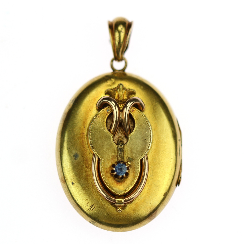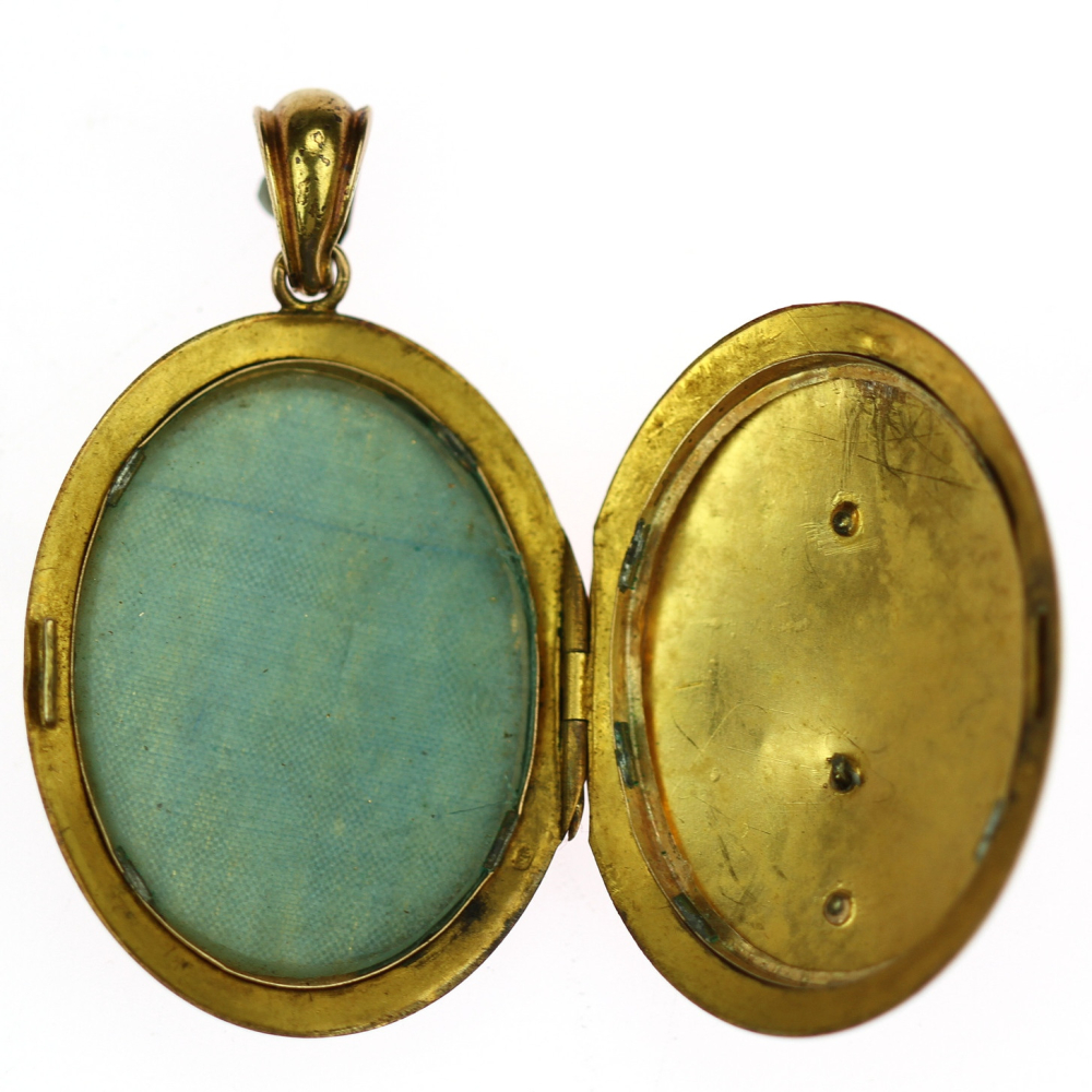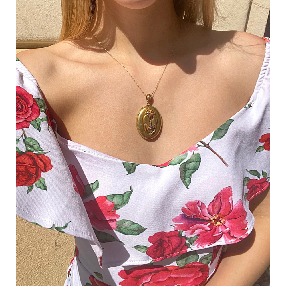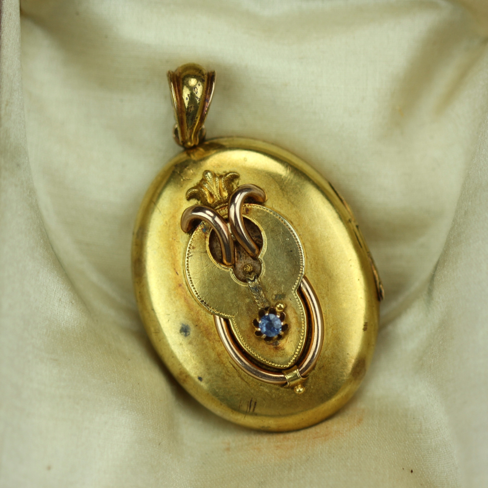 Oválný medailon z poslední čtvrtiny 19. století s místem puncování ve Vídni. Materiálem je růžové 14karátové zlato (o ryzosti 580/1000), které je navíc silně zlaceno žlutým zlatem. Na předním plášti se nachází aplika iniciály "A", která je vykládaná (spolu s očkem) 19 přírodními diamanty routového brusu. Uvnitř medailonu je místo na dvě fotografie...