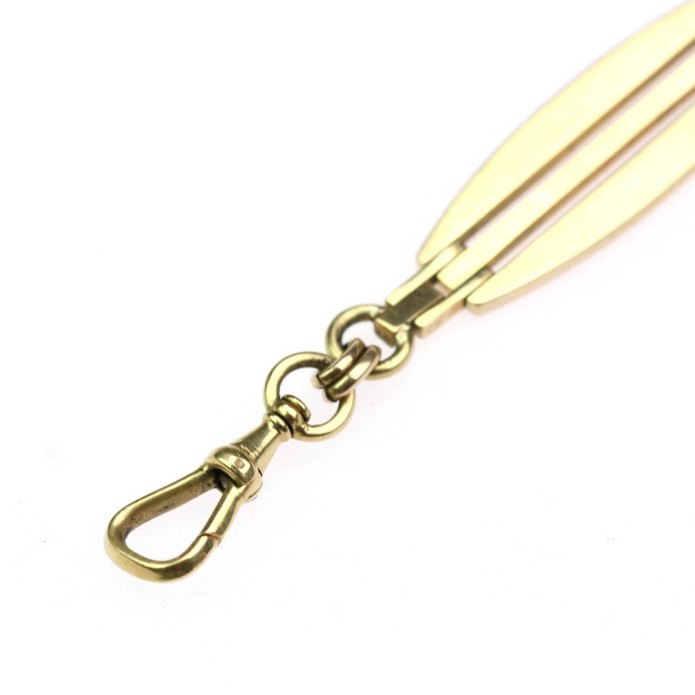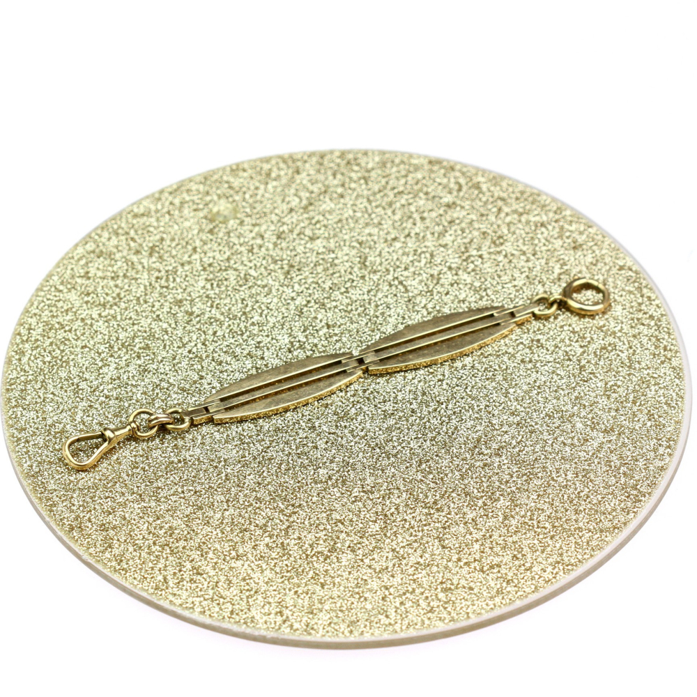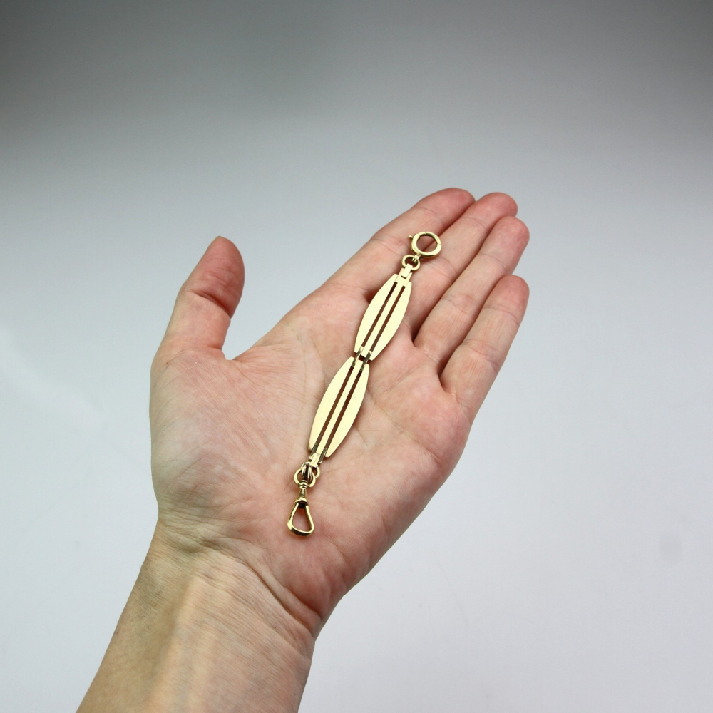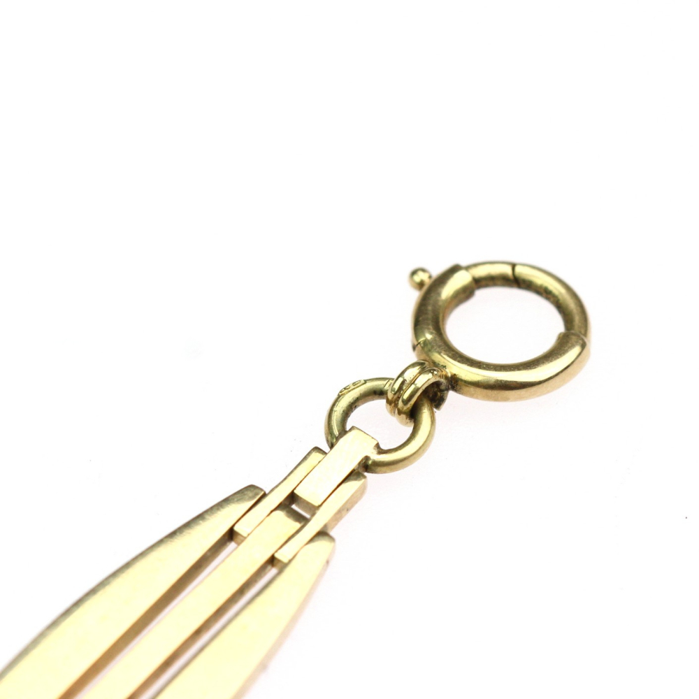 152 cm dlouhý řetěz, šatlén, zhotovený ze žlutého 14karátového zlata. Posuvný jezdec na řetězu v secesním designu je zdobený dvěma zelenými sklíčky imitujícími drahé kameny. Předmět je značen rakousko-uherským puncem "lišky" a písmenem "C" (puncováno v Praze). Jedná se o krásnou umělecko-řemeslnou ruční práci.