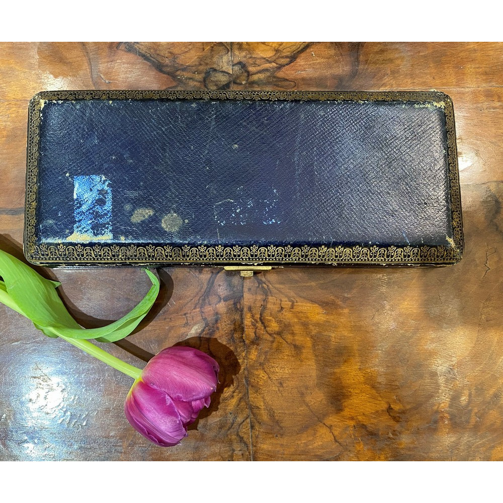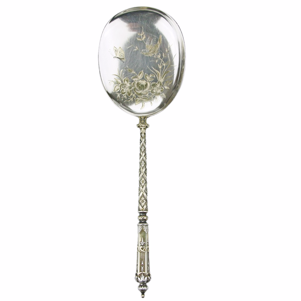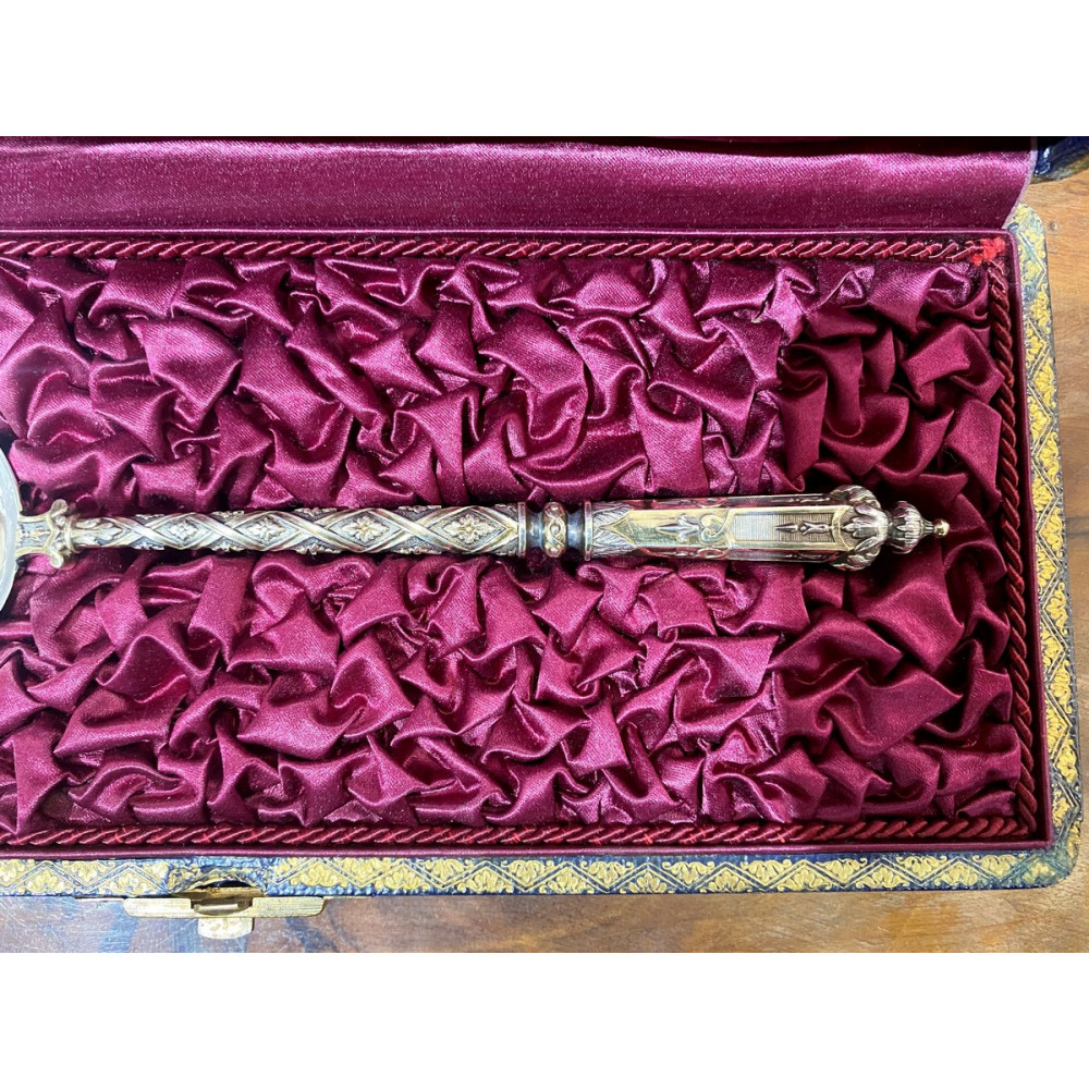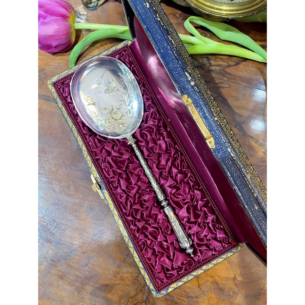 Bohatě zdobená stříbrná lžíce na servírování zmrzliny v původní etuji. Materiálem je stříbro, na rukojeti s dekorativním reliéfem a na listu gravírováno s námětem květin, ptáčka a motýlka. V detailech a ze zadní strany zlaceno. Předmět pochází z pařížské stříbrnické dílny Henriho Gaberta, která byla aktivní mezi lety 1882-1901.