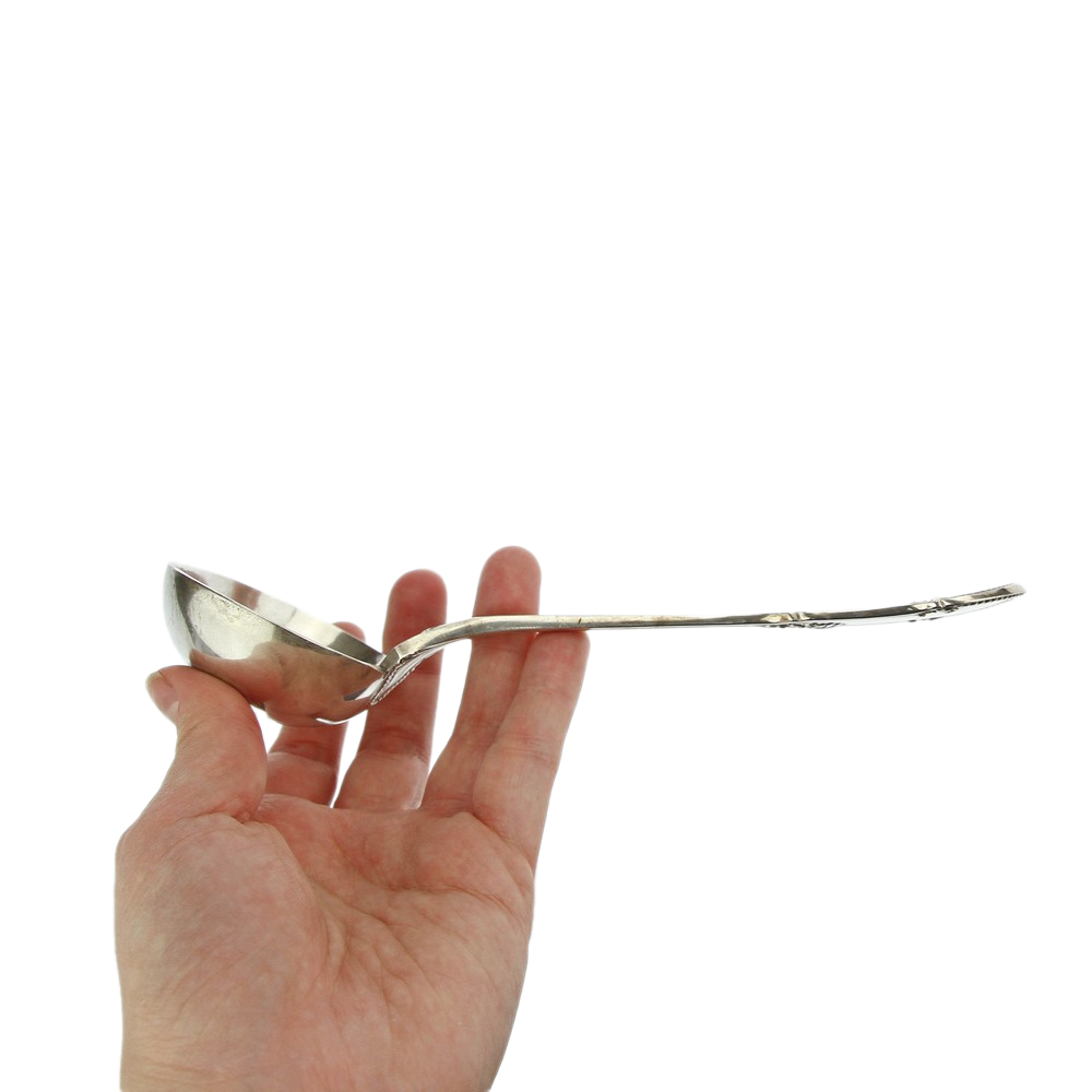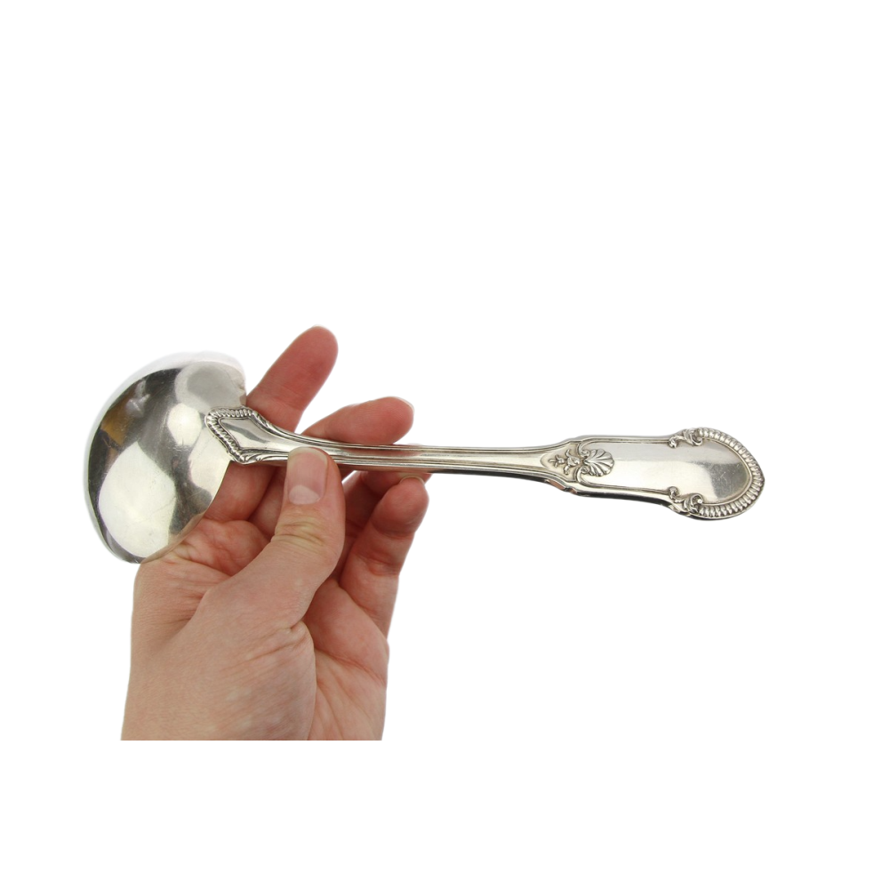 Servírovací naběračka na omáčky vyrobená v empírovém stylu v polovině 20. století slavnou bruselskou stříbrnickou firmou Delheid Frères. Materiálem je stříbro o ryzosti 800/1000. Ryzost kovu potvrzuje osvědčení z Puncovního úřadu. Povrchovou patinu na požádání rádi vyčistíme.