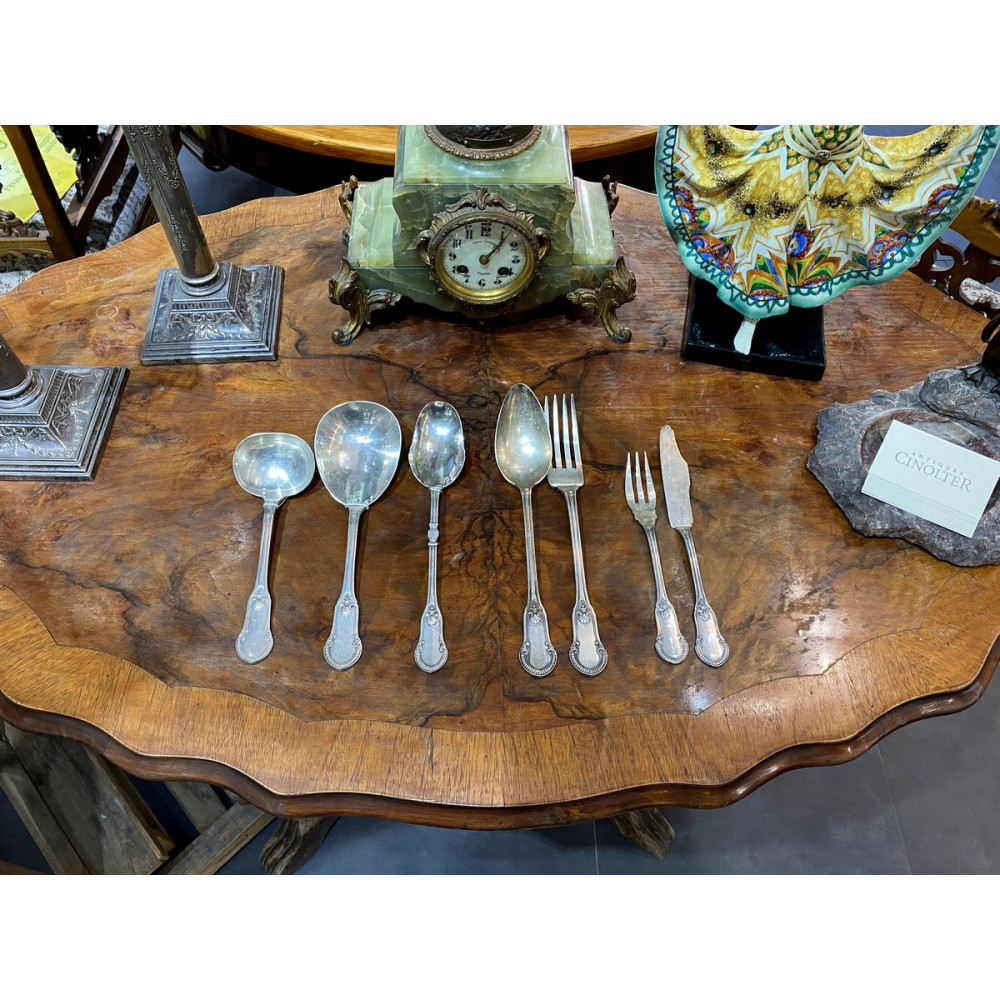 Servírovací lžíce a vidlička vyrobené v empírovém stylu v polovině 20. století slavnou bruselskou stříbrnickou firmou Delheid Frères. Materiálem je stříbro o ryzosti 800/1000. Ryzost kovu potvrzuje osvědčení z Puncovního úřadu. Povrchovou patinu na požádání rádi vyčistíme.