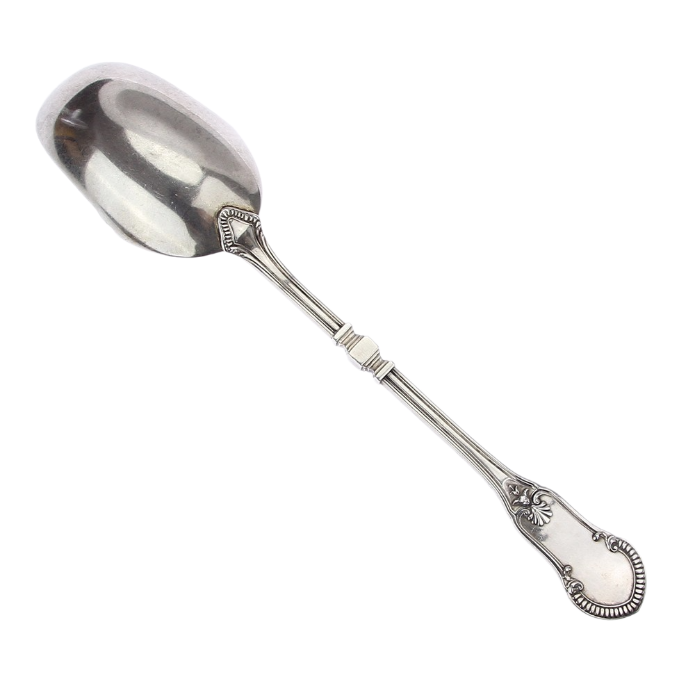 Servírovací lžíce vyrobená v empírovém stylu v polovině 20. století slavnou bruselskou stříbrnickou firmou Delheid Frères. Materiálem je stříbro o ryzosti 800/1000. Ryzost kovu potvrzuje osvědčení z Puncovního úřadu. Povrchovou patinu na požádání rádi vyčistíme.