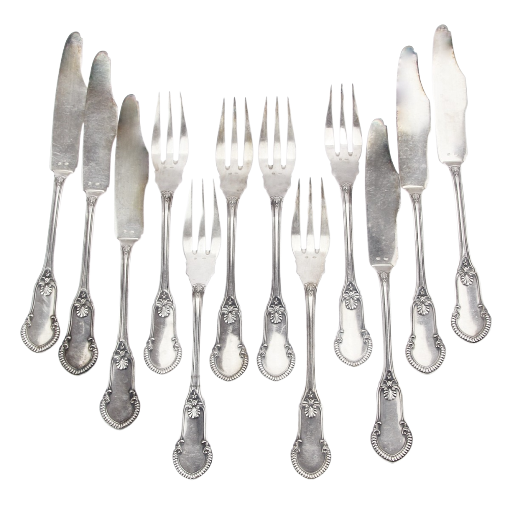 Příbory na ryby pro 6 osob vyrobené v empírovém stylu v polovině 20. století slavnou bruselskou stříbrnickou firmou Delheid Frères. Materiálem je stříbro o ryzosti 835/1000. Ryzost kovu potvrzuje osvědčení z Puncovního úřadu. Povrchovou patinu na požádání rádi vyčistíme.