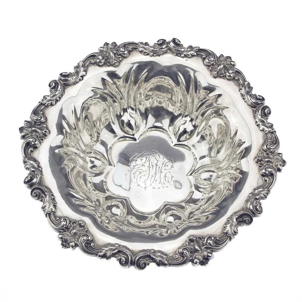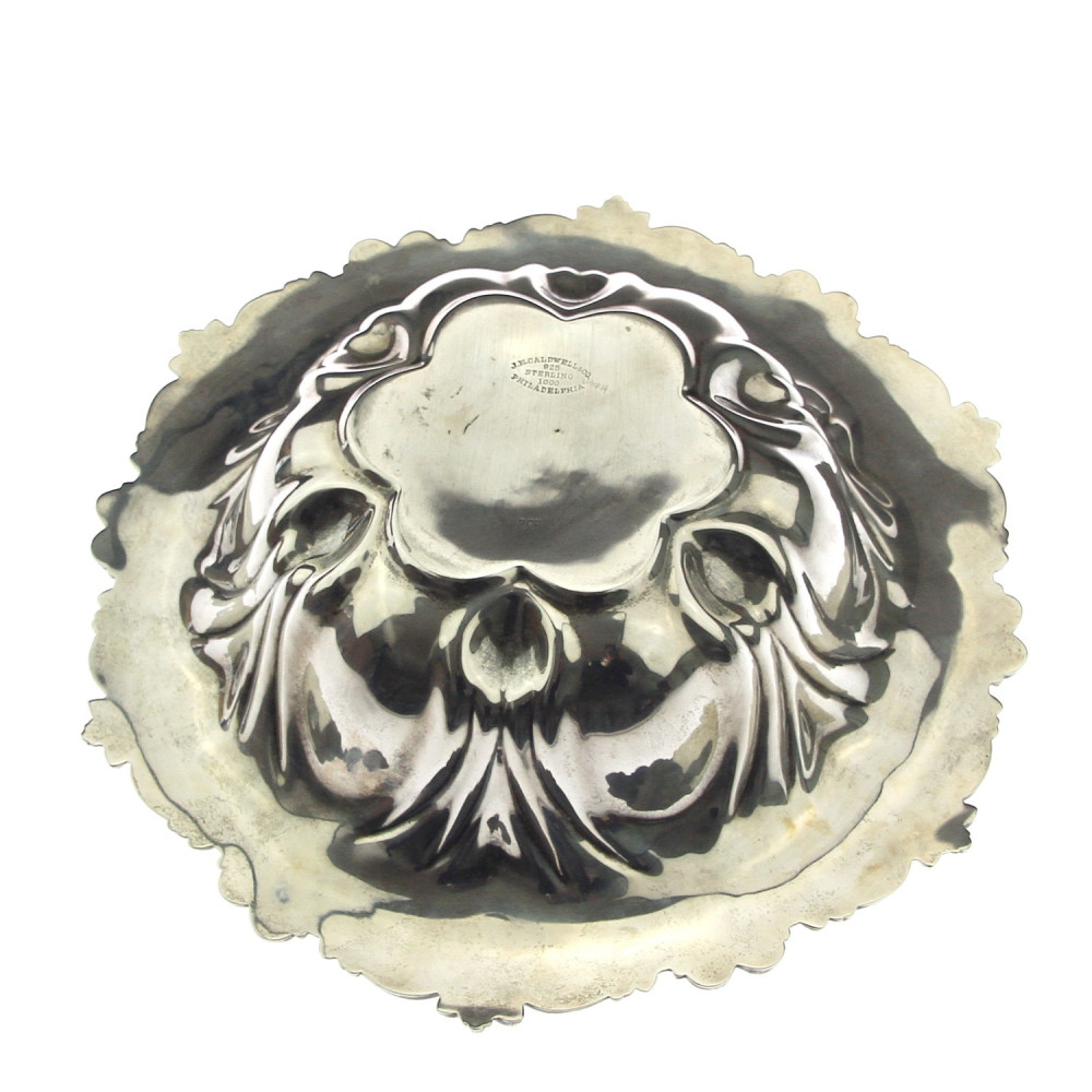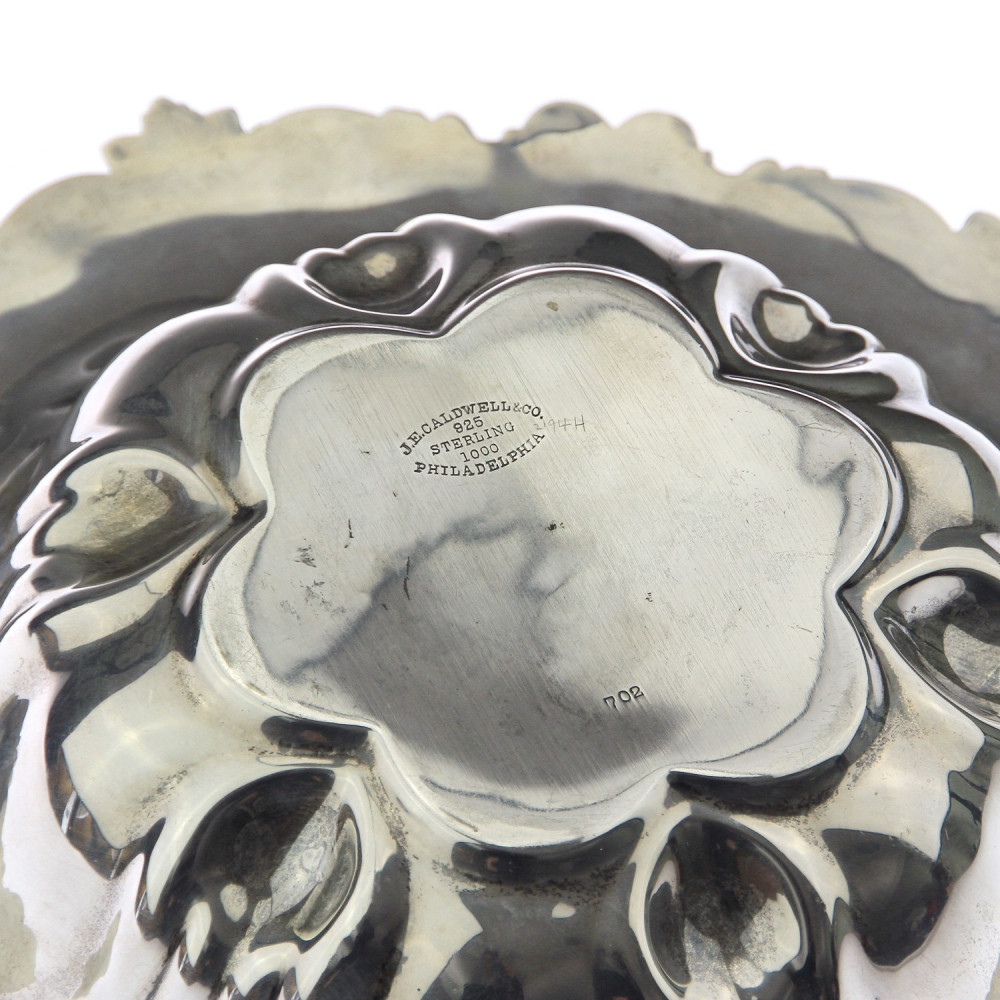 Stříbná mísa s květinově vytvarovaným tělem a okrajem lemovaným plastickými dubovými listy a žaludy. Nádoba je označena výrobní značkou společnosti J. E. Caldwell Co. Na dně nádoby je vyryt monogram, patrně iniciály původního majitele.