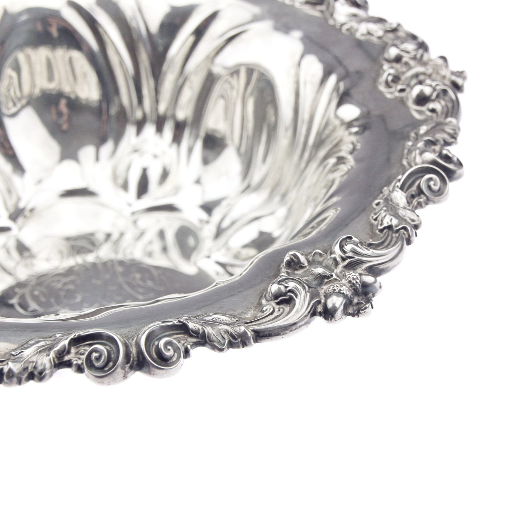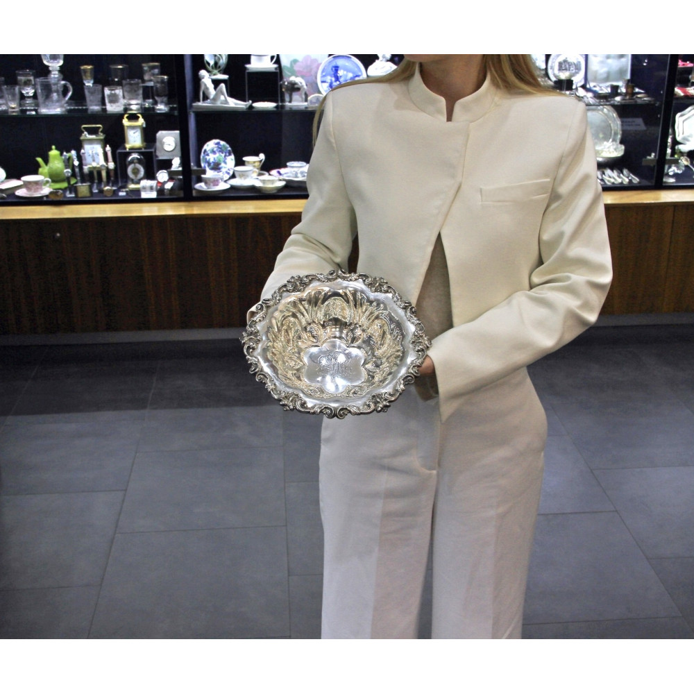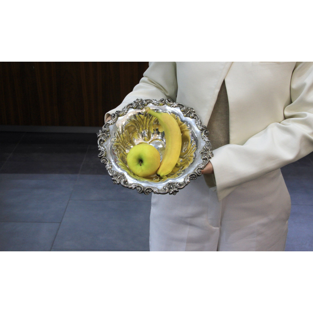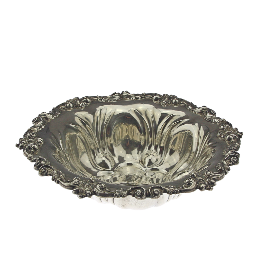 Stříbná mísa s květinově vytvarovaným tělem a okrajem lemovaným plastickými dubovými listy a žaludy. Nádoba je označena výrobní značkou společnosti J. E. Caldwell Co. Na dně nádoby je vyryt monogram, patrně iniciály původního majitele.