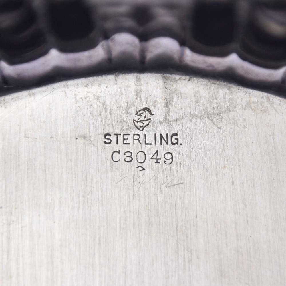 Kruhová bohatě zdobená mísa vyrobená na počátku 20. století v Americe. Mísa je dutá, vyrobená z dvojitého masivního stříbrného plechu. Značeno kaligraficky ztvárněným monogramem "GRW"(?). K předmětu je přiloženo osvědčení z Puncovního úřadu. Punc výrobce je v tomto případě méně čitelný.