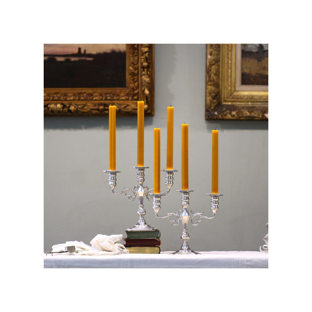 Set dvou svícnů vyrobených ze stříbra kvality sterling (Ag 925/1000) s odnímatelnými "mističkami'", do kterých se umisťuje svíčka. Výrobcem byla zřejmě newyorská stříbrnická společnost Hamilton Silver Co. Inc. činná od roku 1930. Pro zvýšení stability je předmět částečně plněn.