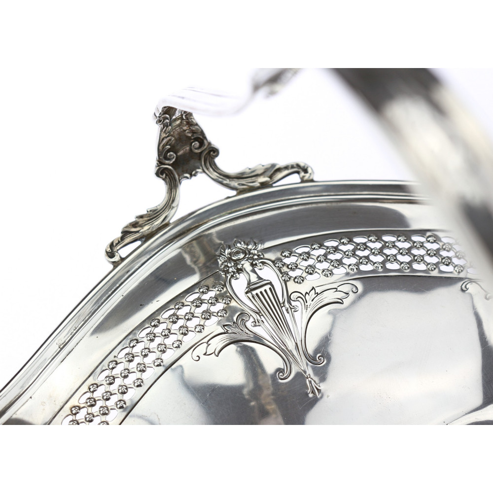 Košíček zhotovený ze stříbra vyšší ryzosti (Ag 925/1000) s dekorativním perforovaným pásem po obvodu, doplněným secesním dekorem v podobě váz s květinami a akantovými listy. Na uchu má vygravírovaný monogram "MTP". Košíček byl vyrobený v USA ve 20. - 40. letech 20. století společností International.
