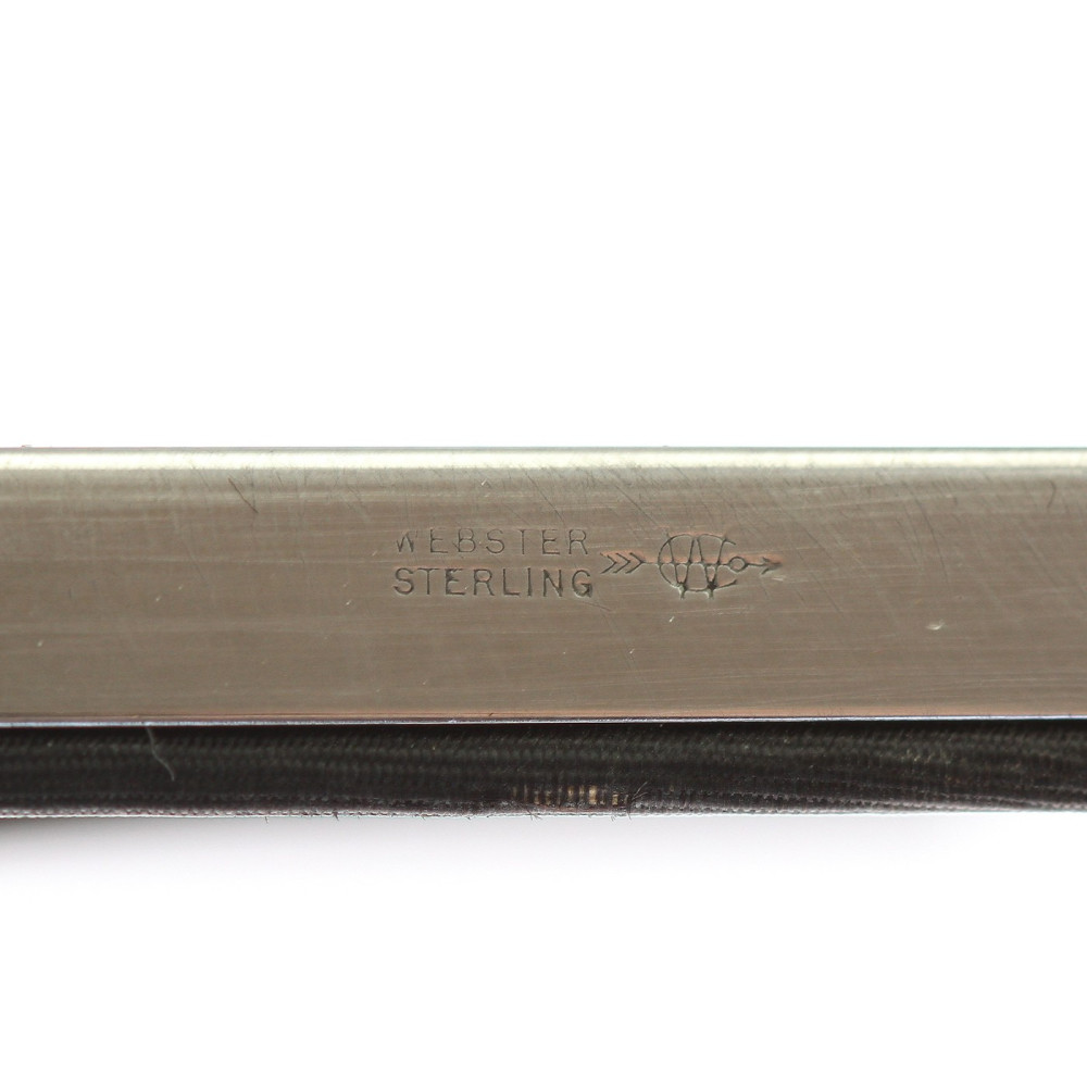 Středně velký hladký rámeček ze stříbra se zadní stranou potaženou hnědou látkou. Značeno Webster Sterling (společnost založena v USA roku 1869), logem firmy a českým puncem pro stříbro 925/1000.