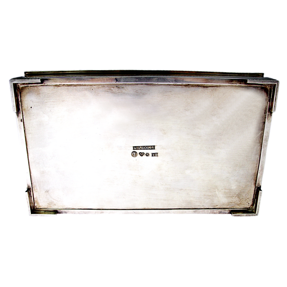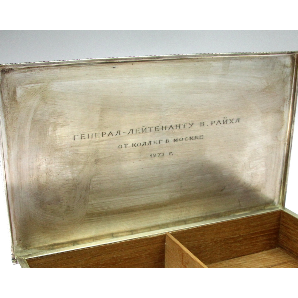 Bytelná krabička ze stříbra s dřevěnou výstelkou vyrobená firmou W. A. Bolin, jednou z nejstarších stříbrnických společností ve Švédsku (založenou r. 1796) fungující dodnes. Věnování na víčku v azbuce: "Generálu V. Raichlovi od kolegů v Moskvě, 1973".