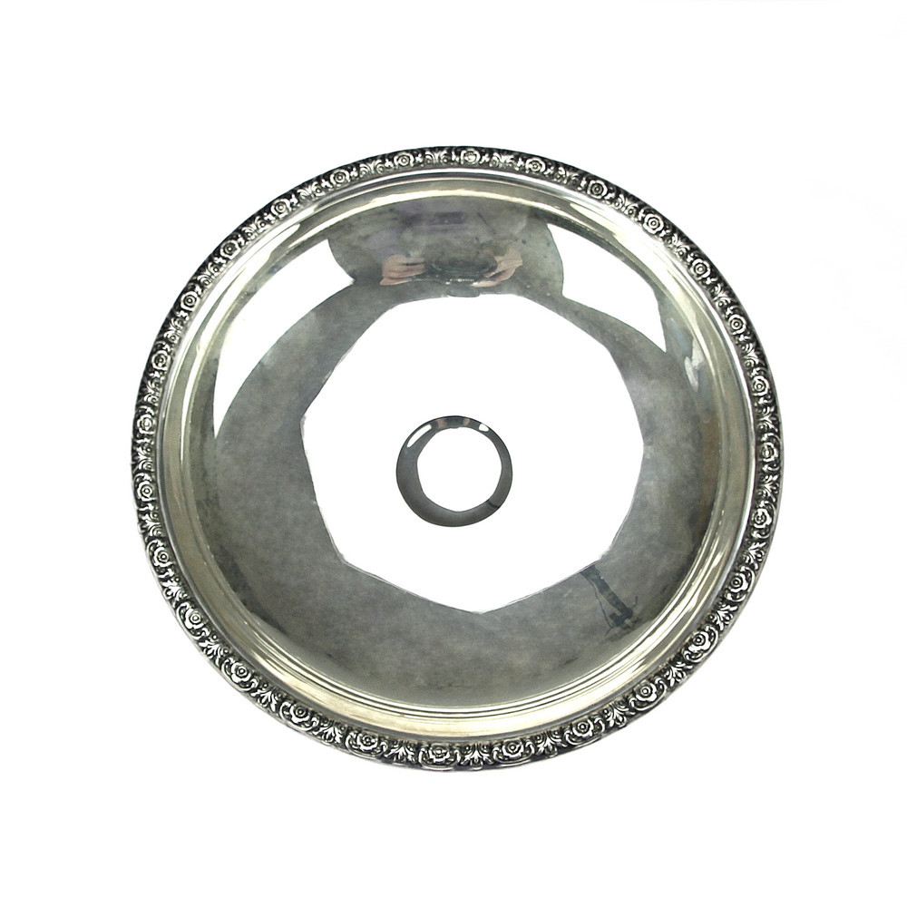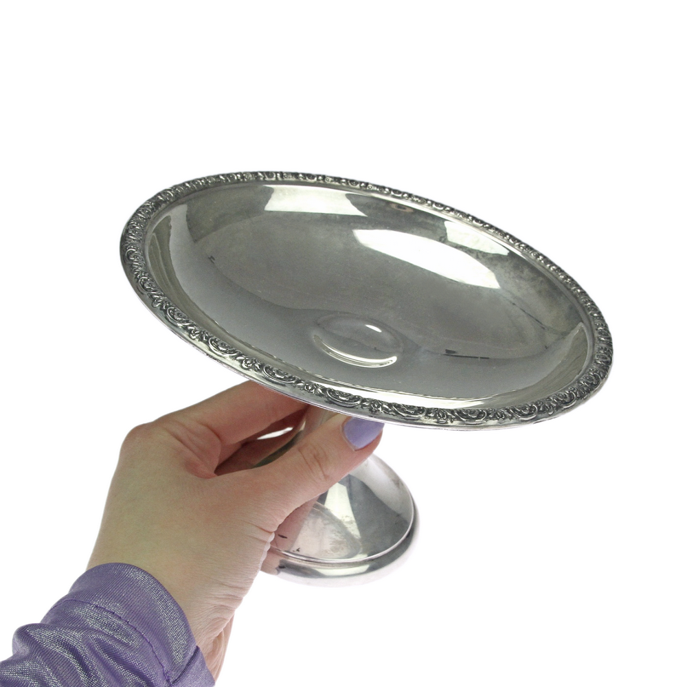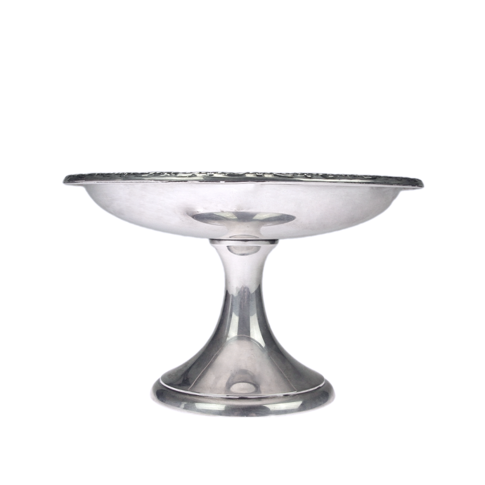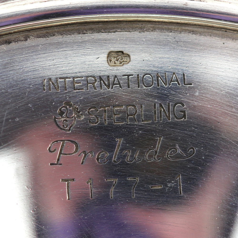 Kulatá miska na nožce (nástolec) na bonbony od americké stříbrnické firmy International se vzorem zvaným Prelude, patentovaným touto firmou v roce 1939. Na okrajích je zdobená květinovým motivem. Vyrobeno ze stříbra vyšší ryzosti (Ag 925/1000).