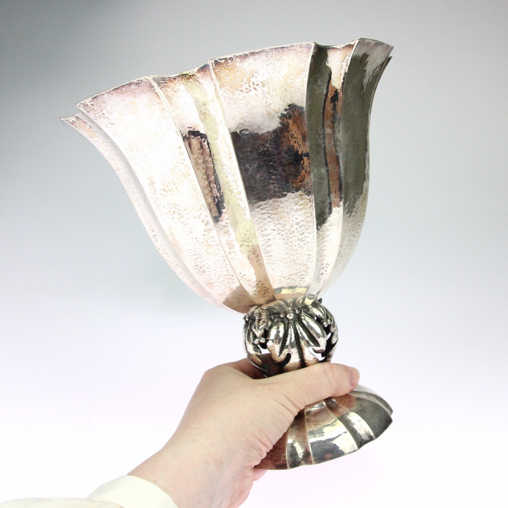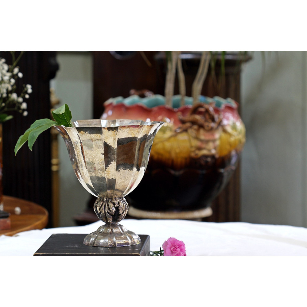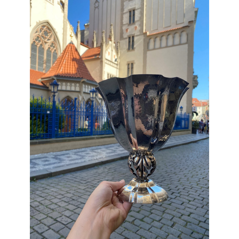 Velká stříbrná váza vyrobená ve stylu "Jugendstil" v Německu. Váza je ručně dotepávaná, zaoblená nožka je dutá, tvořená pouze palmovými listy.