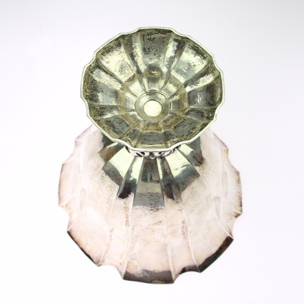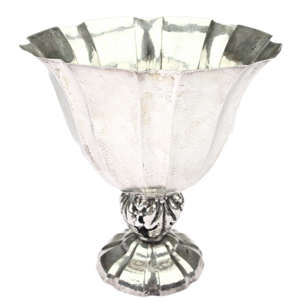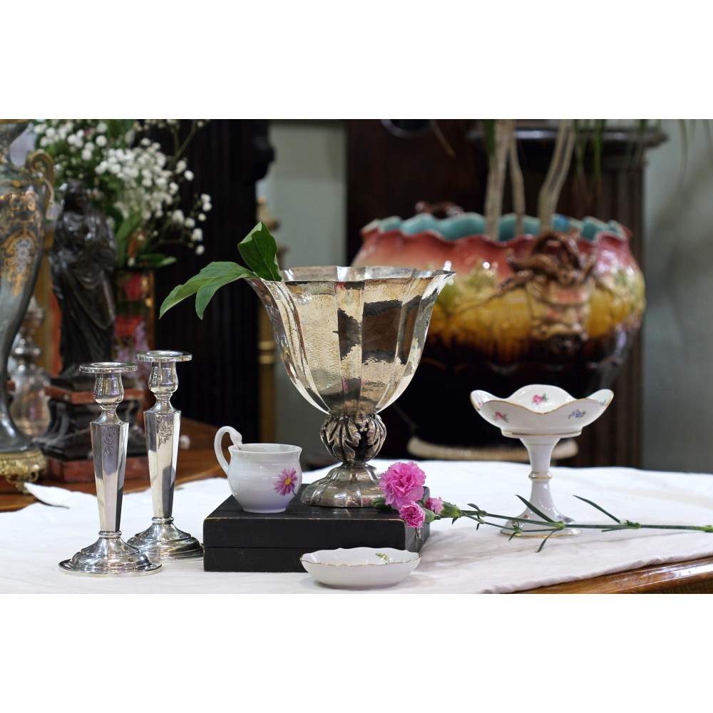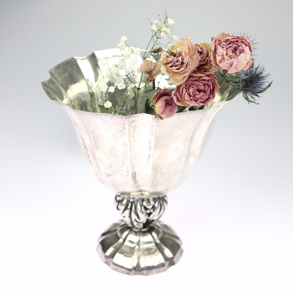 Velká stříbrná váza vyrobená ve stylu "Jugendstil" v Německu. Váza je ručně dotepávaná, zaoblená nožka je dutá, tvořená pouze palmovými listy.