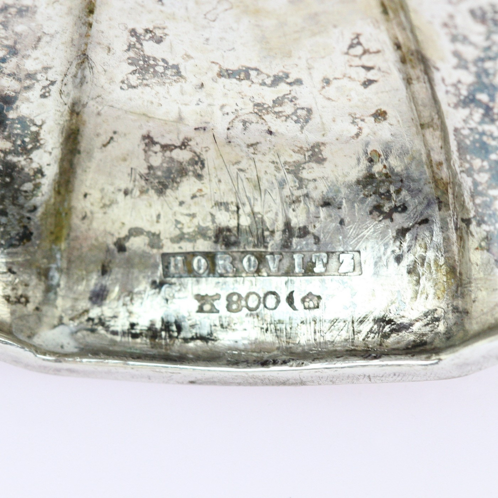 Zespodu značeno výrobcem "Horovitz" a německými puncy pro Ag 800/1000. Ryzost potvrzuje osvědčení Puncovního úřadu.