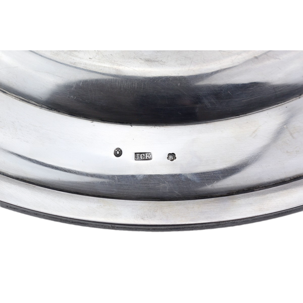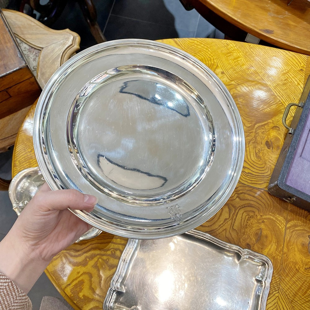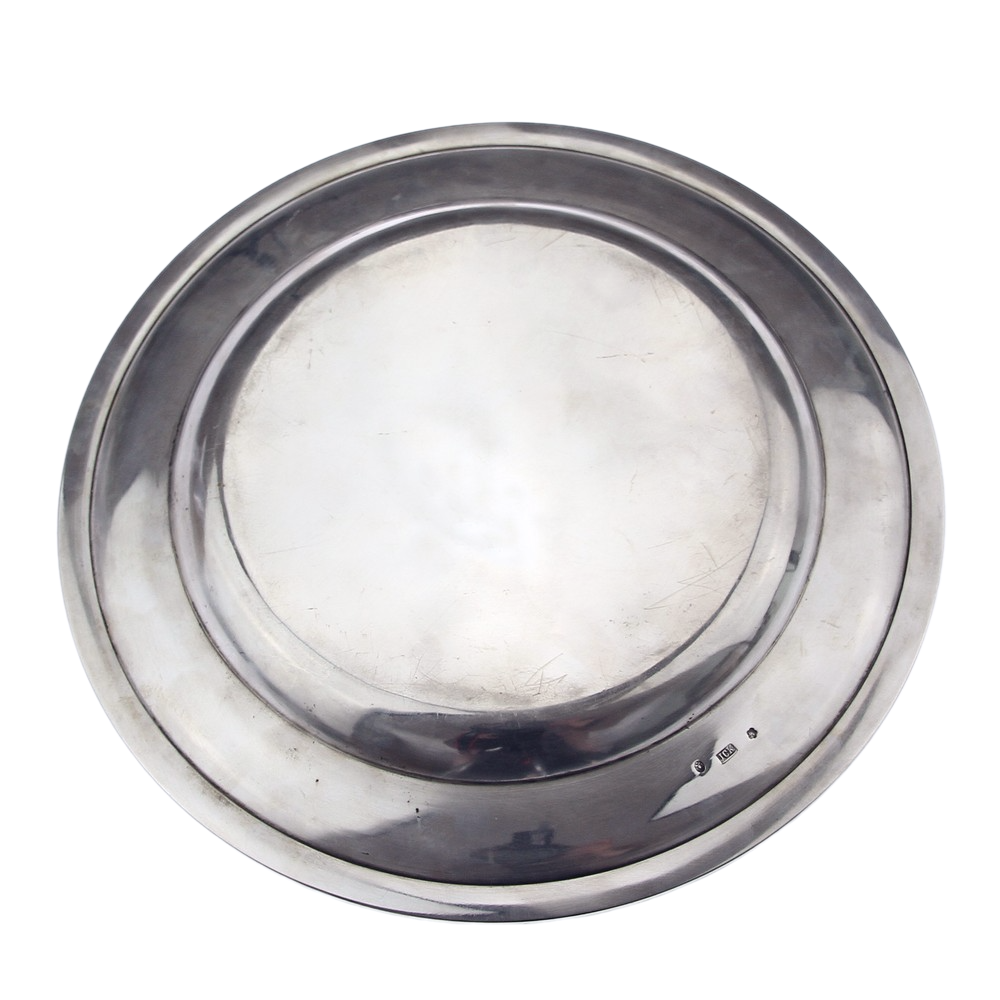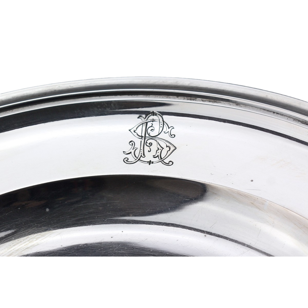 Hladký talíř vyrobený z masivního stříbra o ryzosti 800/1000. Široký okraj nese kaligraficky provedenou iniciálu "SR". Značeno rakousko-uherským puncem "Diana" (užívaným od roku 1872), mistrovskou značkou "JCK" - Josef Carl Klinkosch a "císařskou orlicí".